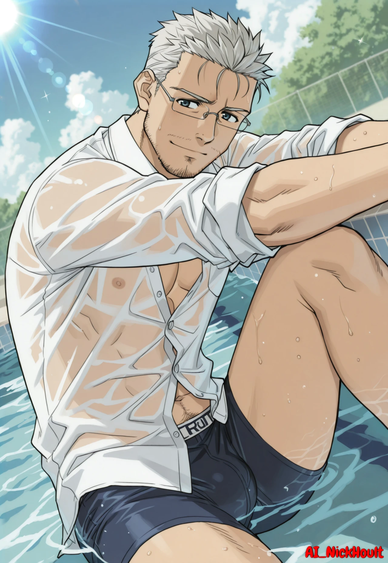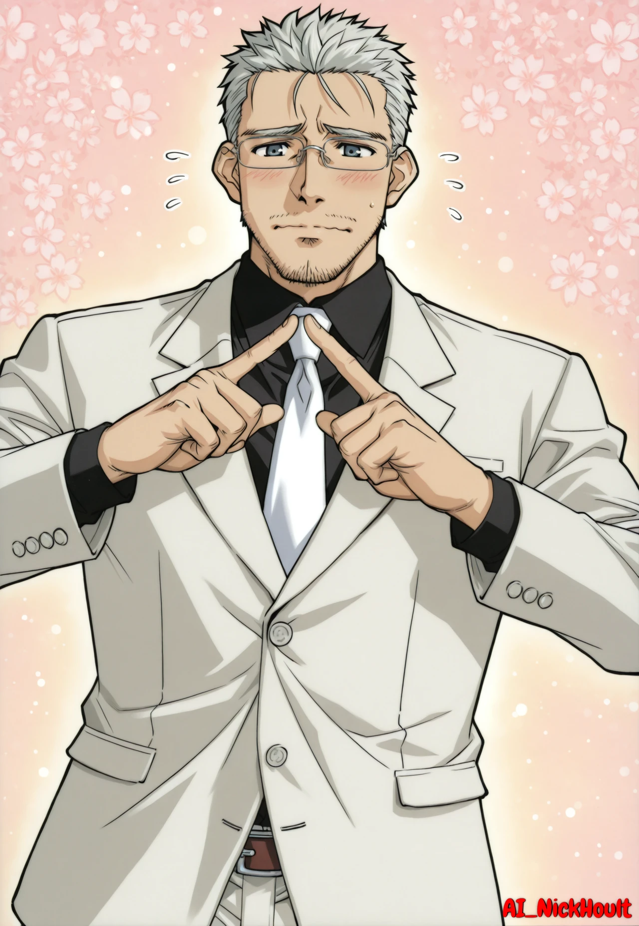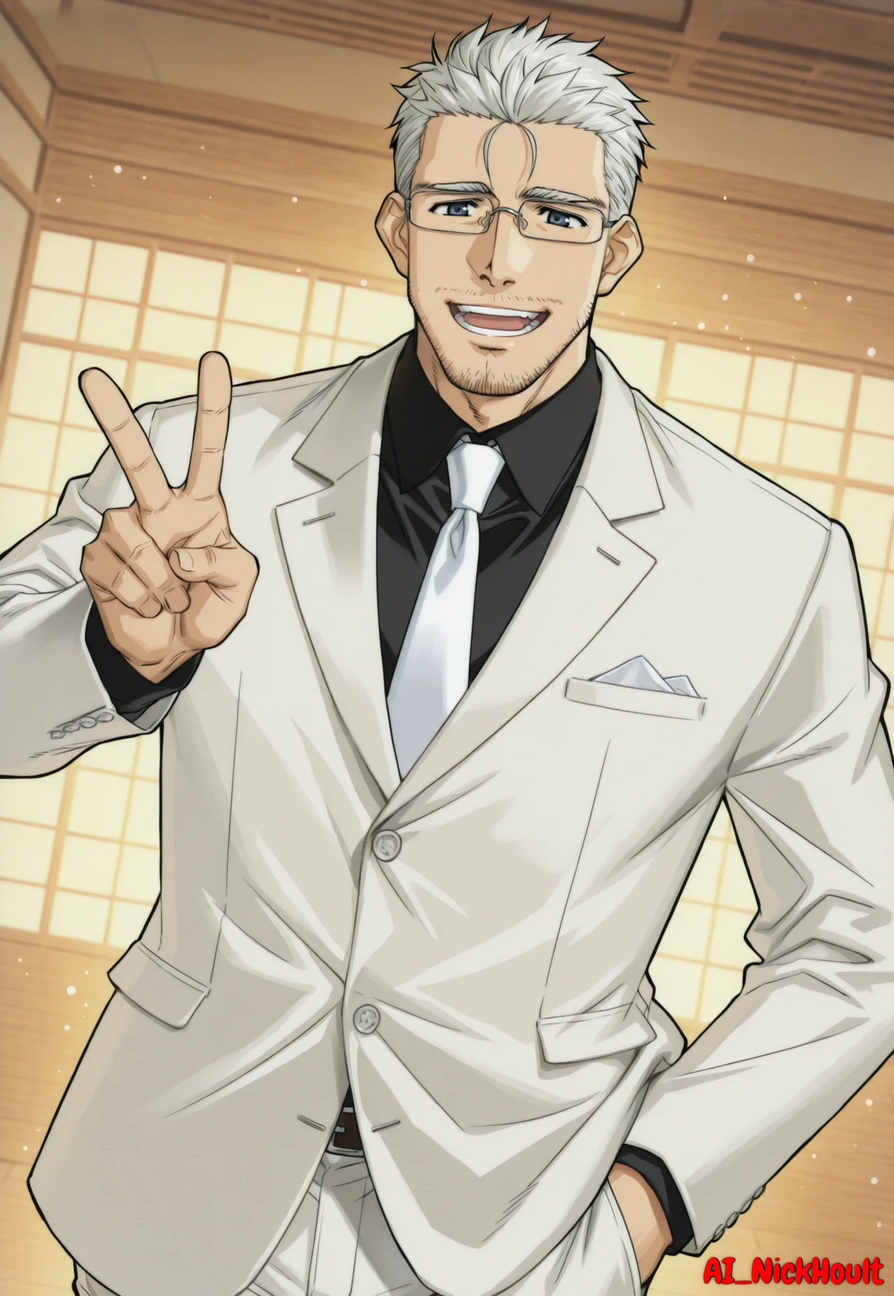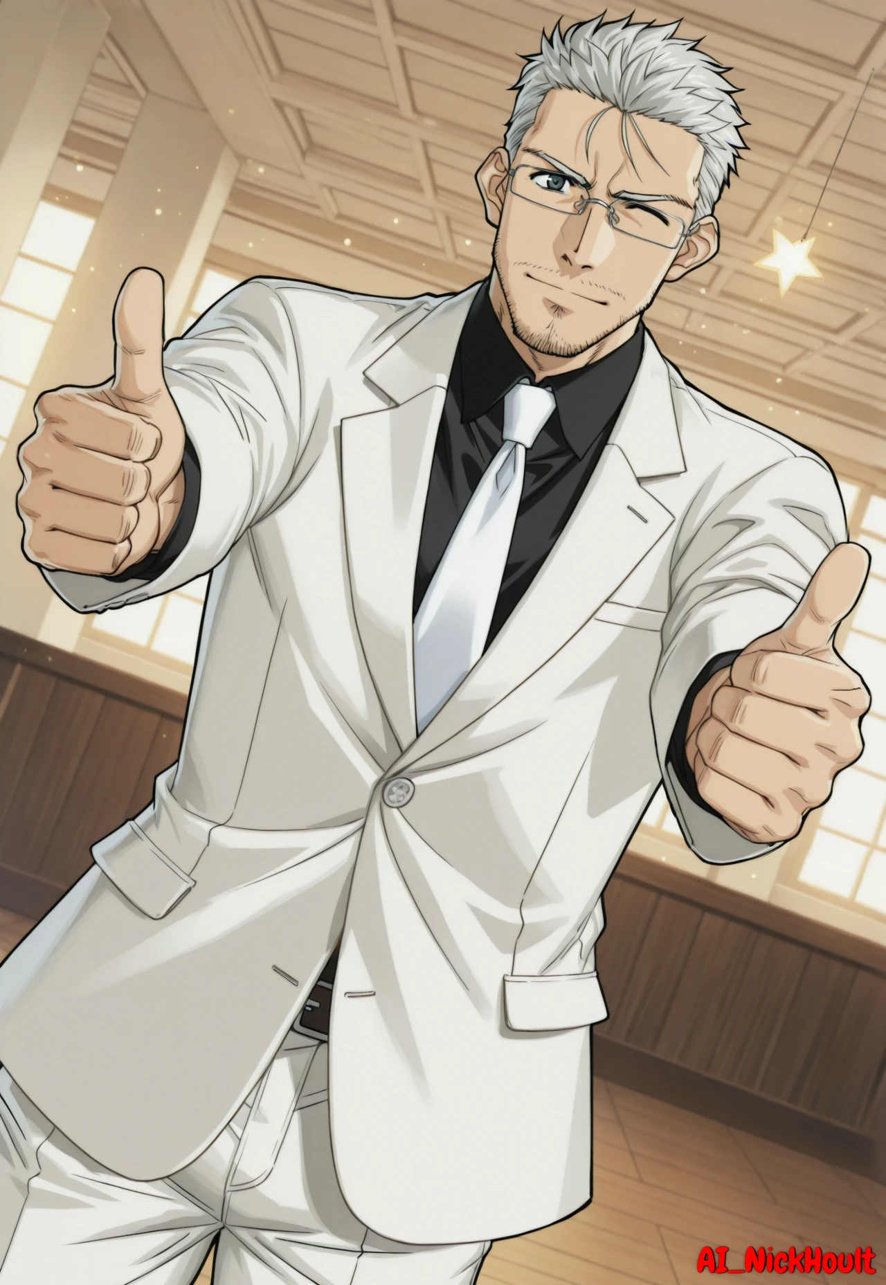 Takamichi, mature male, gray hair, short spiky hair, stubble, dark eyes, rectangular glasses,