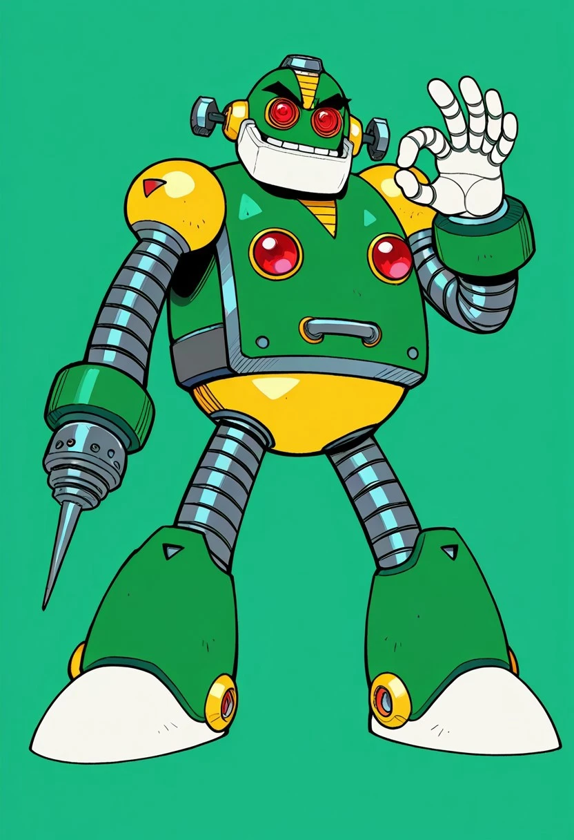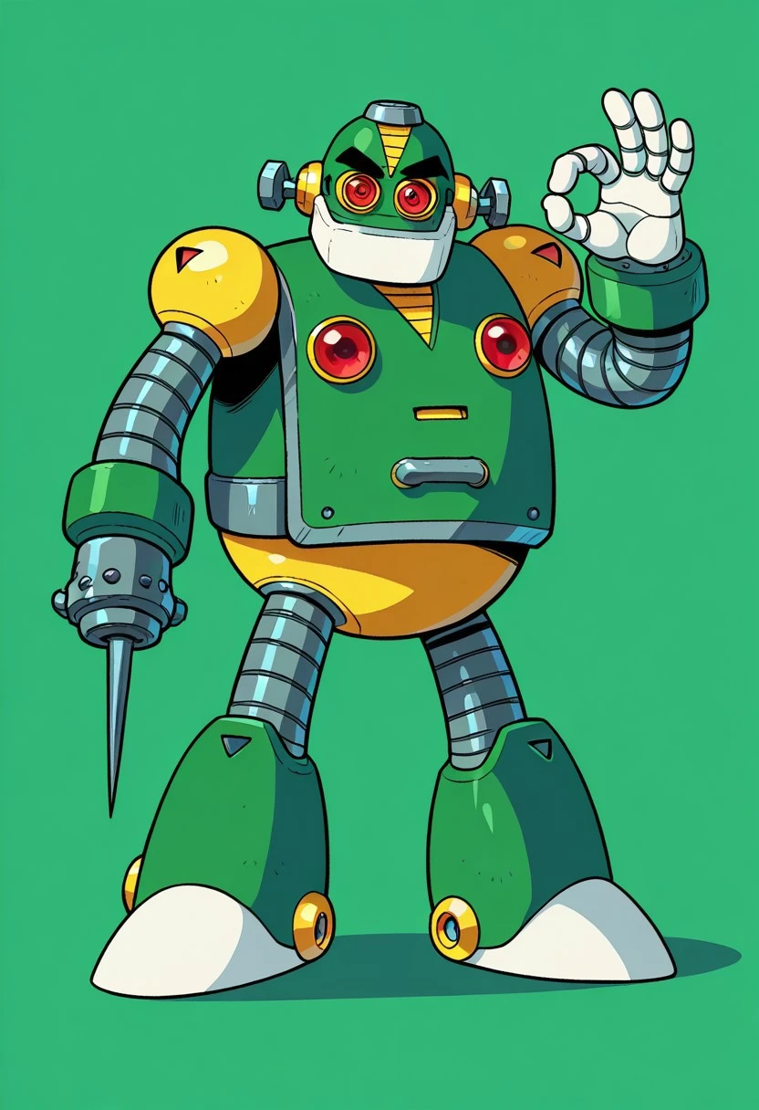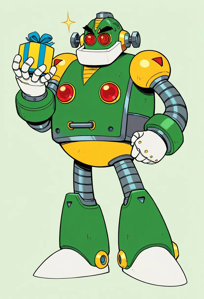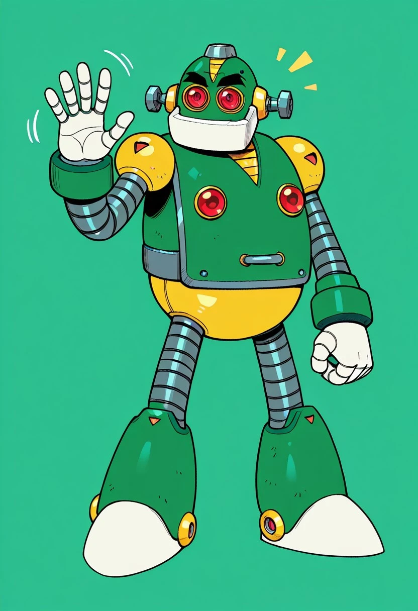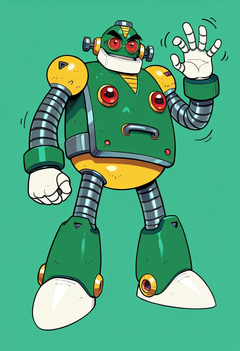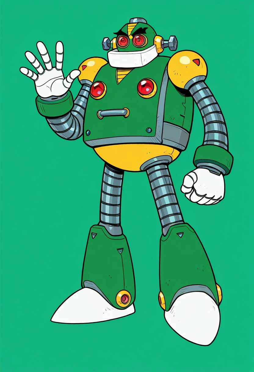 AutoMM,robot,Humanoid robot,male,red eyes,Green body,Black eyebrows,Two white hands
