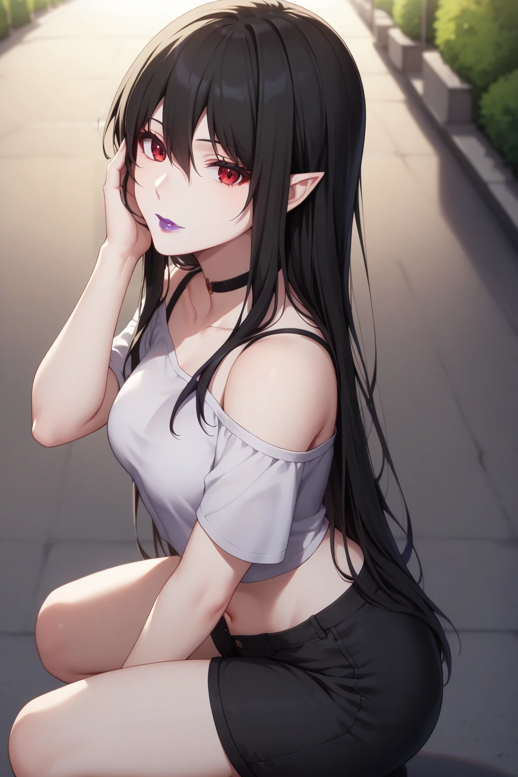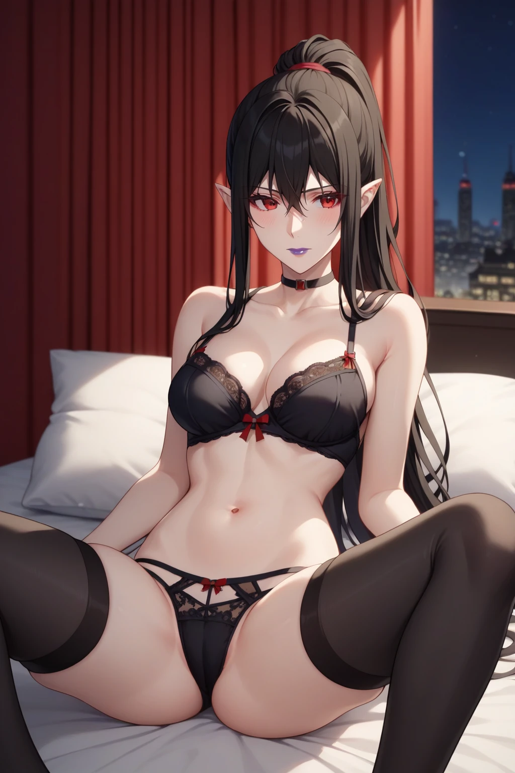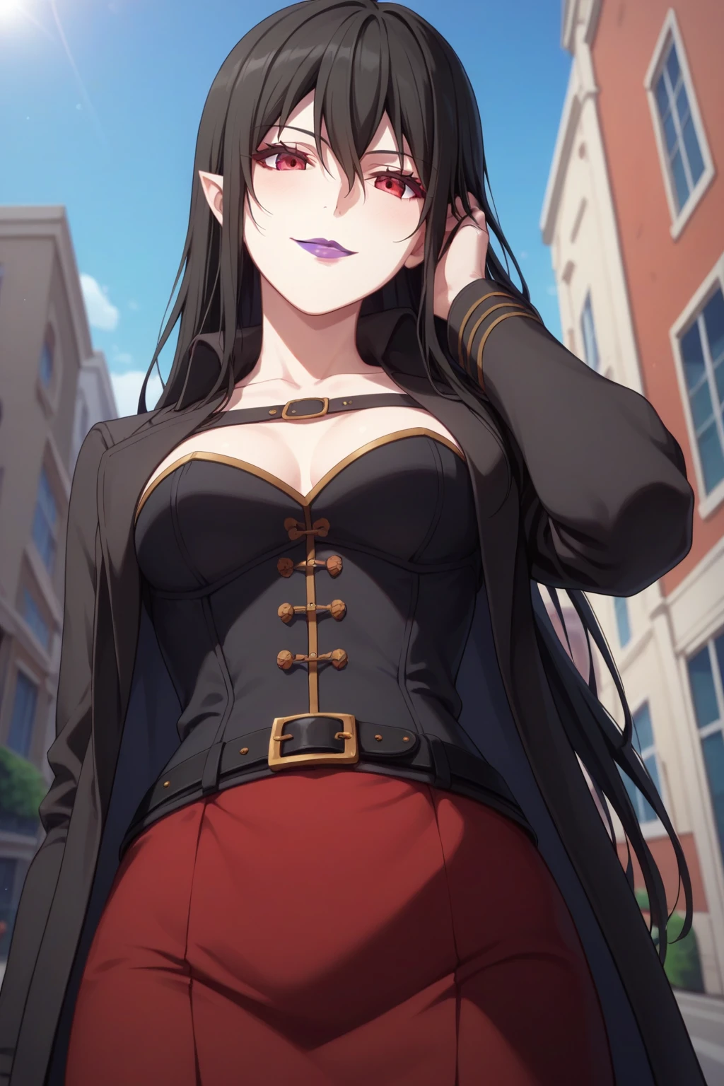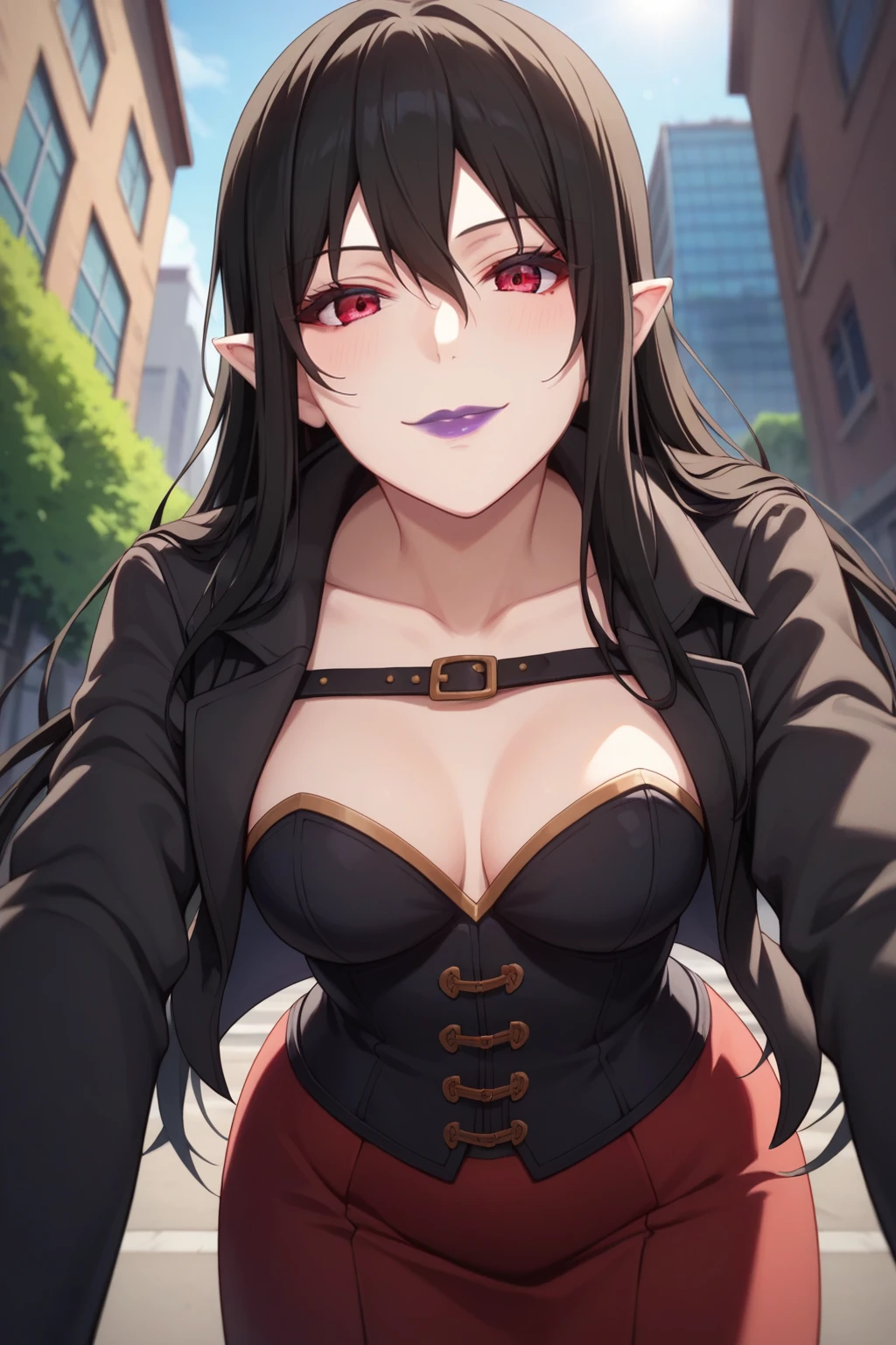 black hair, red eyes, purple lipstick, hair between eyes, long hair, short pointy ears, pale skin,