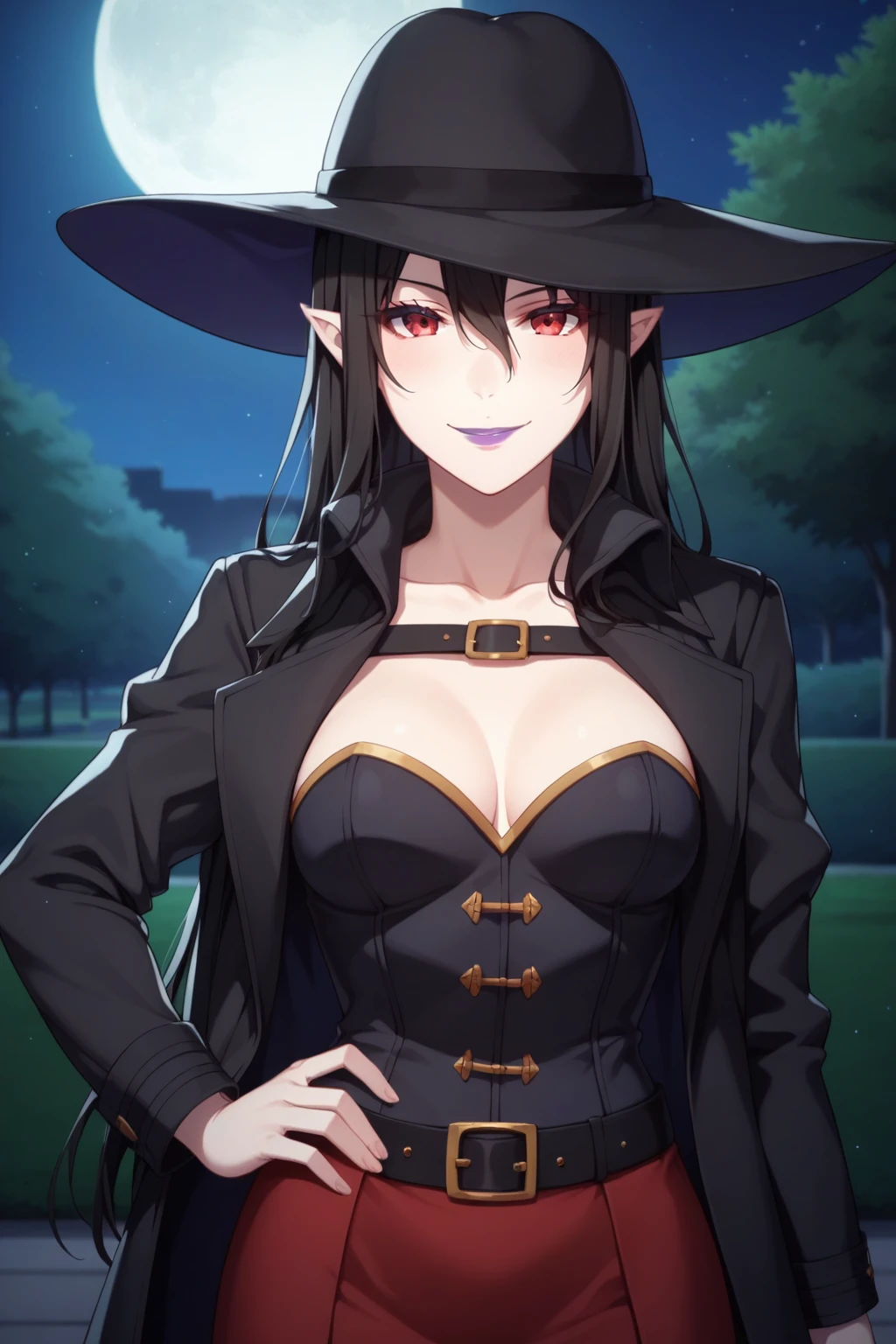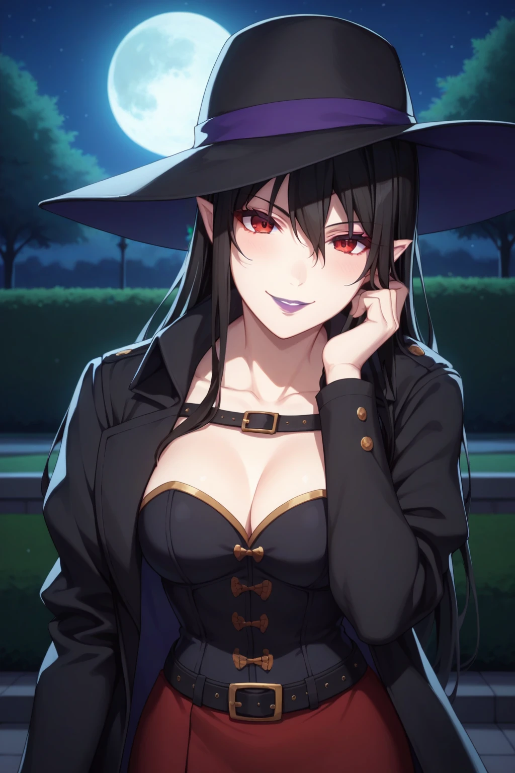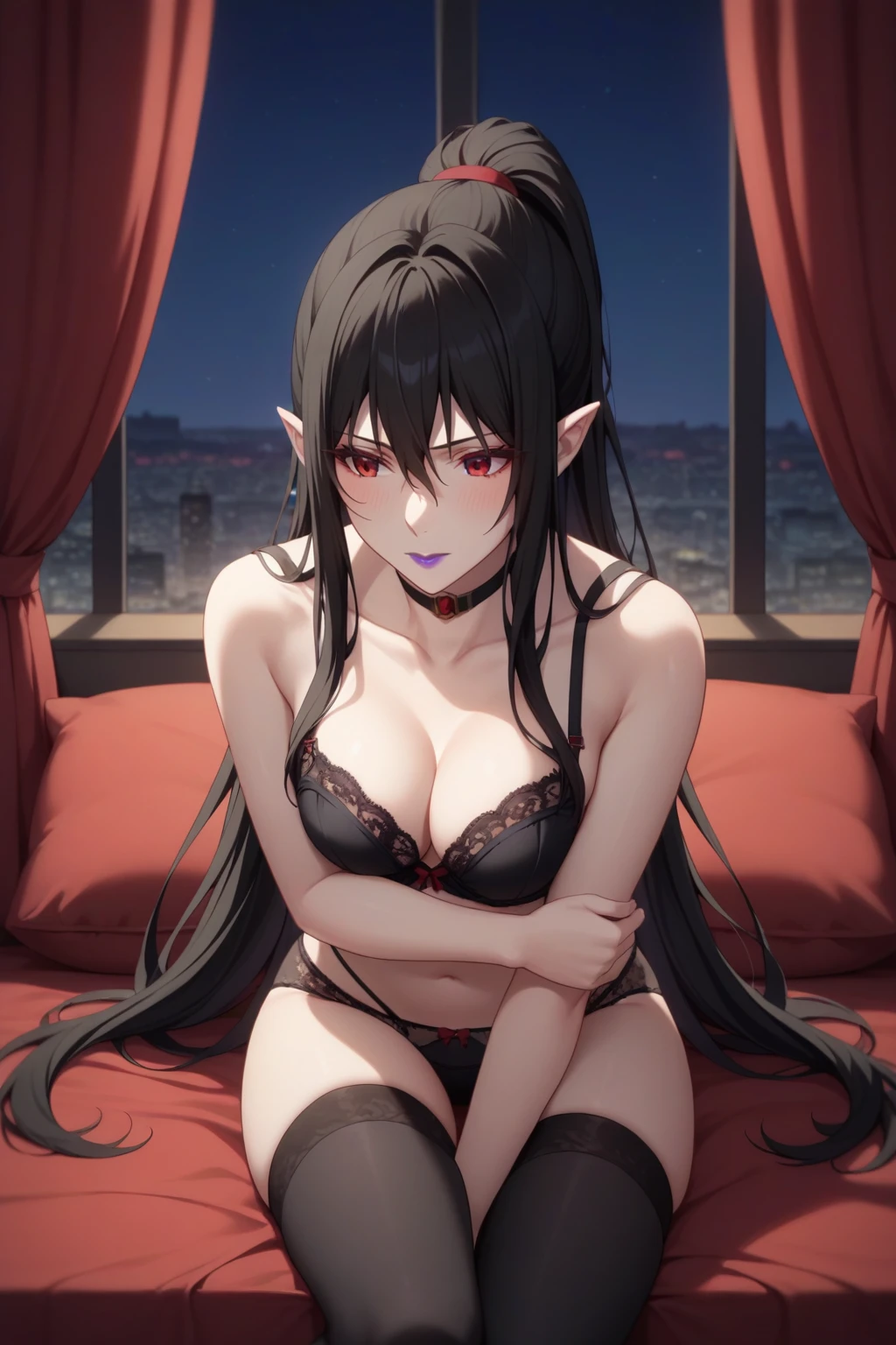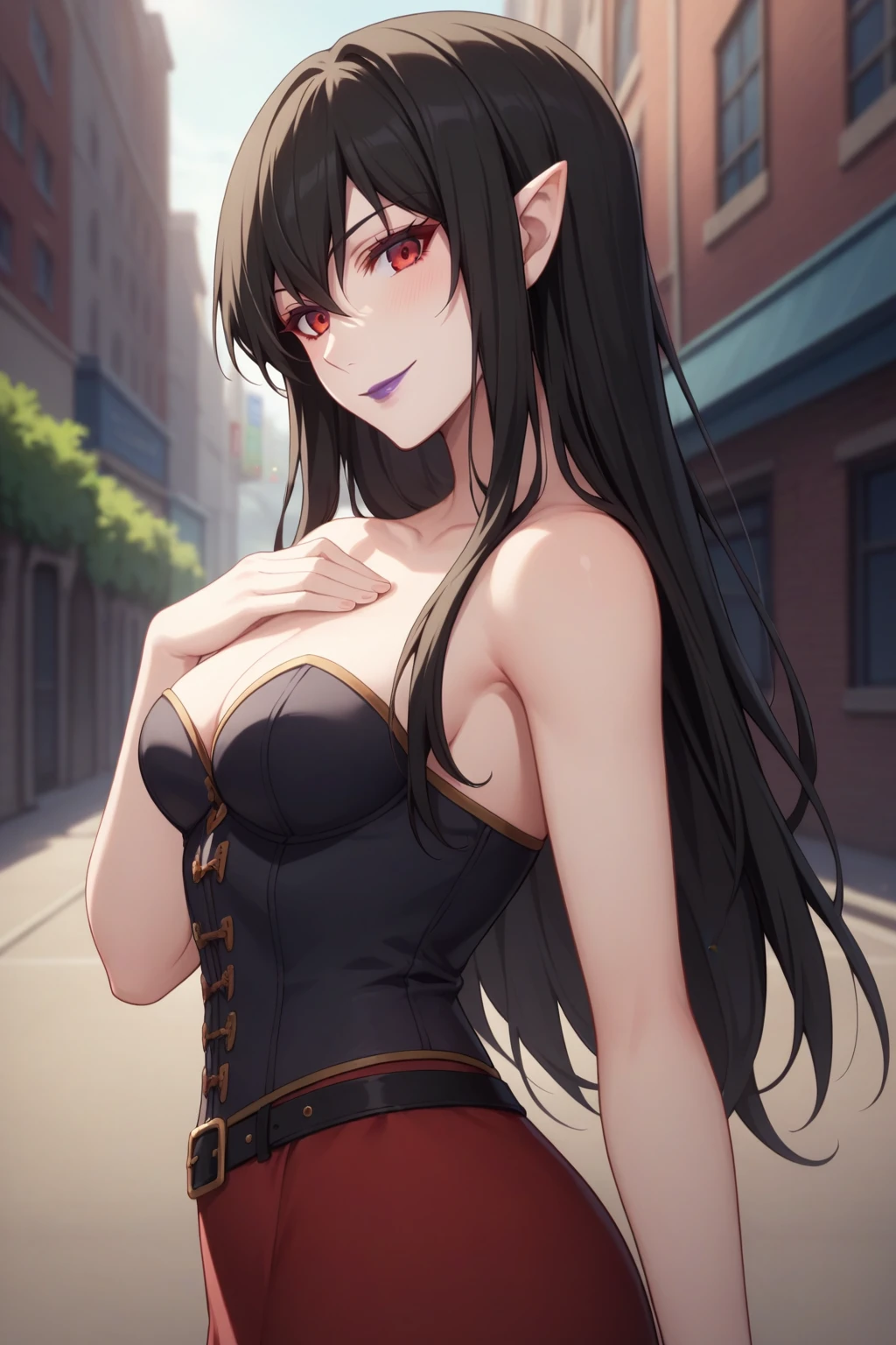 black hair, red eyes, purple lipstick, hair between eyes, long hair, short pointy ears, pale skin,