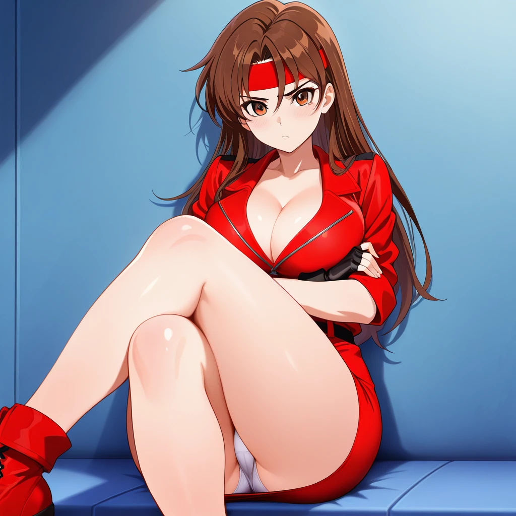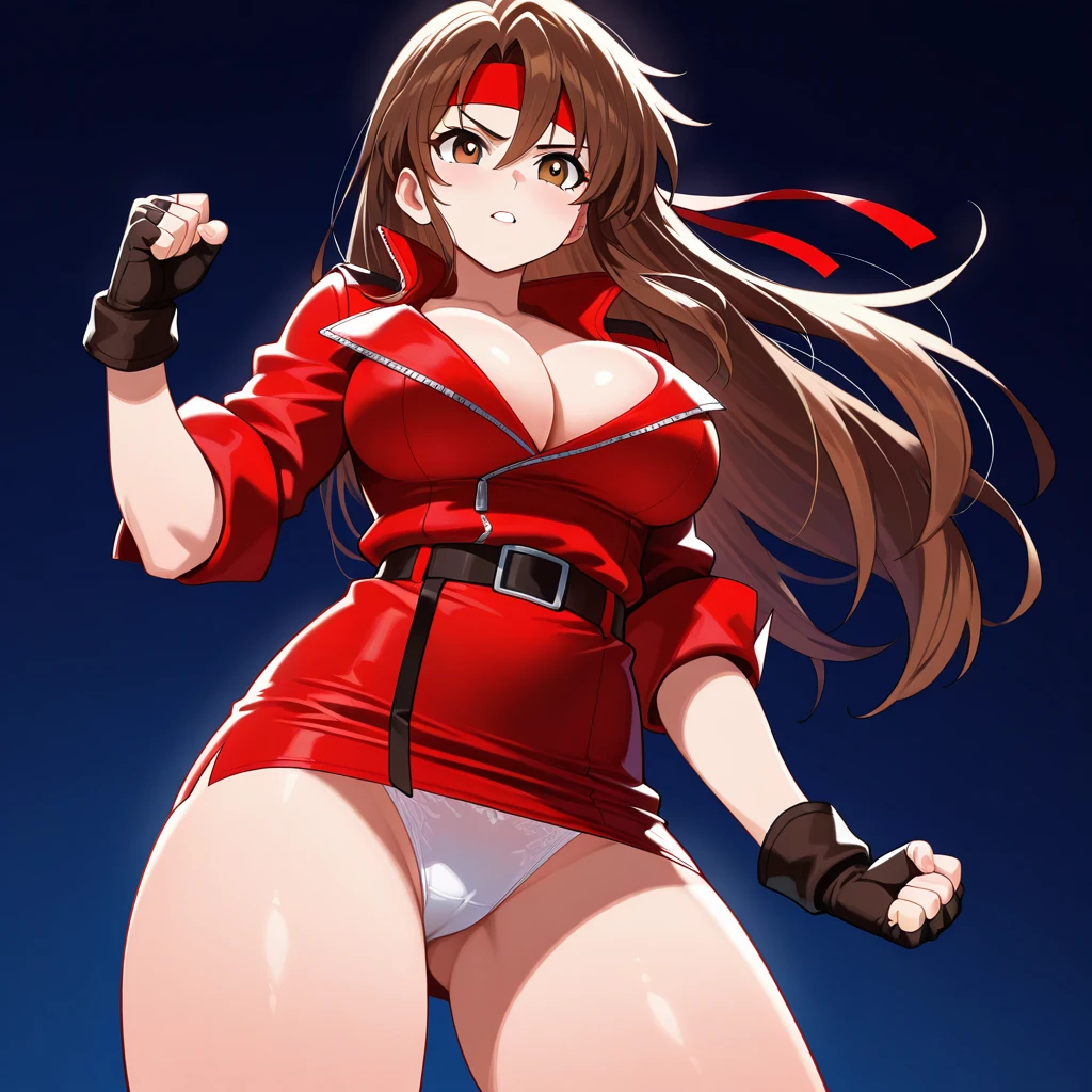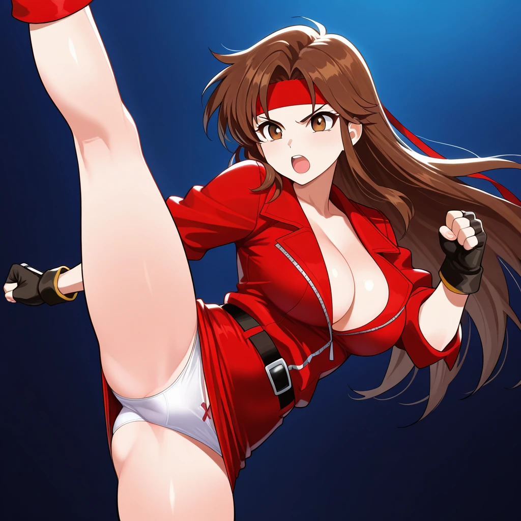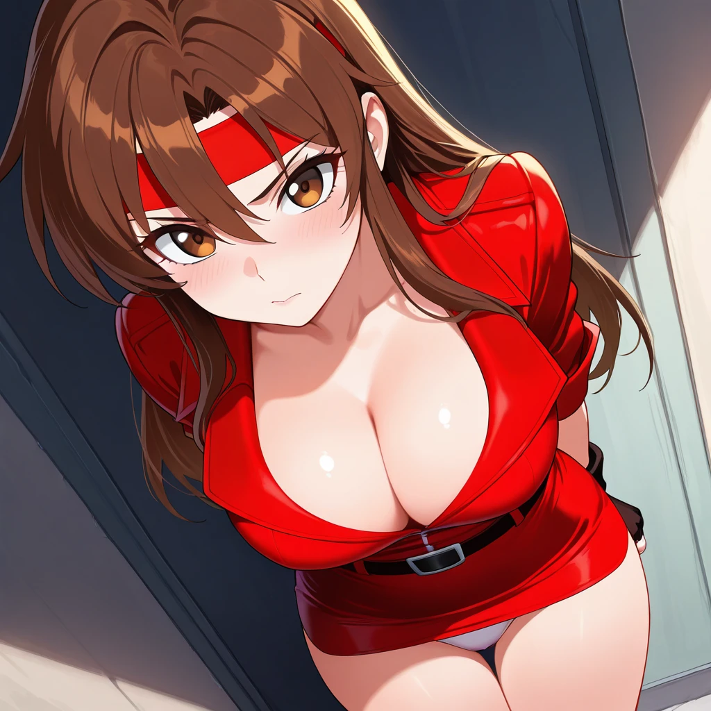 sor1_Blaze_Fielding, 1girl, solo, headband, red headband, large breasts, cleavage, brown hair, long hair, brown eyes, red jacket, white panties, fingerless gloves, gloves, red pencil skirt, pencil skirt, belt, red footwear