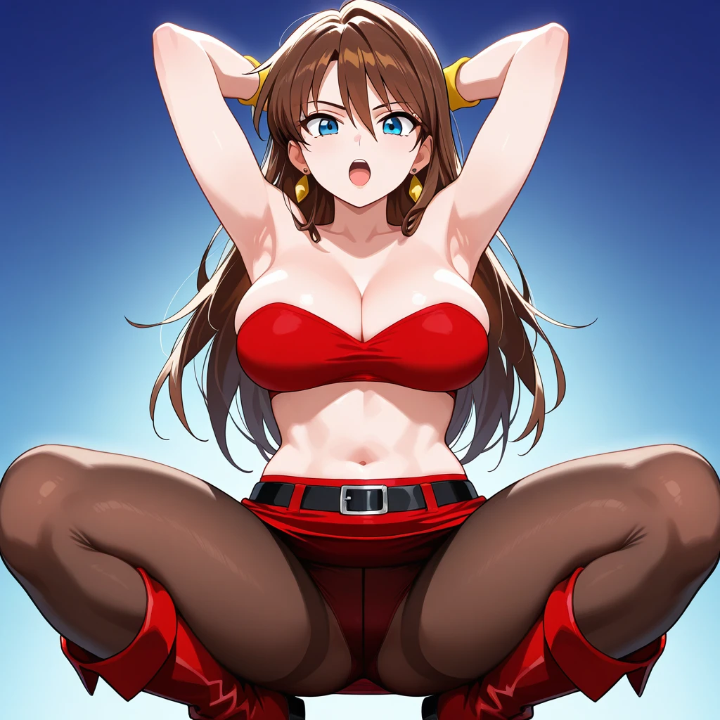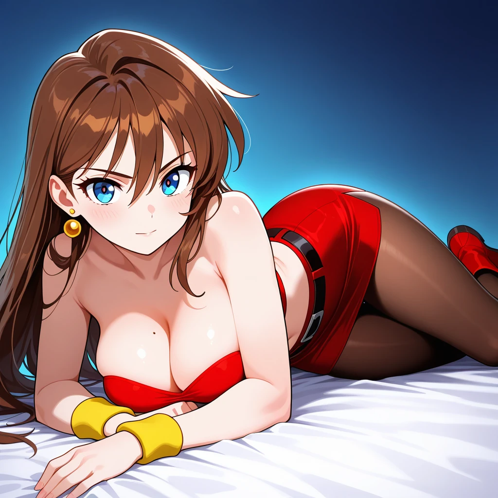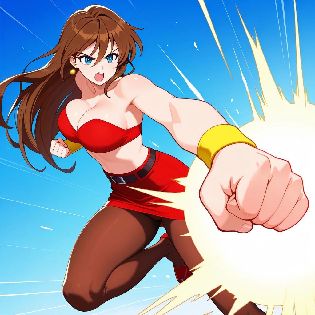 sor2_Blaze_Fielding, 1girl, solo, large breasts, cleavage, brown hair, long hair, blue eyes, jewelry, earrings, no gloves, wristband, gold wristband, strapless, tube top, bandeau, bare shoulders, midriff, red skirt, miniskirt, pantyhose, belt, boots, red footwear