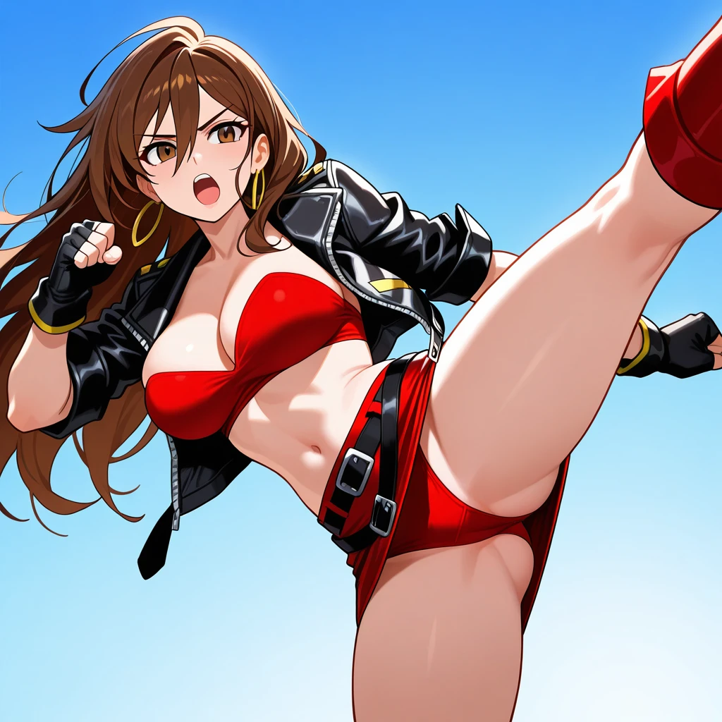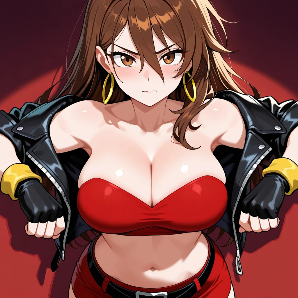 sor4_Blaze_Fielding, 1girl, solo, large breasts, cleavage, brown hair, long hair, brown eyes, hoop earrings, midriff, navel, fingerless gloves, black gloves, leather jacket, black jacket, , tube top, strapless, red tube top, red skirt, miniskirt, loose belt, red footwear, boots