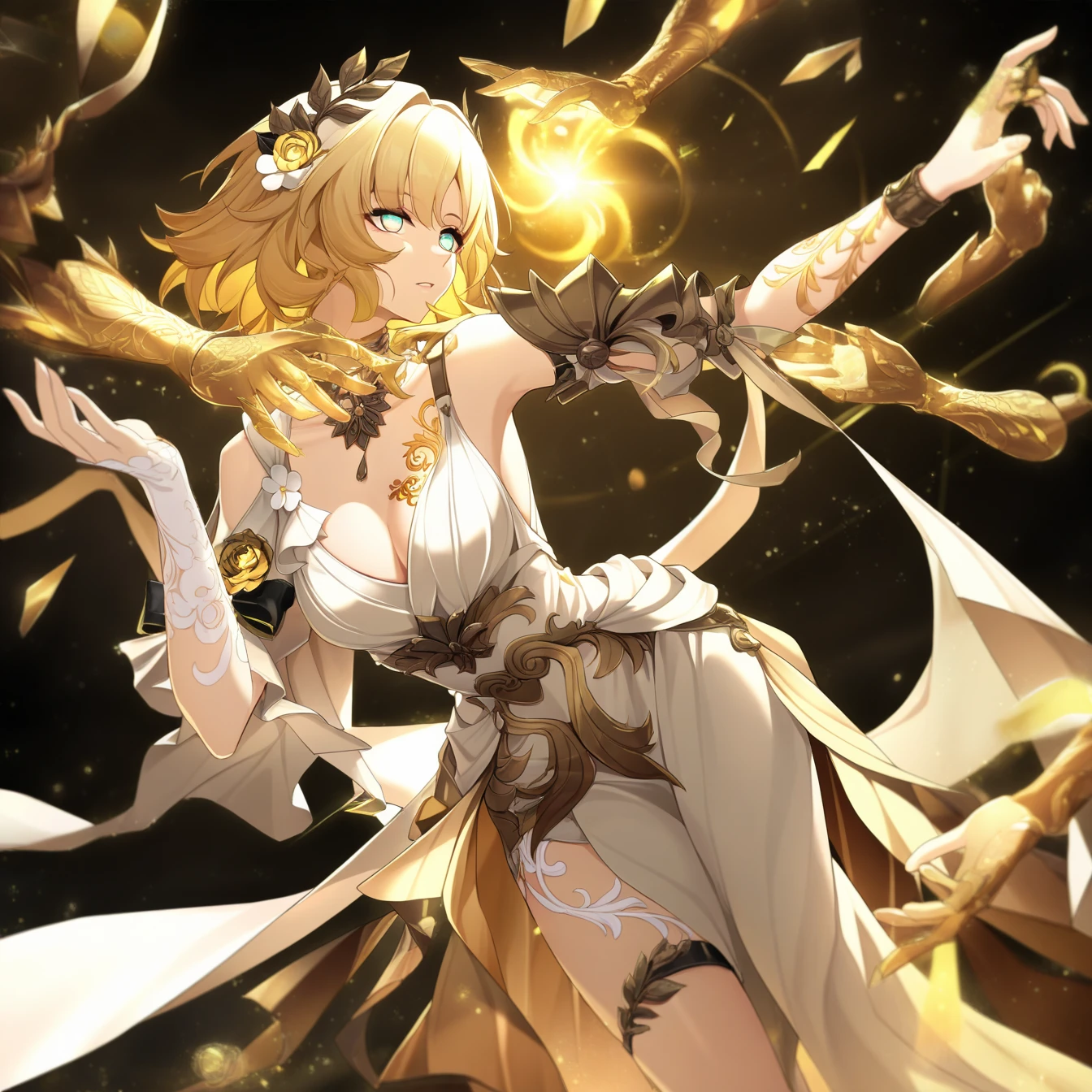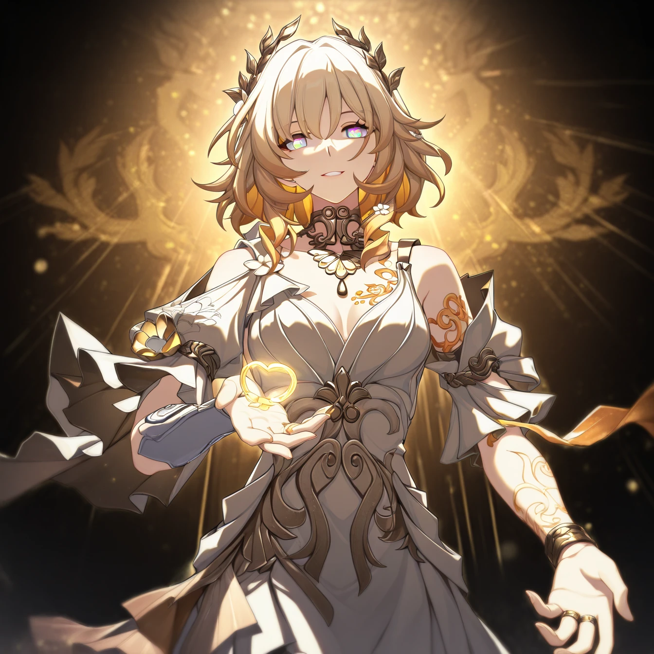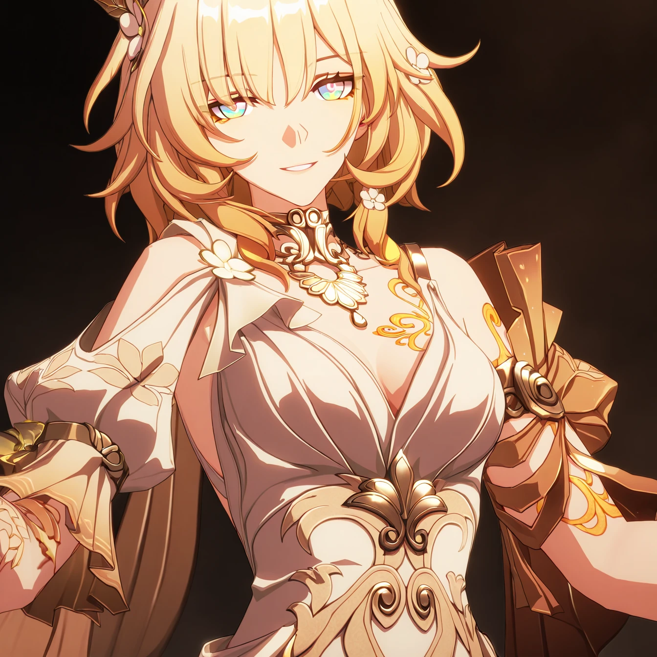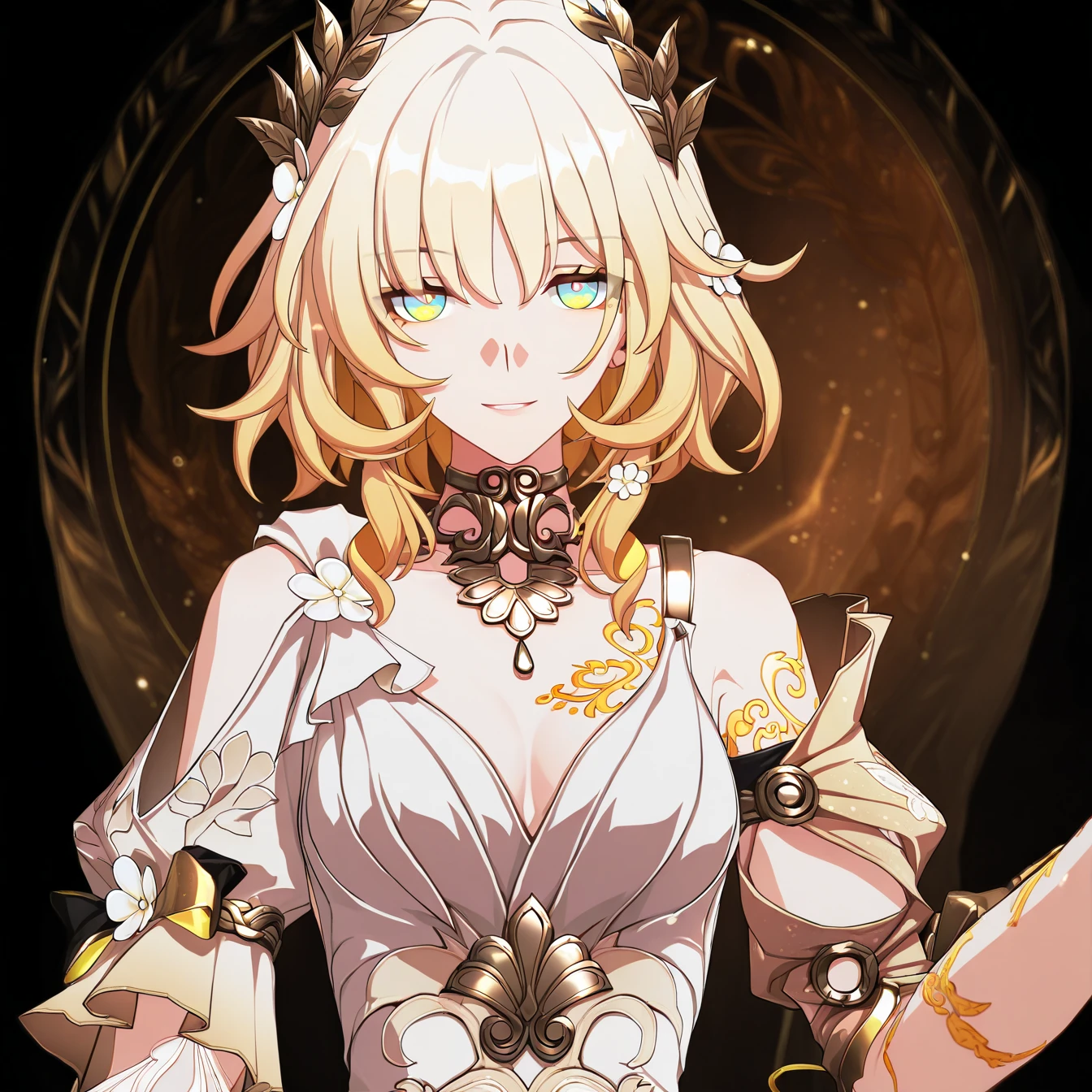 1girl, solo, Aglaea, none pupil, white dress, straped dress, clothes, arm armor, golden tattoo, medium breasts, necklace, bare shoulders, pleated sleeves, short sleeves, looking at viewer, smile, masterpiece, best quality, absurdres, highres,