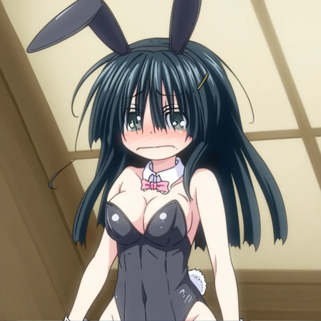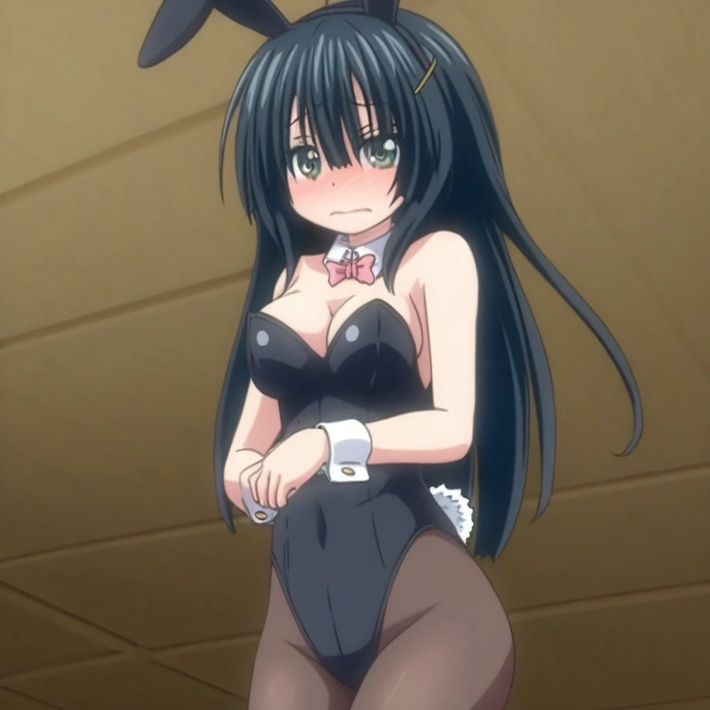 1Girl,Haruno-Chan, medium breasts, long black hair, green eyes,hair over one eye,