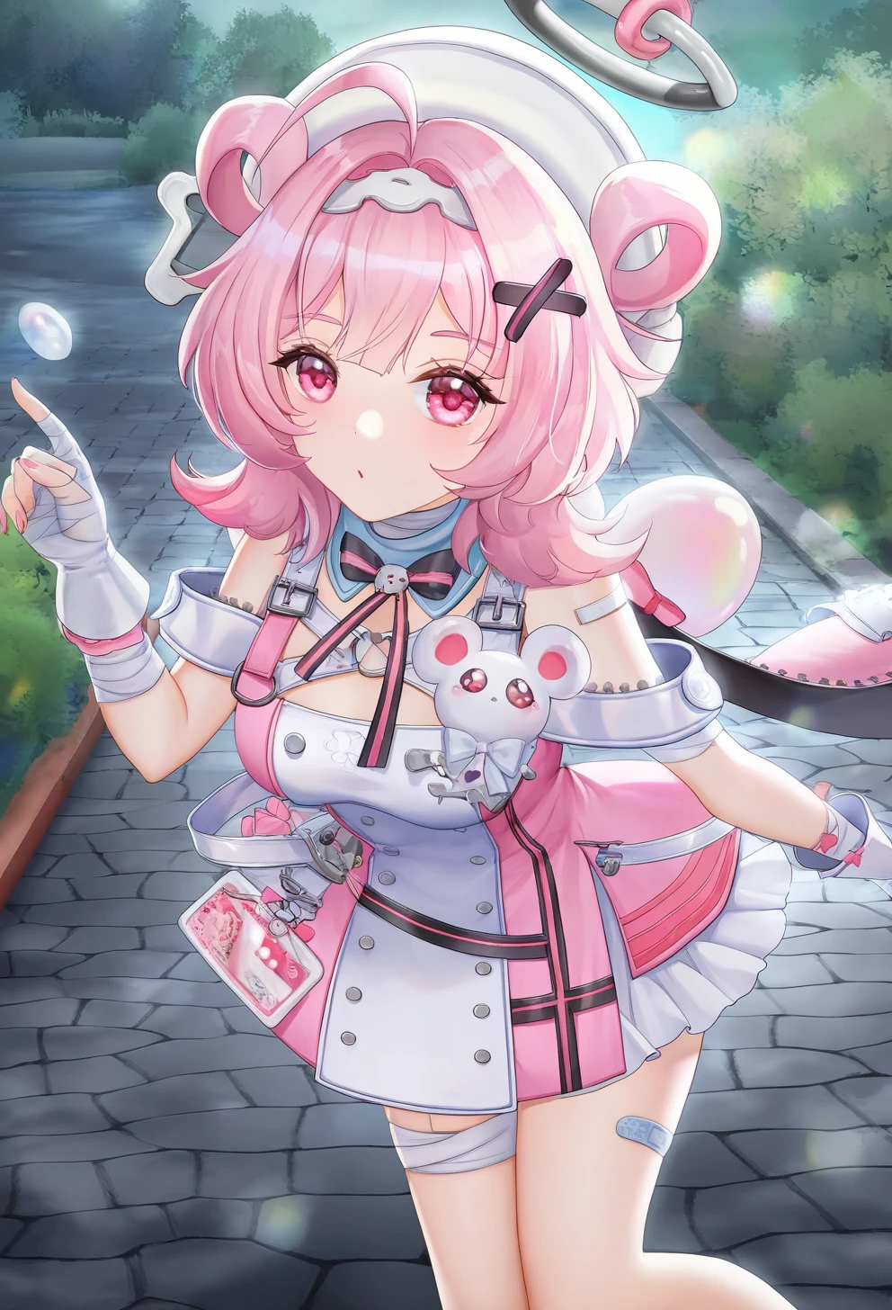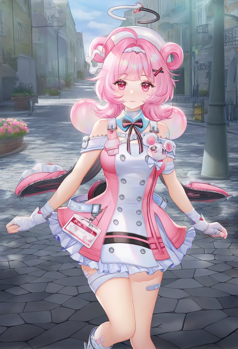 xiaozhi, 1girl, solo, pink hair, pink eyes, halo, dress, looking at viewer, , hair ornament, bangs, bandages, hat, gloves, nurse cap, bandaid, bow, shoulders, bandaid on leg, ahoge