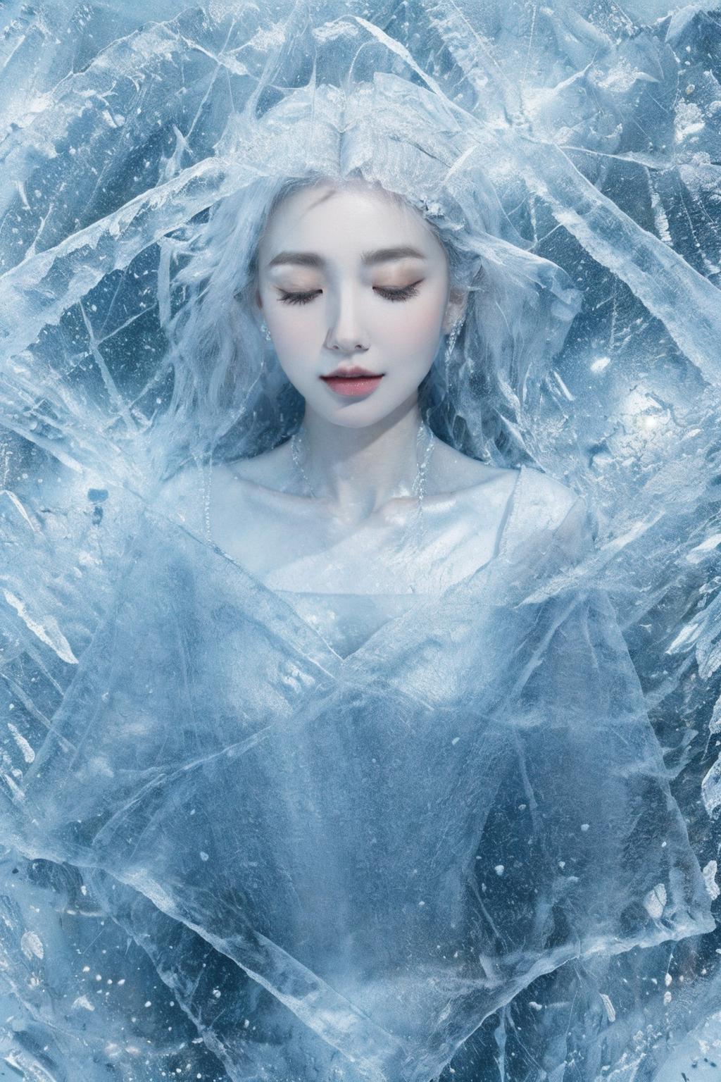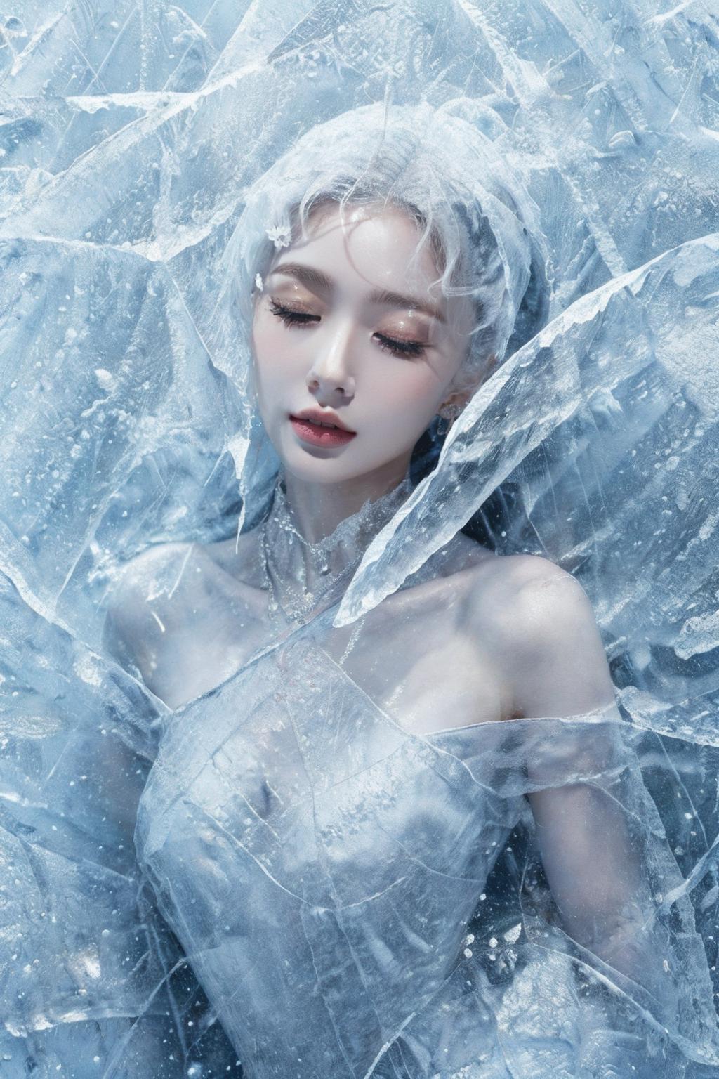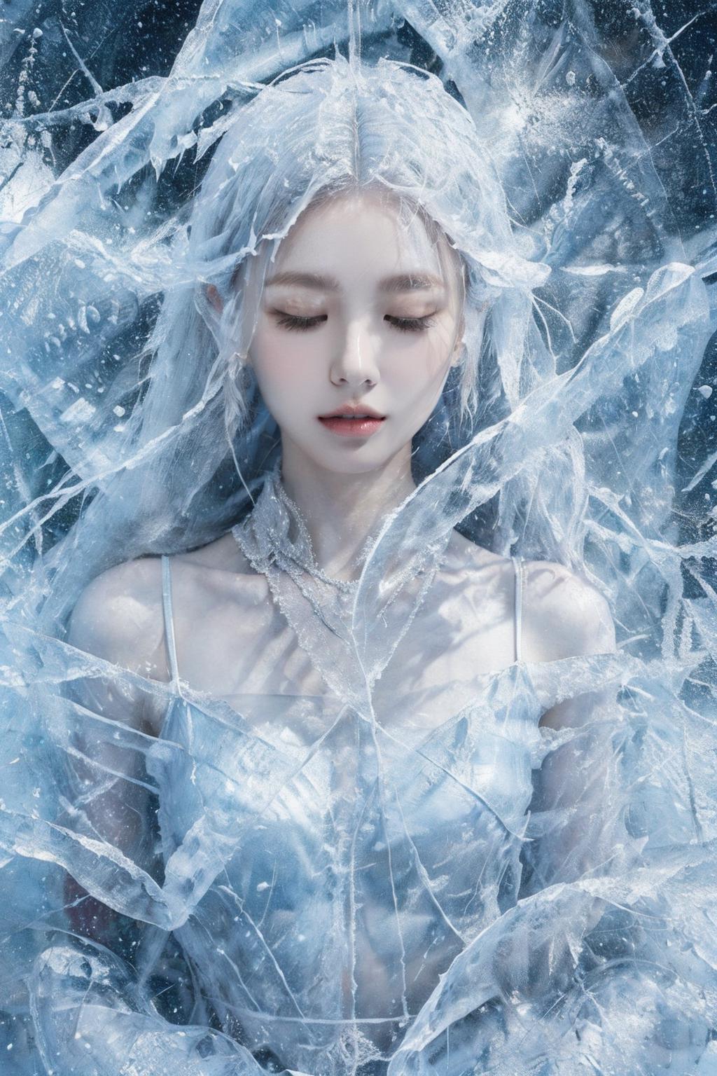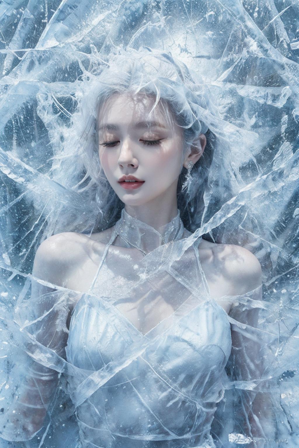 (Masterpiece, high quality, best quality, official art, beauty and aesthetics:1.2),1girl,solo,Ice wraps around the girl (lingering:1.2),(white chinese clothes:0.8),space,frost nova,ice ring,a bit like circular magic,<lora:ice cake_20231126200433-000018:0.8>,extremely detailed 8K wallpaper,(an extremely delicate and beautiful),intricate detail,exquisite eyes,ice bound,ice cake,(ice cracks:1.2),