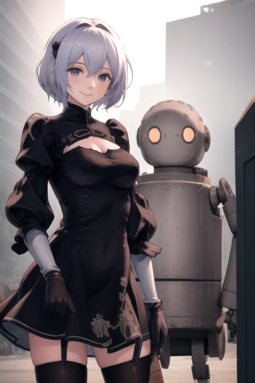 Machin32B, a robot and a woman, cowboy shot, standing, smile