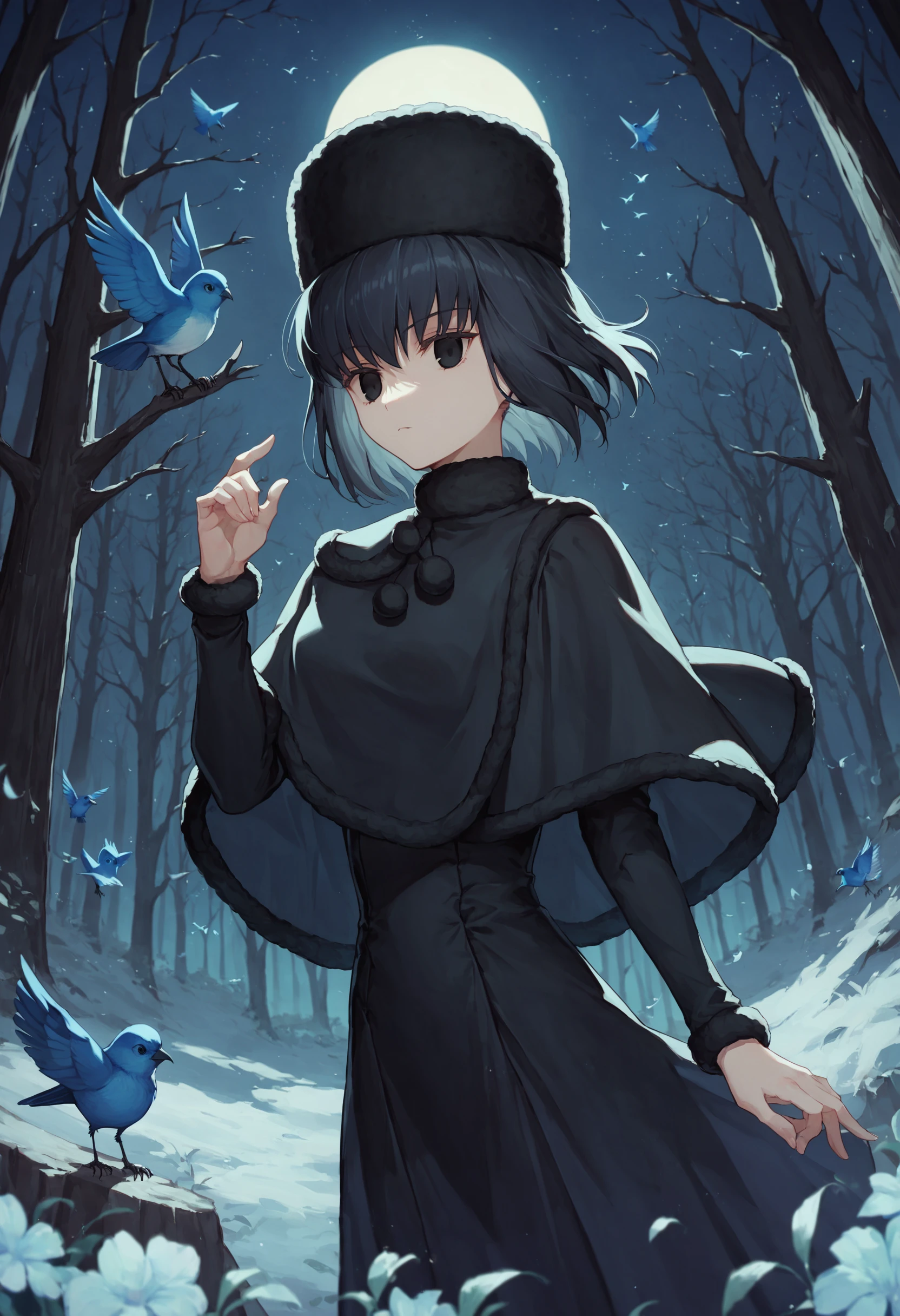 1girl alice kuonji, black dress black capelet fur hat