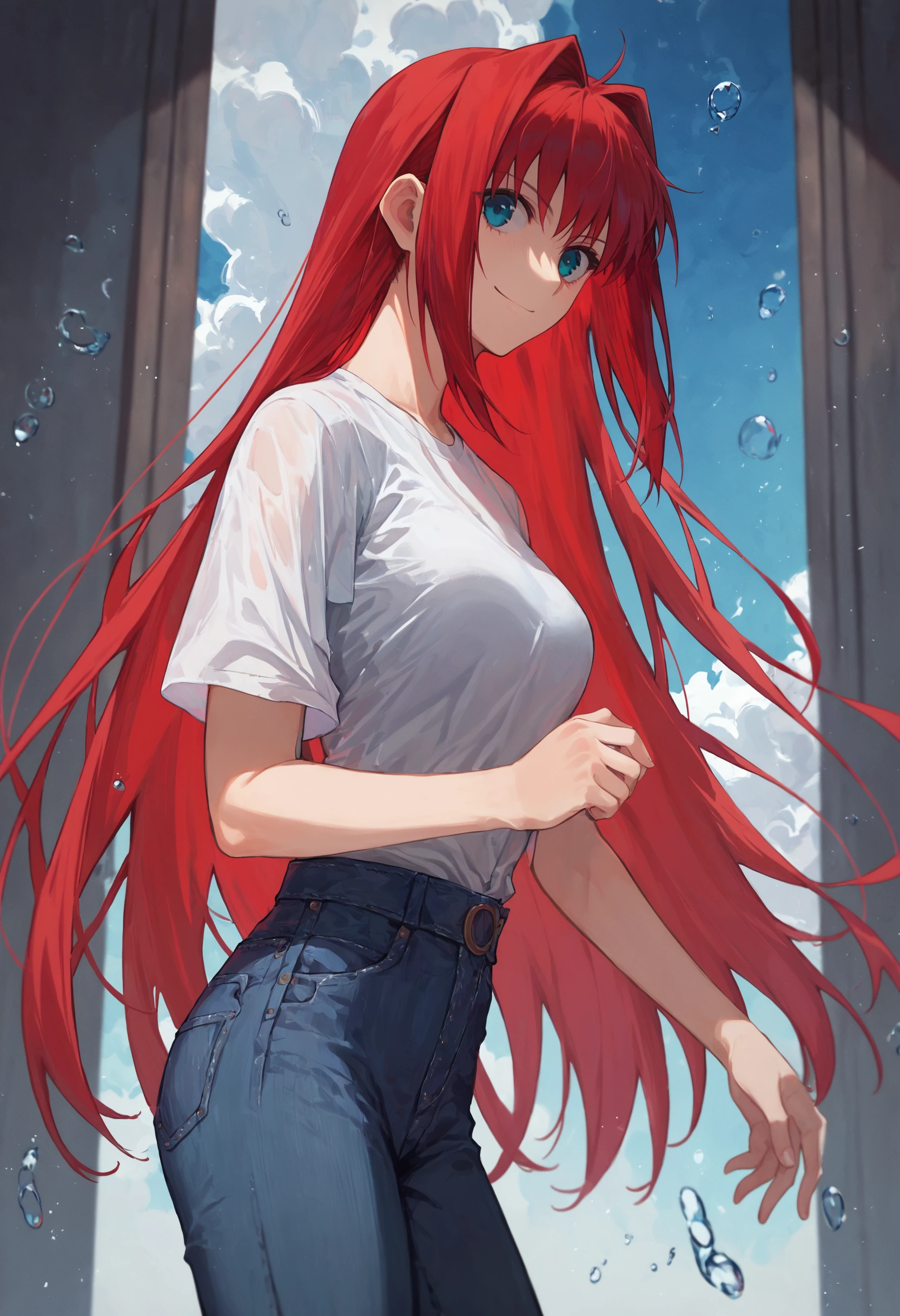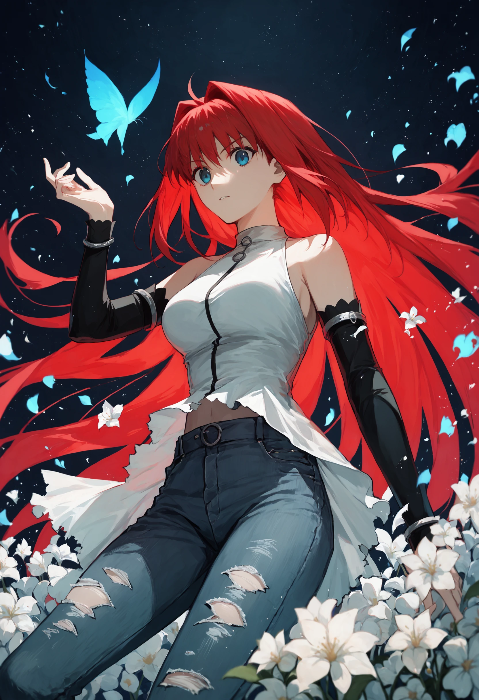 1girl aoko aozaki red hair, white shirt sleeveless torn jeans detached sleeves
