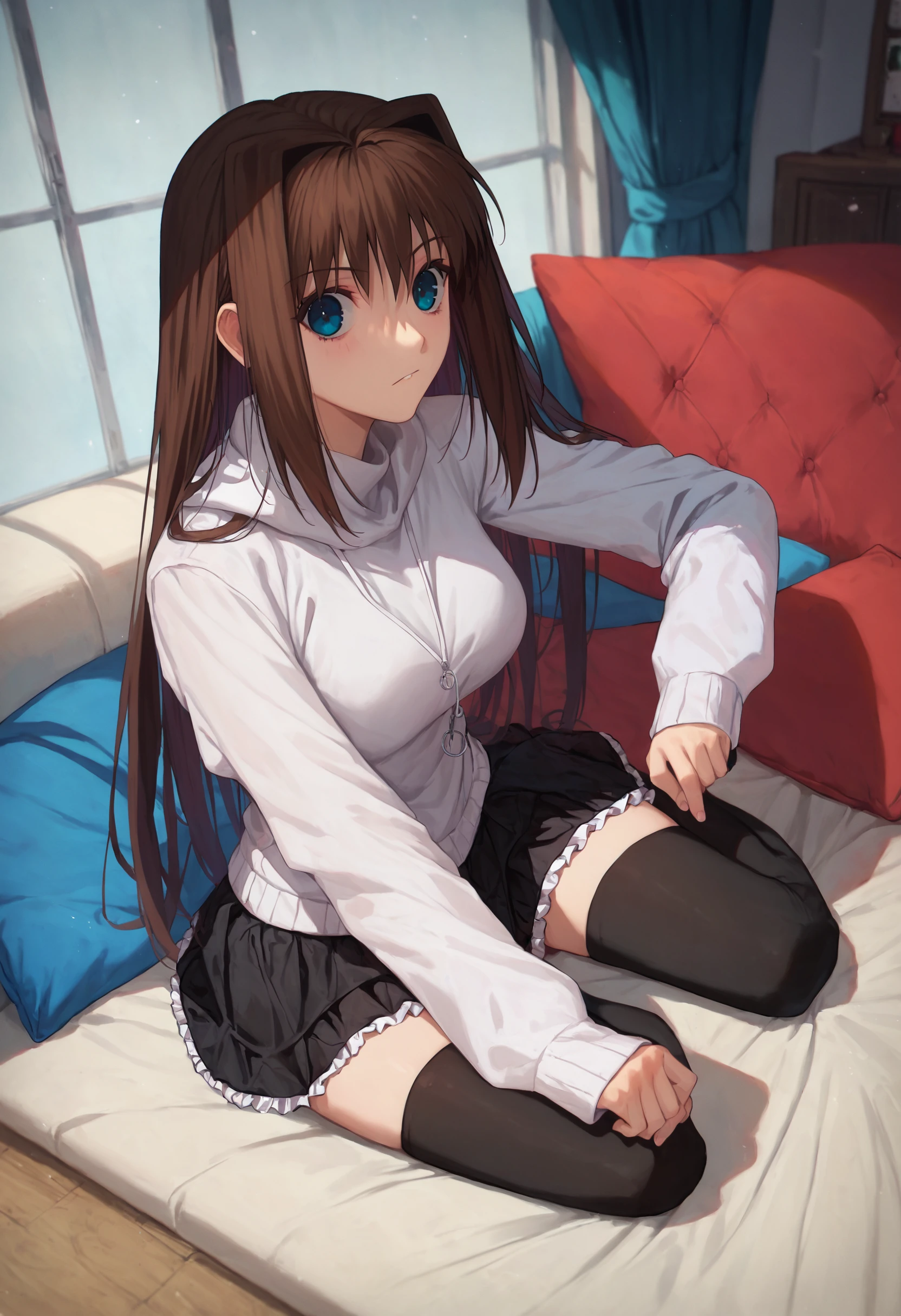 1girl aoko aozaki, white hoodie turtleneck sweater frilled skirt miniskirt black skirt black thighhighs