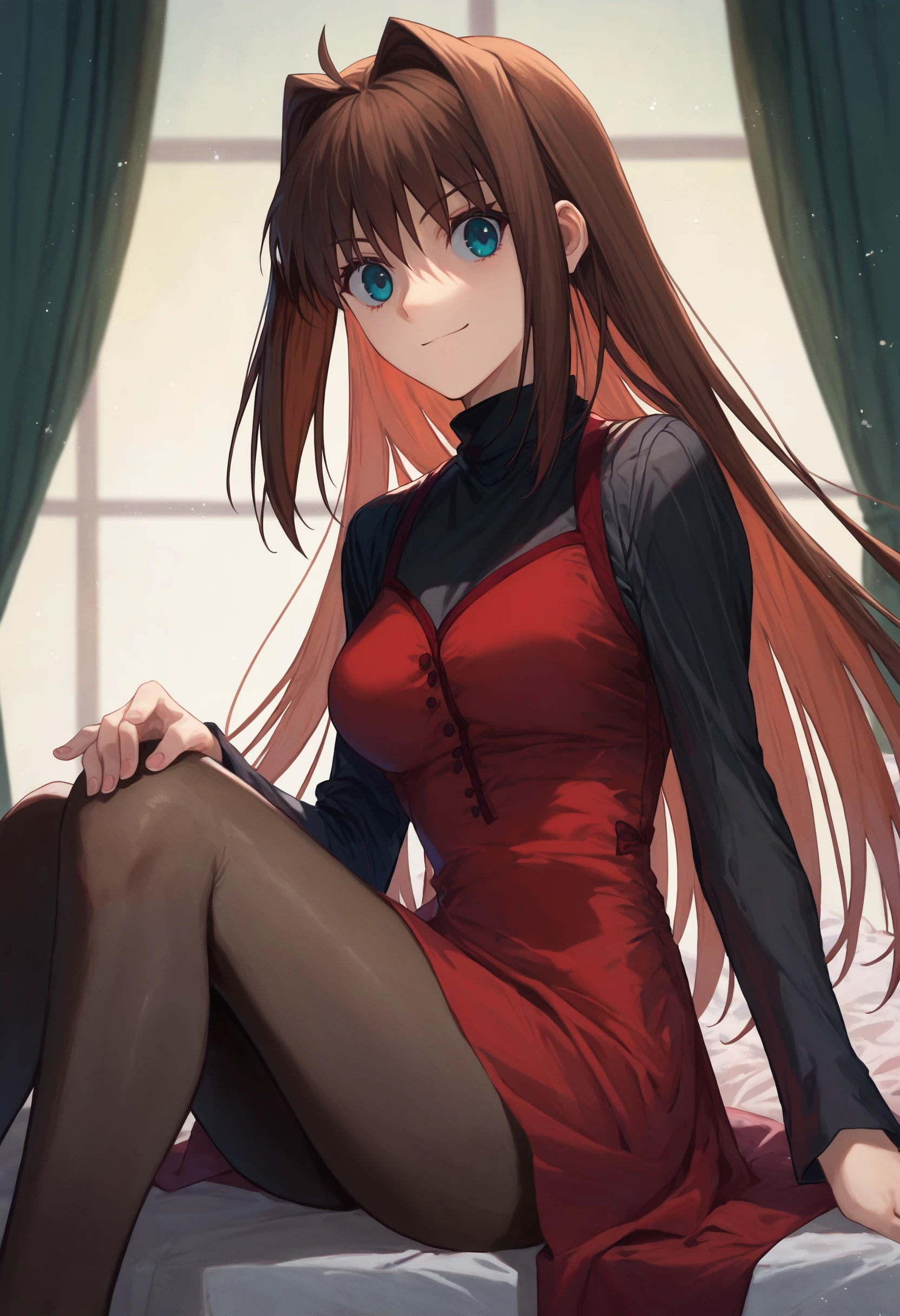 1girl aoko aozaki, black shirt red dress turtleneck black pantyhose