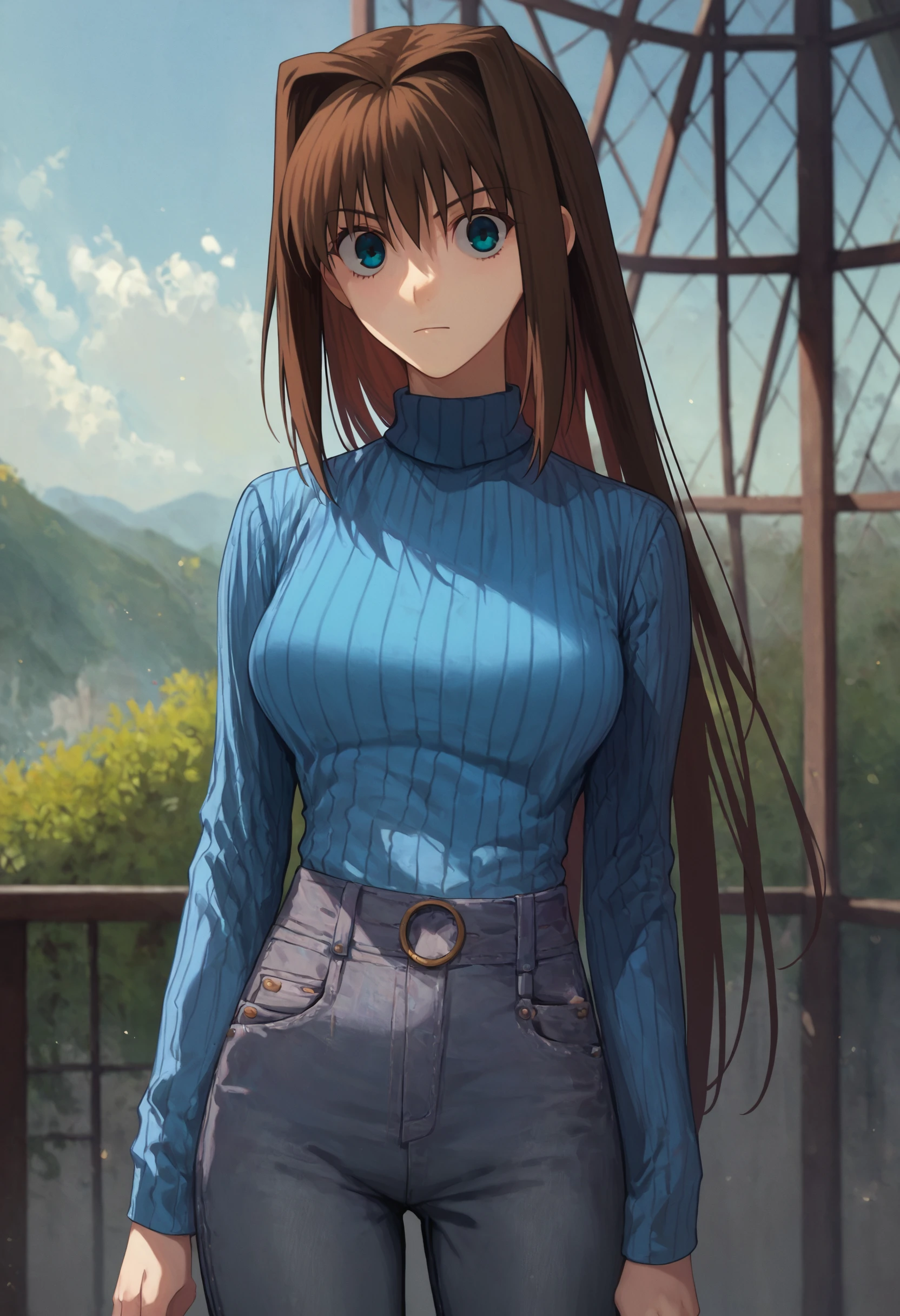 1girl aoko aozaki, blue sweater turtleneck grey jeans
