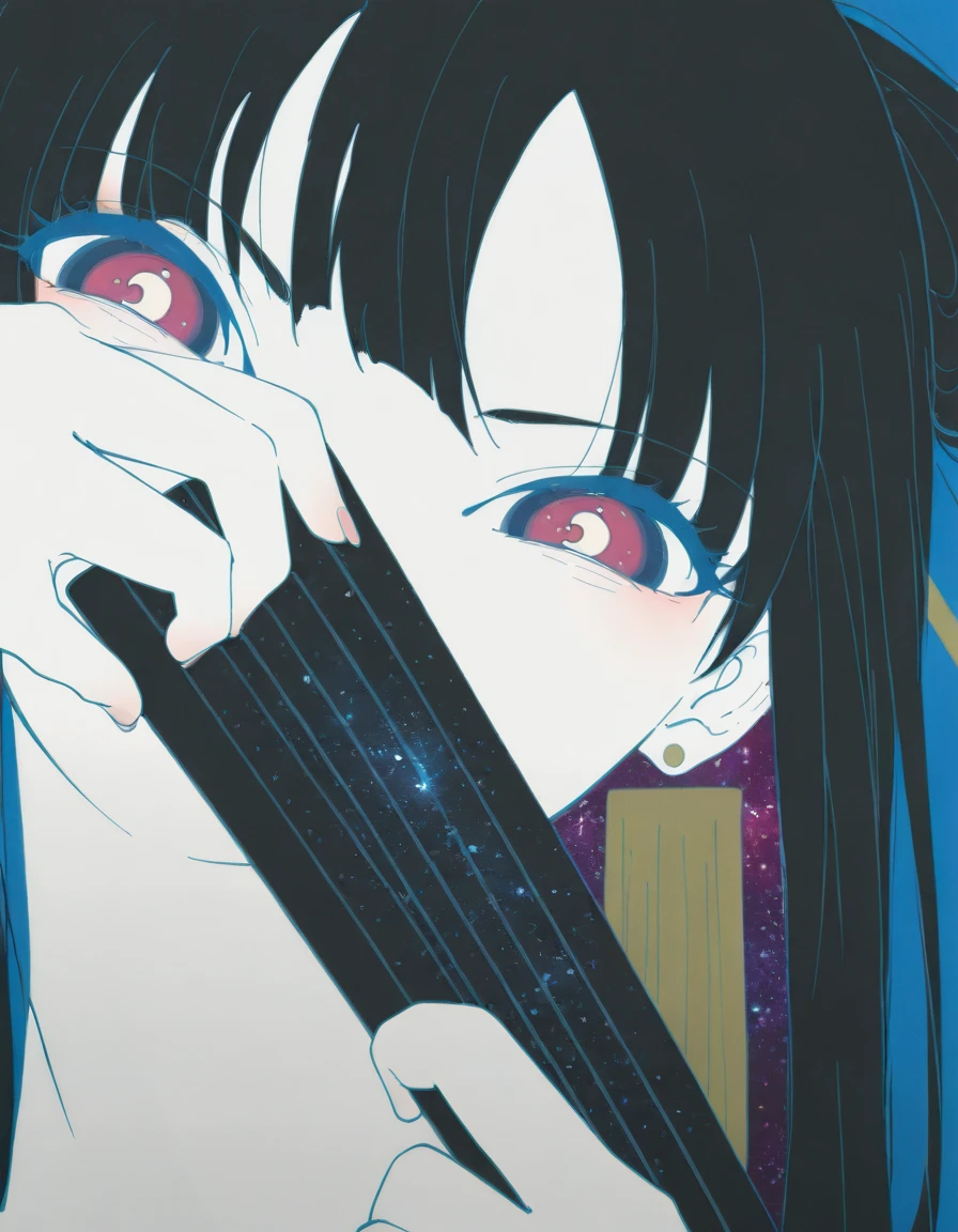 For default girl + hair and jewellery: t1u5, 1girl, mole under mouth, colored sclera, pink eyes, symbol-shaped pupils, long hair, black hair, hime cut, sidelocks, earrings, bracelet, hair stick, hair ornament, single hair bun, colored inner hair