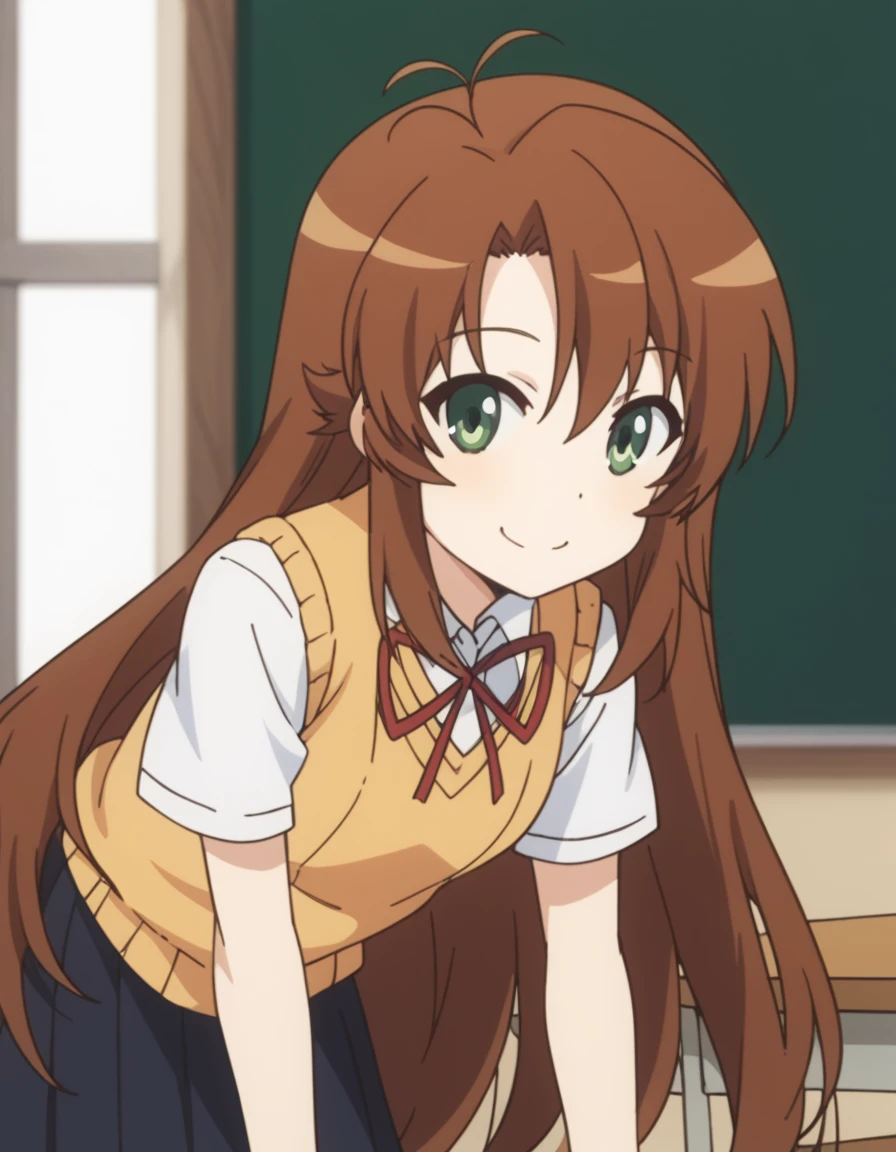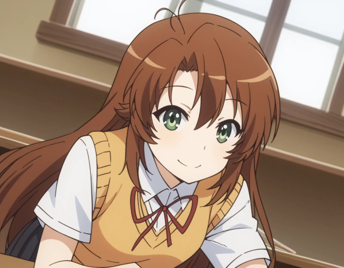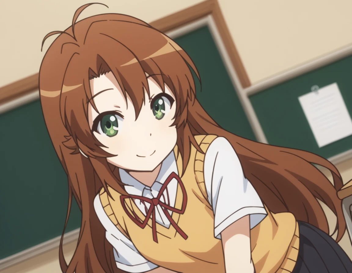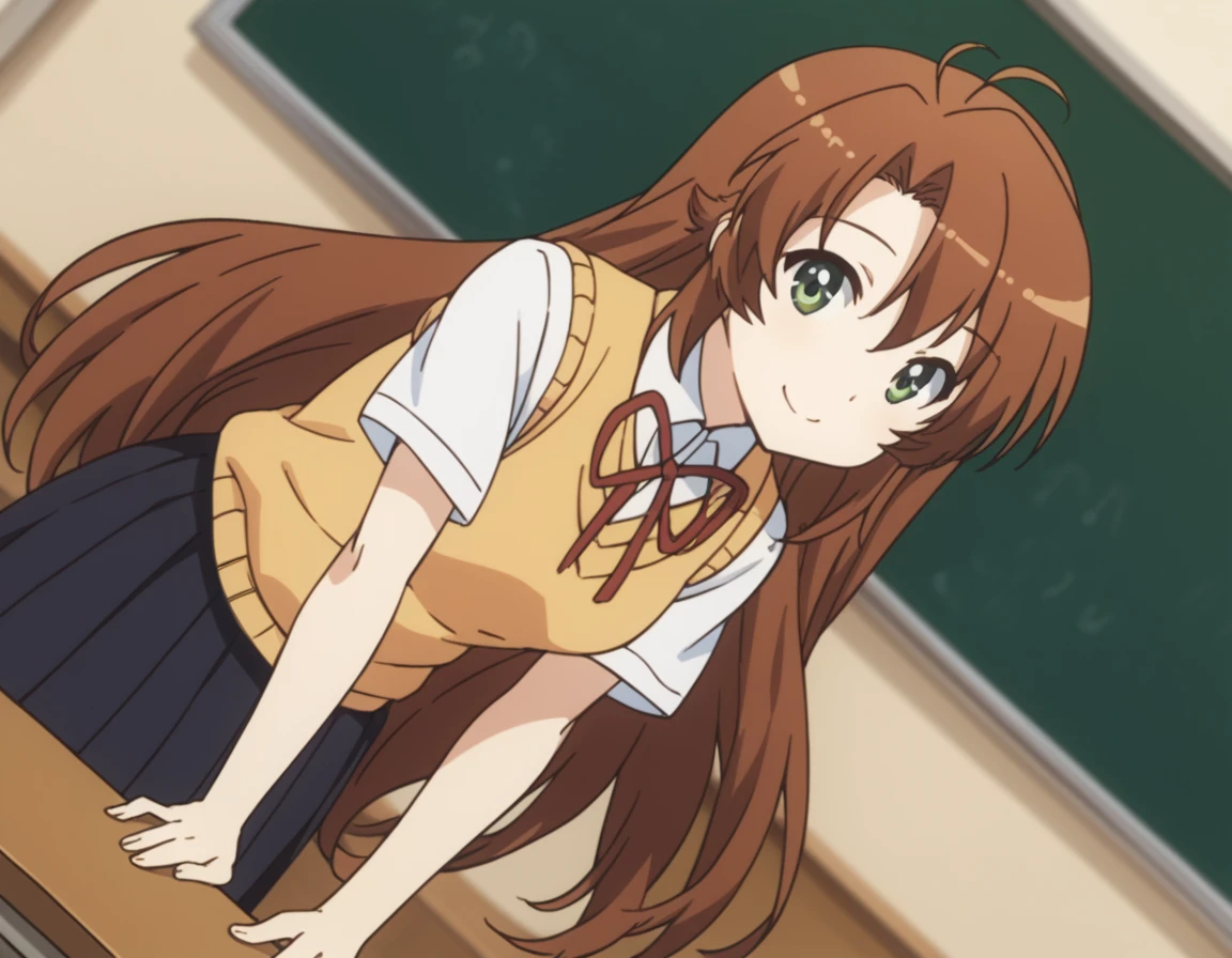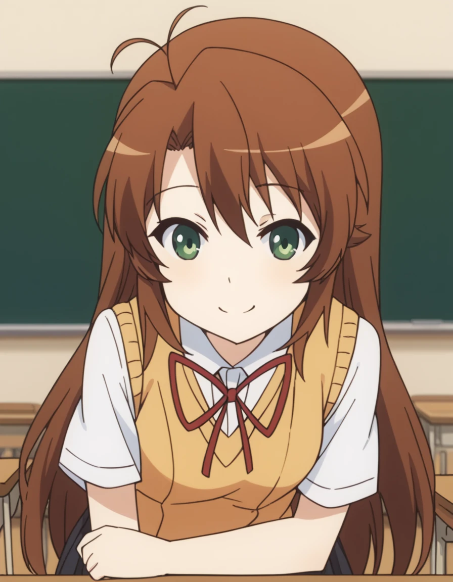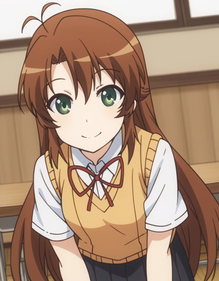 komari koshigaya, long hair, bangs, brown hair, hair between eyes, very long hair, green eyes, ahoge, antenna hair,