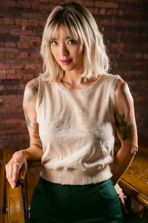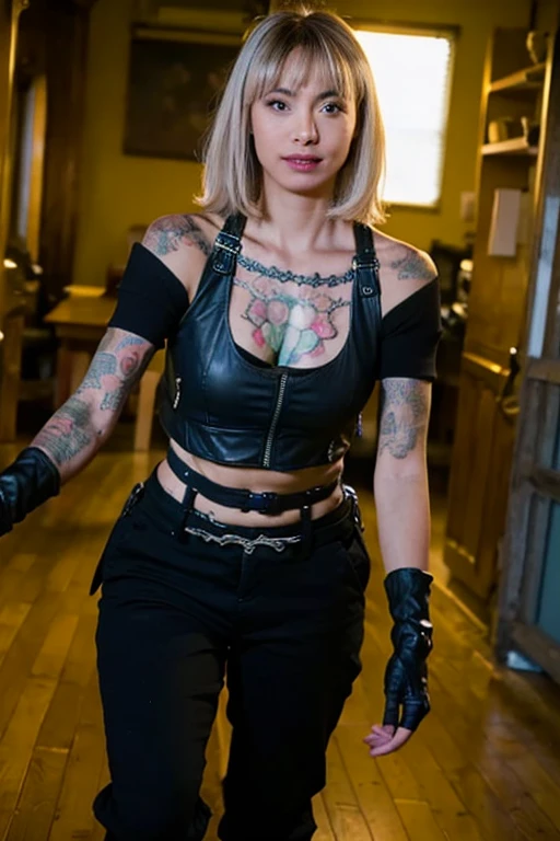 Platinum short hair,bare shoulders, bare belly,leather vest,leather gloves,Black overalls, black boots,Chest tattoo, arm tattoo, thigh tattoo,