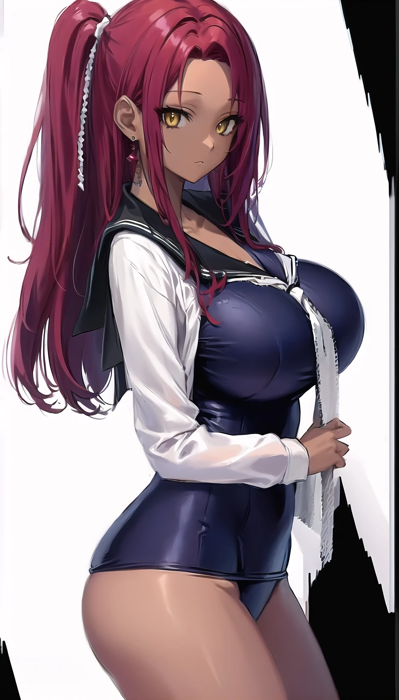 side ponytail, red hair, yellow eyes,dark-skinned female,1girl,