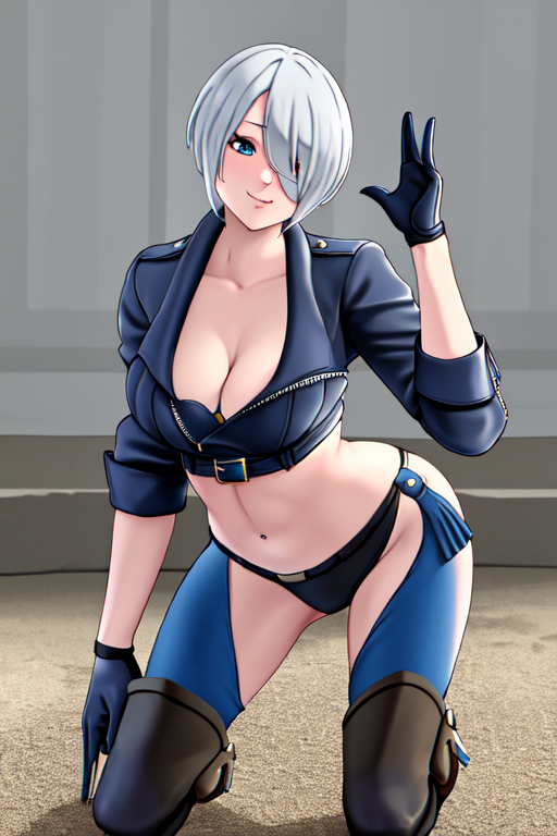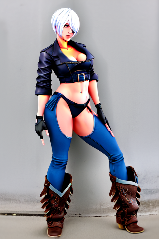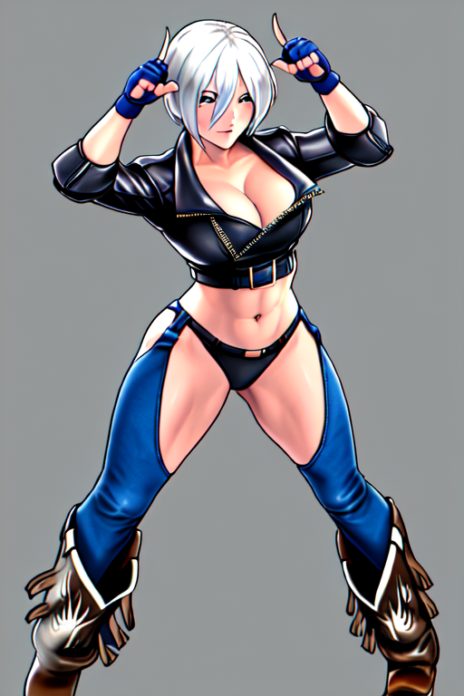 masterpiece, best quality, <lora:last angel2:0.5>, <lora:last angel:0.5>, bangs, boots, bra, chaps, cowboy boots, cowboy boots, gloves, leather jacket, strapless, strapless bra, toned, silver hair, double v, fisticuffs, Fight Stance, wrestling