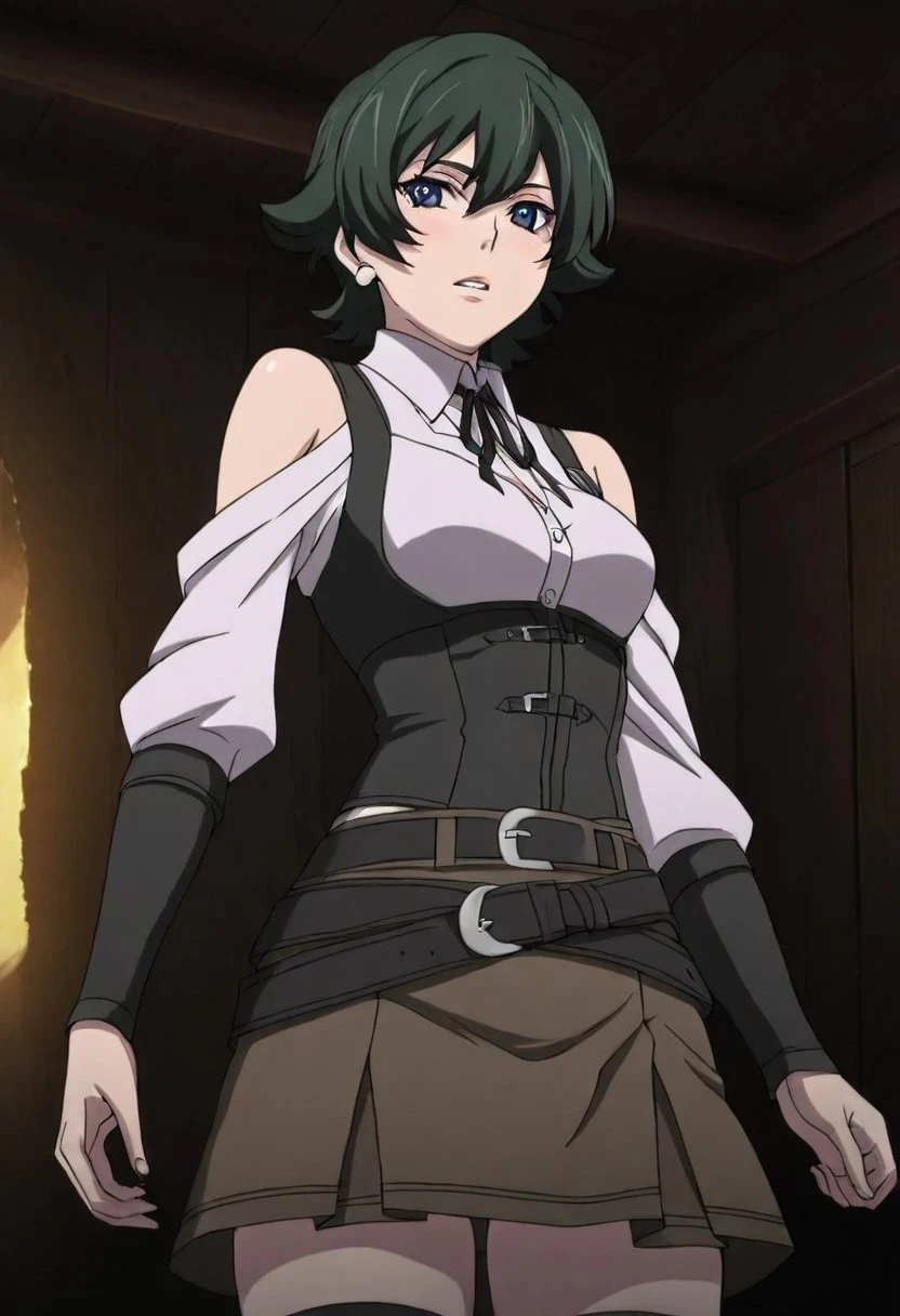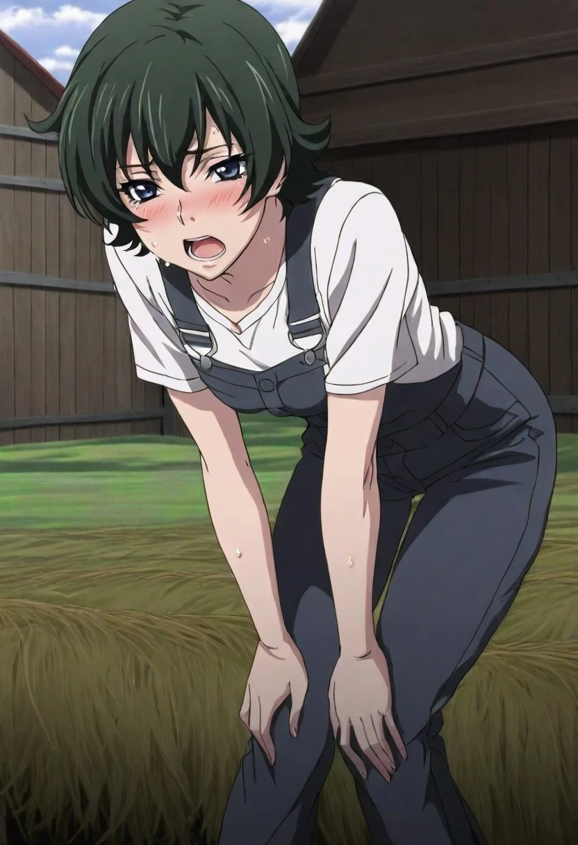 1 girl, solo, KyasariroTotona, blue eyes, green hair, short hair, hair between eyes, red scarf around the neck, cowboy hat, pink shirt, pink vest, blue shorts, black belt, gun , brown chaps, cowboy boots