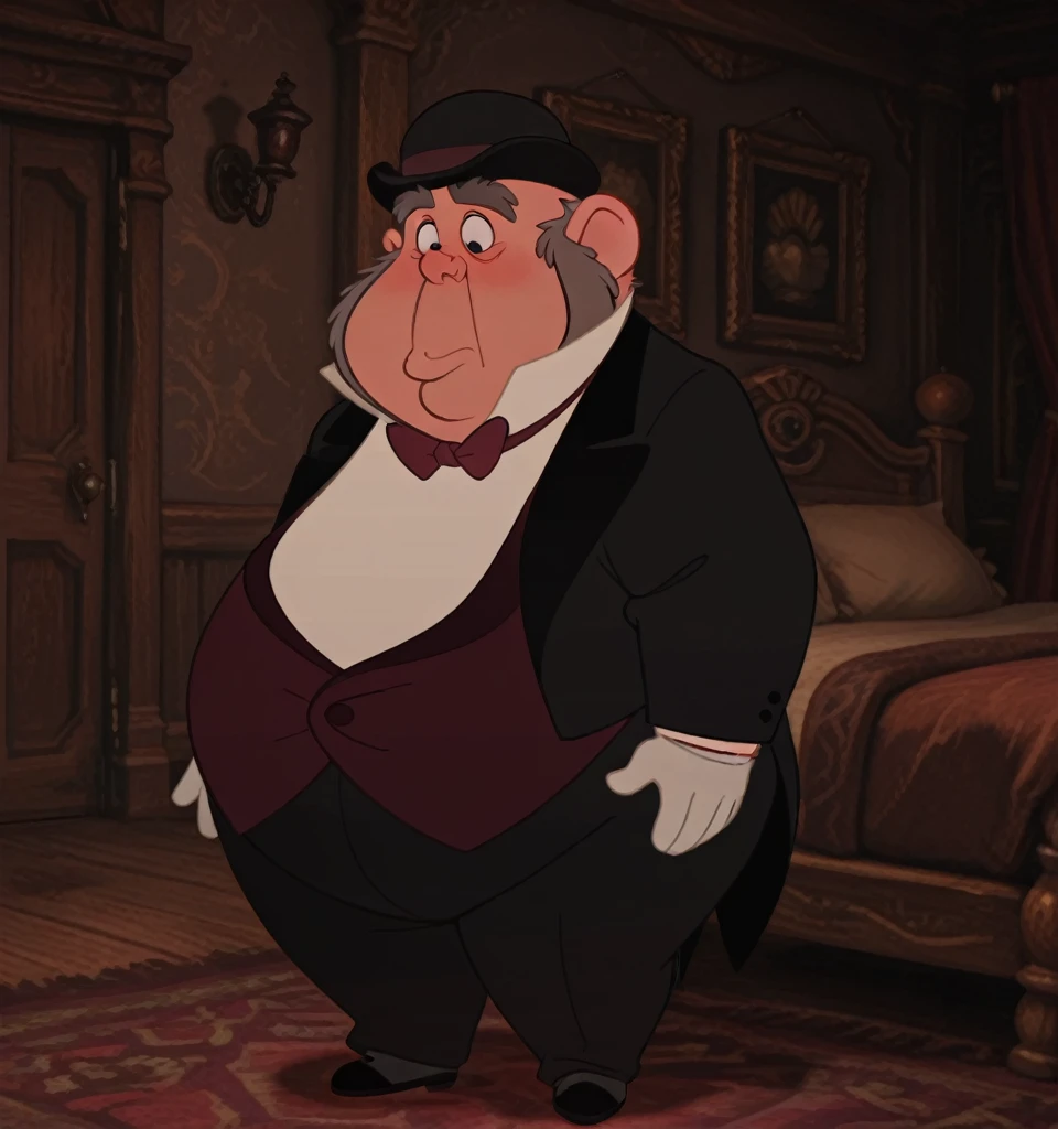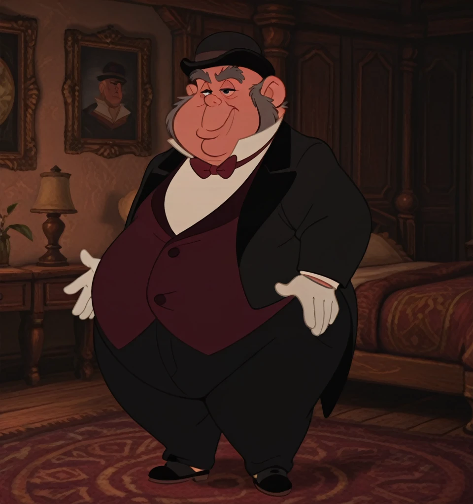 L4WR3NC3, mature male, human, old man, gray hair, gray eyebrows, thick eyebrows, gray sideburns, caucasian, formal wear, bowler hat, black jacket, red bowtie, white shirt, white gloves, dark red vest, black trousers, black shoes, obese