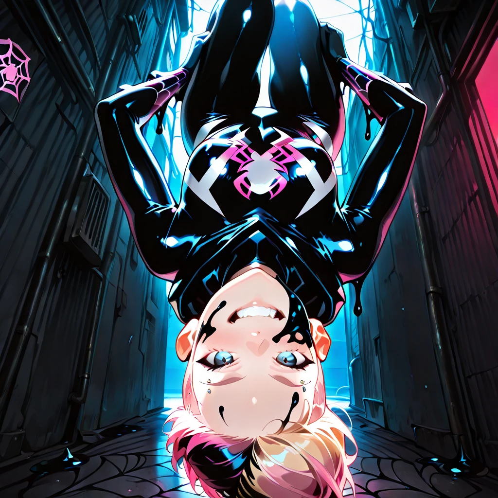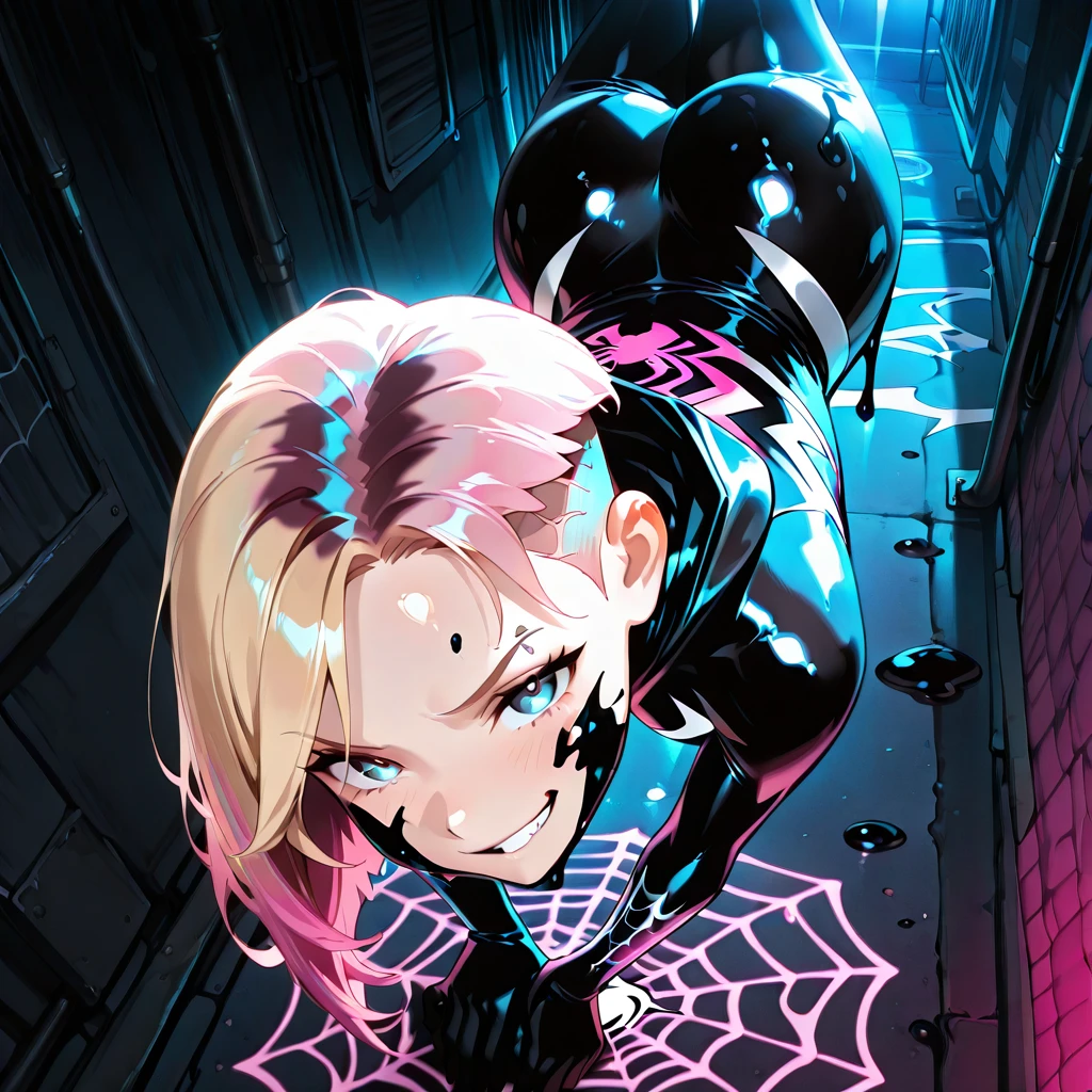Gwen looks like: blue eyes, eyebrow piercing, blonde hair, (asymmetrical hair, undercut), two-tone hair, pink hair, medium hair, small ,(black symbiote on girl's face,black slime all over girl's face,black slime all over body), Gwen is wearing: black symbiote,skin tight,(black slime ,black with pink highlights and pink patterns,white spider symbol),hood down,