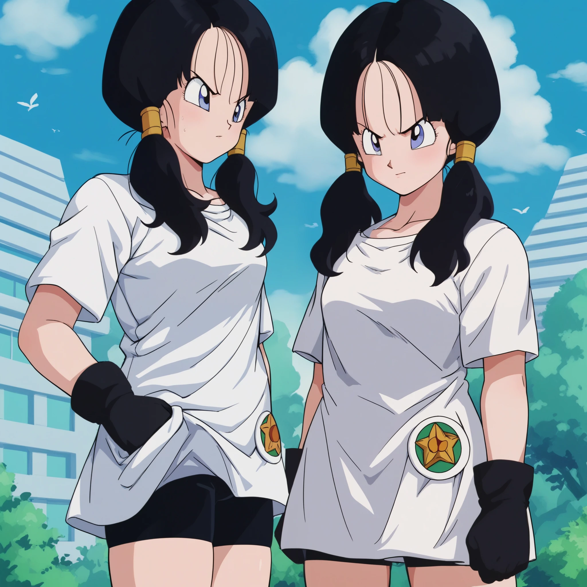 videl ,twintails, 1girl, bike shorts, white shirt, black hair, gloves,