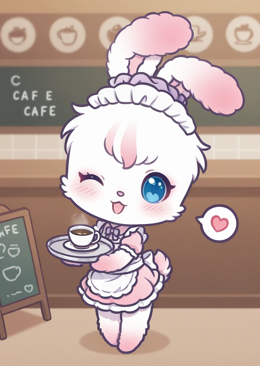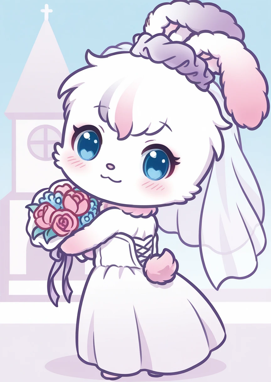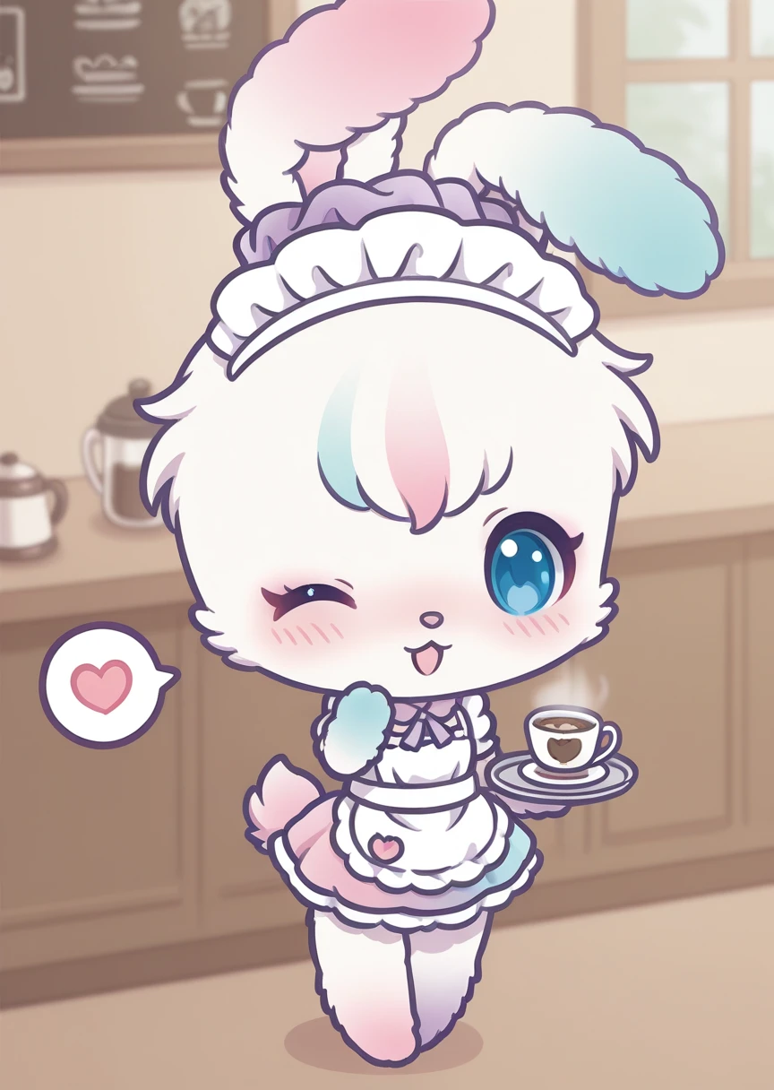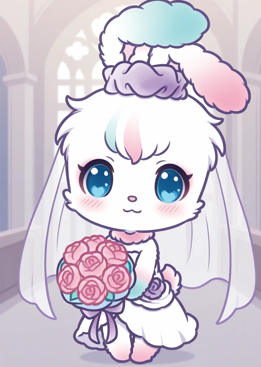 prompts: chouchoumagirouge, animal ears, blue eyes, multicolored fur, furry, shoulder bag, ear scrunchie, chibi,