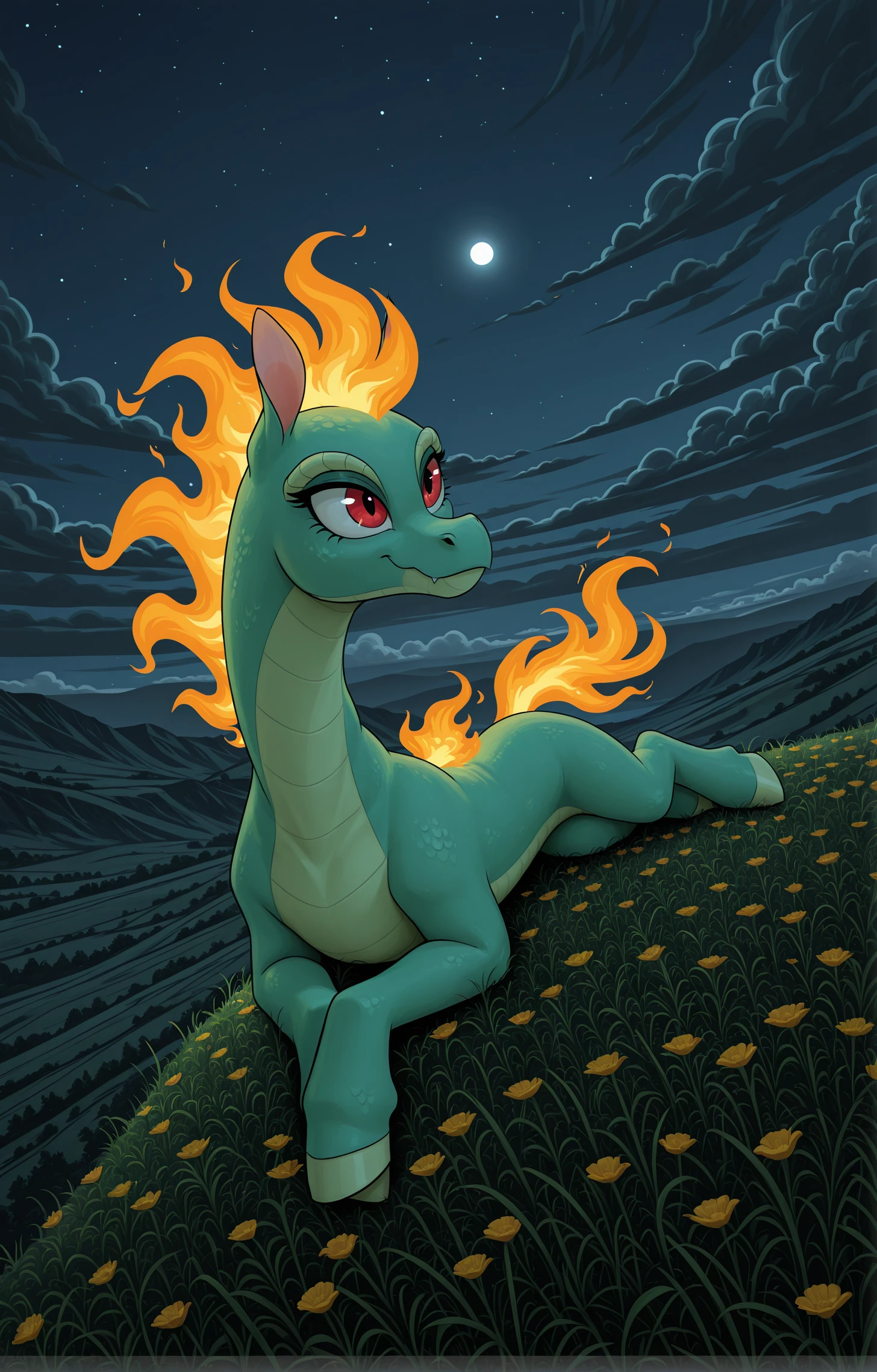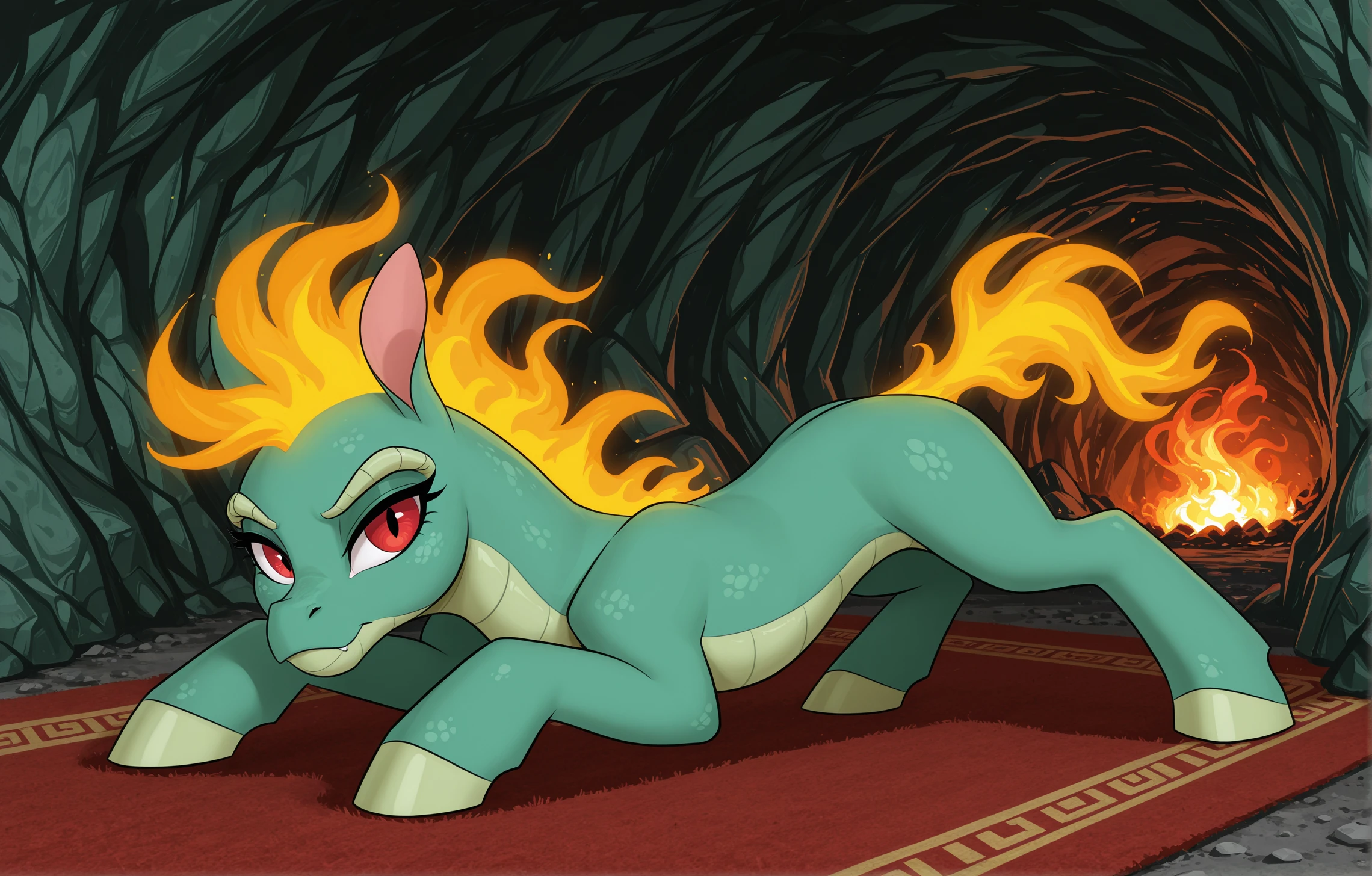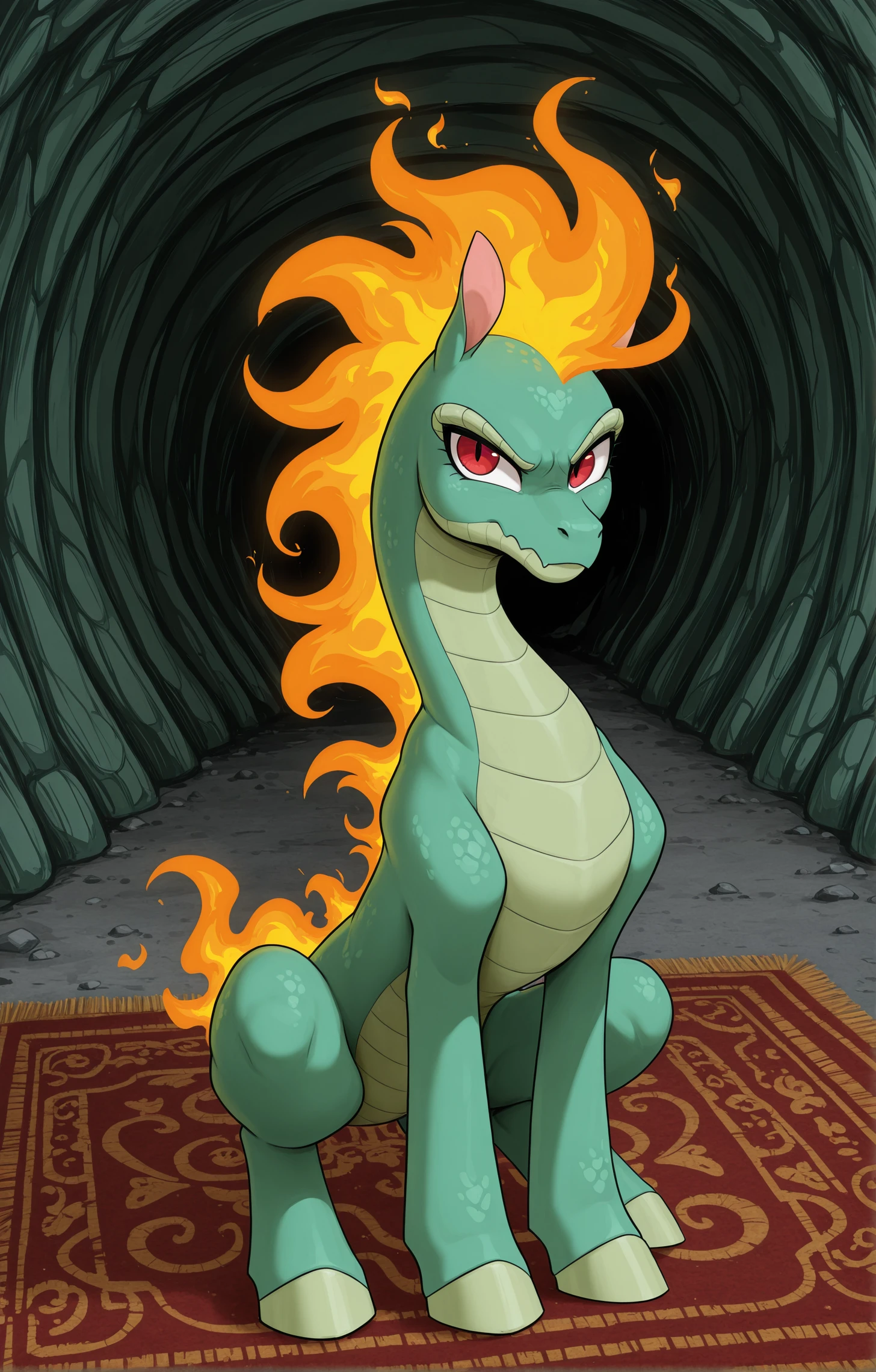 Longma, Fire Hair, Flame, Green Body, Green Scales, Tianhuo (tfh), Red Eyes, Scales, Perissodactyls, Hooves, Solid Color, Yellow Scales, Dragon, Longma, Fire Hair, Flame, Green Body, Green Scales