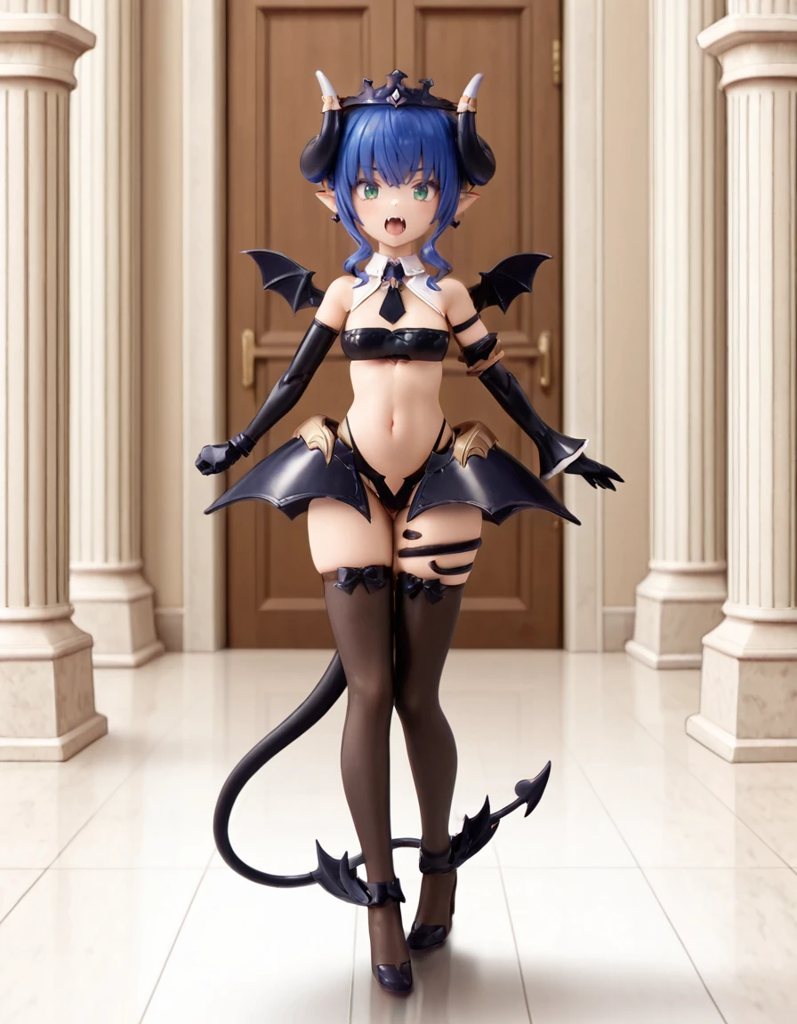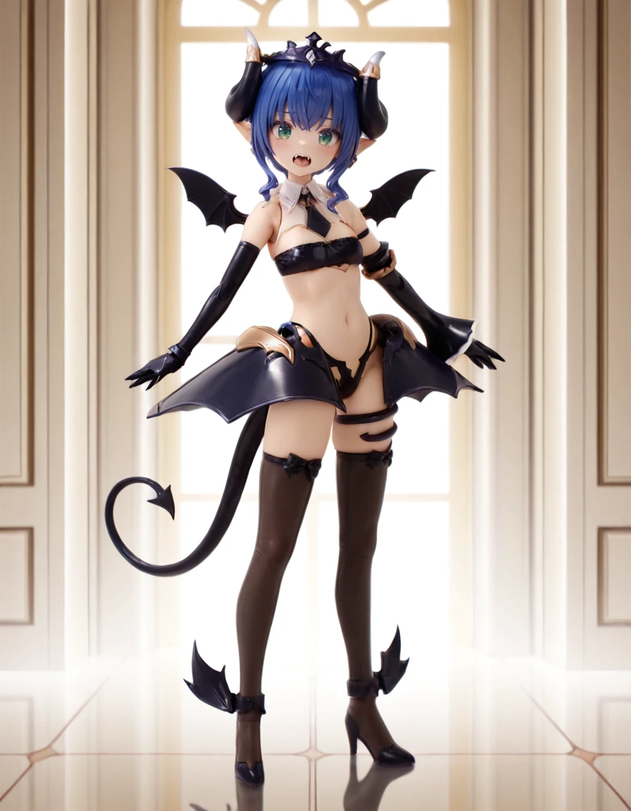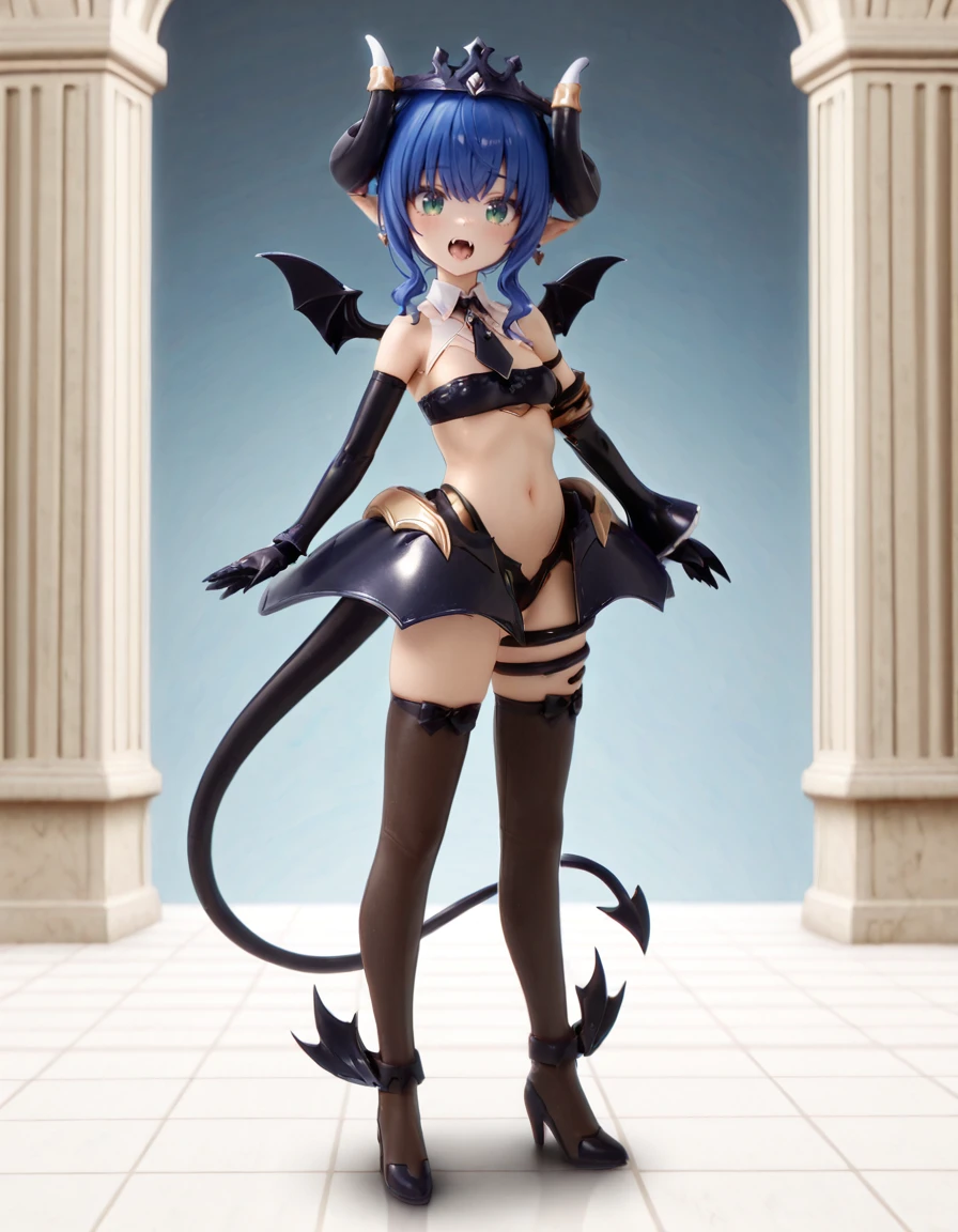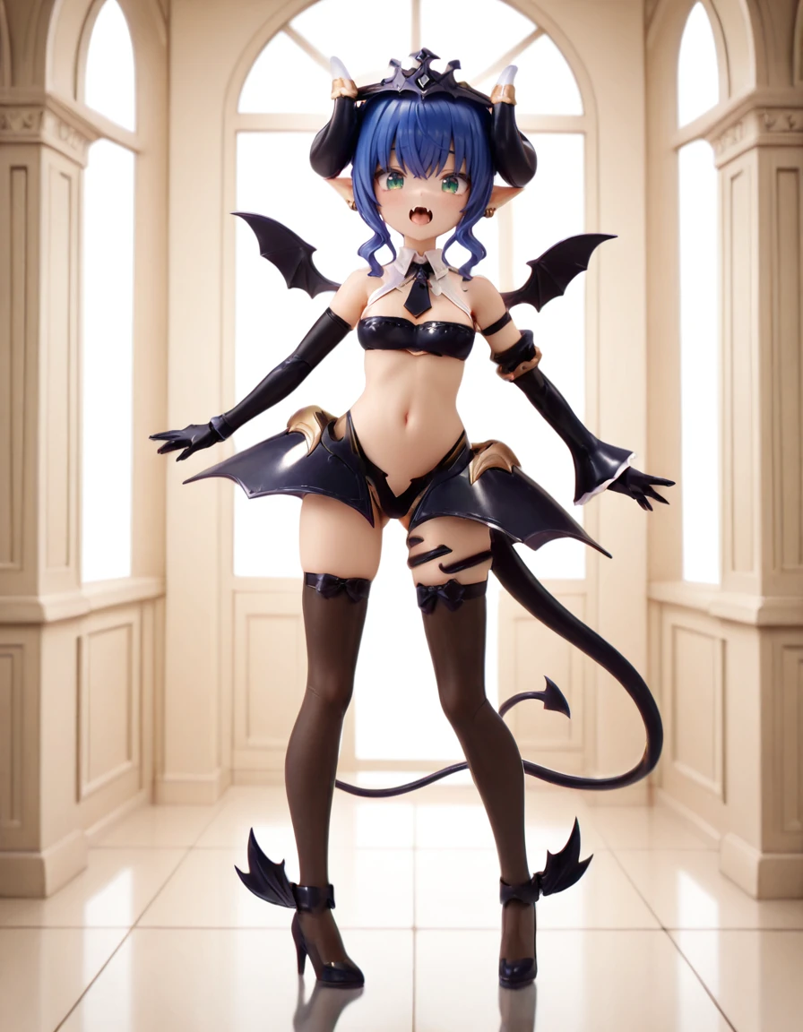 arcanadea_verlutta_Illustrious, bat wings, black footwear, black gloves, black thighhighs, blue hair, braid, demon girl, demon horns, demon tail, demon wings, detached sleeves, drill hair, earrings, elbow gloves, fangs, gloves, green eyes, hair bun, high heels, horns, jewelry, necktie, pointy ears, shoes, short hair, single hair bun, skirt, small breasts, tail, thighhighs, tiara, wings,