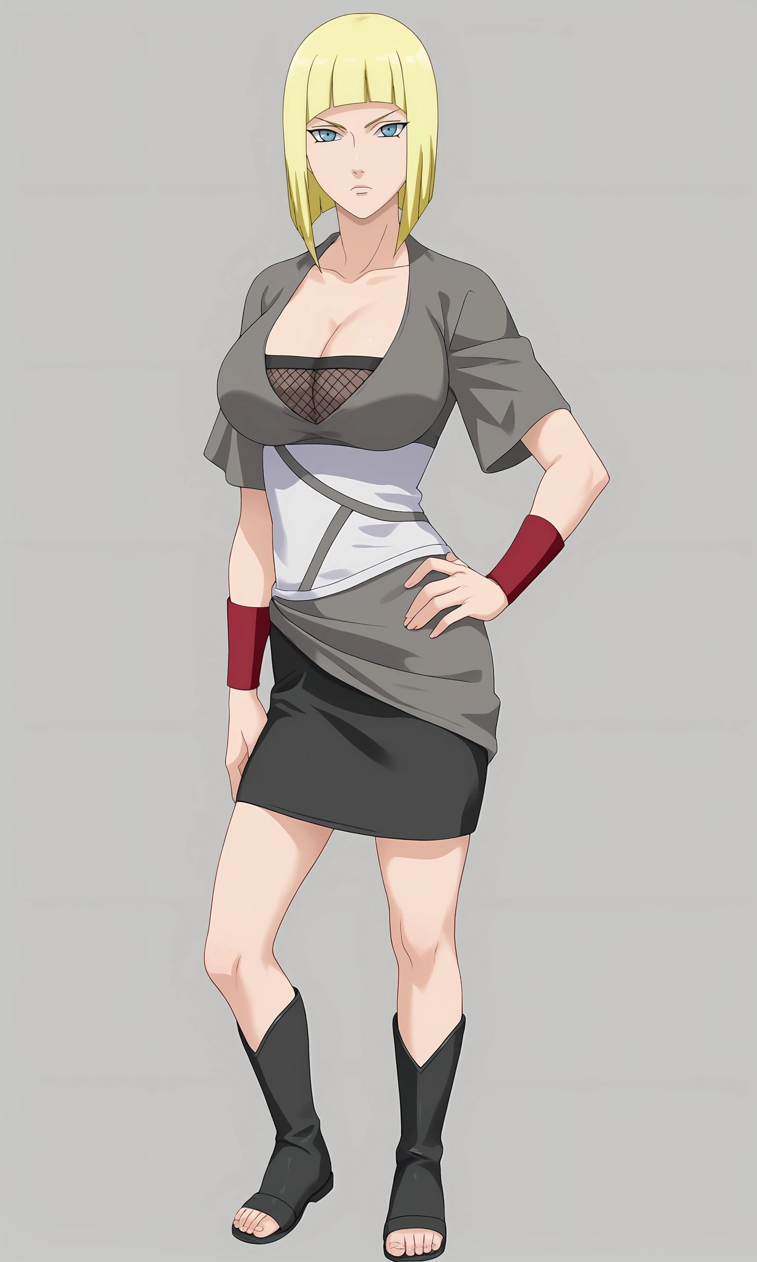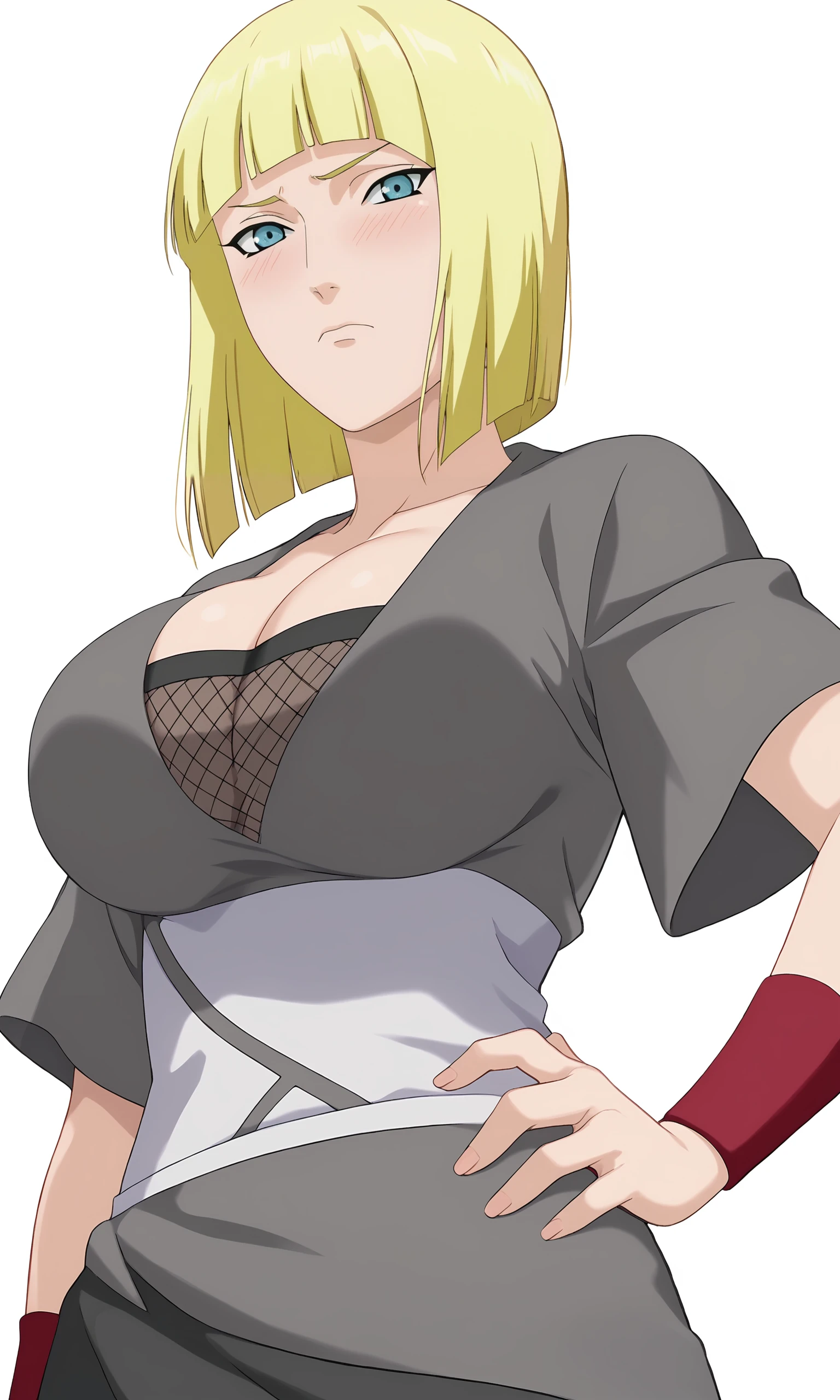samuire, 1girl, solo, looking at viewer, bob cut, short hair, blonde hair, blunt bangs, blue eyes, grey shirt, red handbands, fishnet shirt, large breasts, cleavage,
