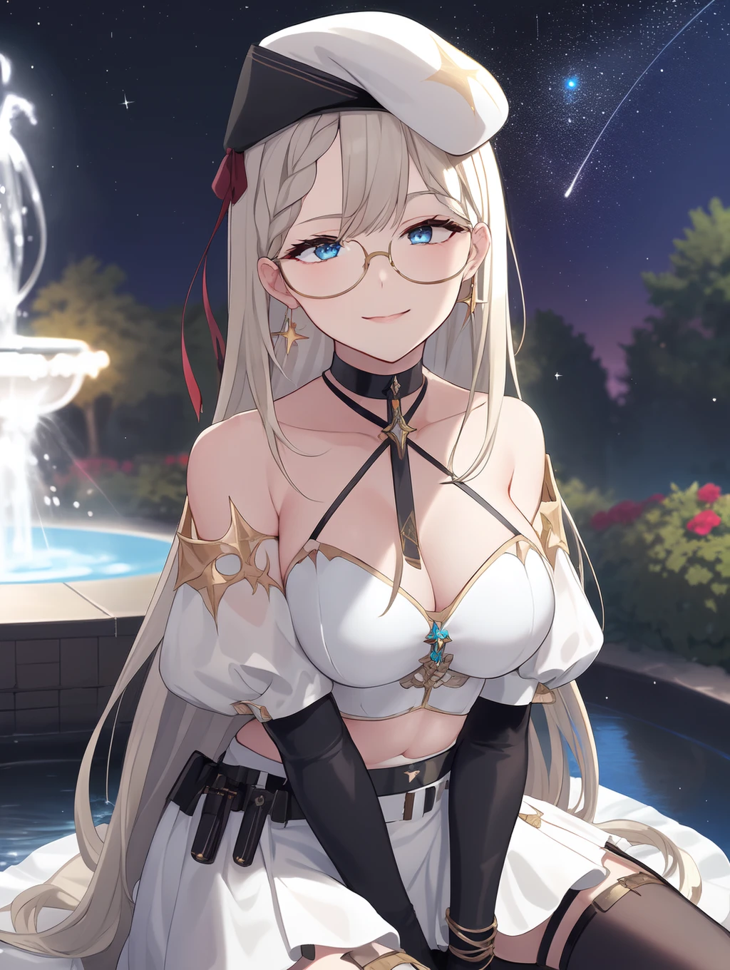 Tags: aiaamare, large breasts, platinum blonde hair, bangs, blue eyes, straight hair, long hair, white beret,hair ornament, earrings, glasses,