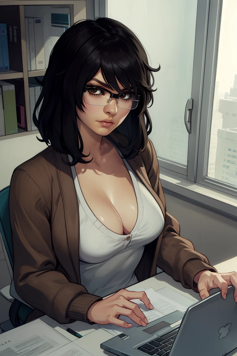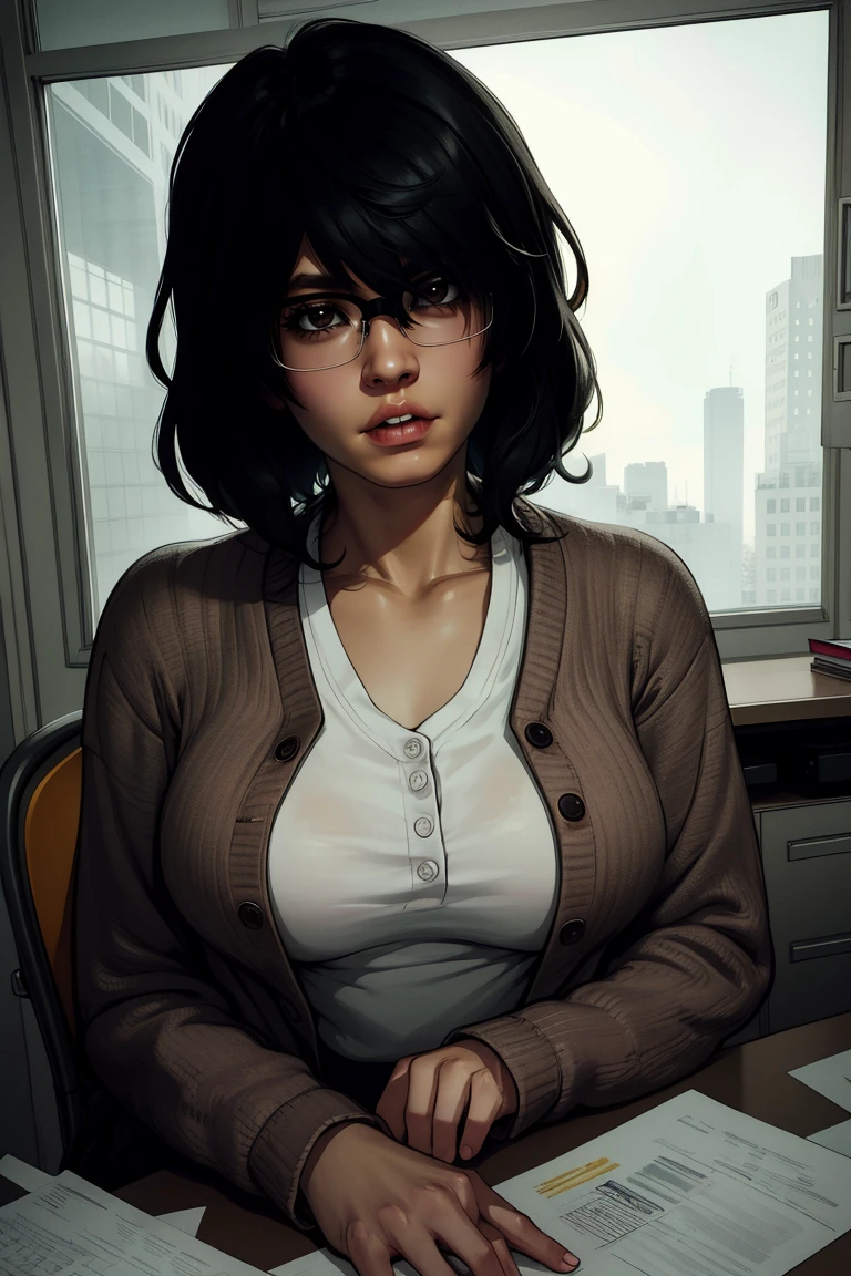 Saori, black hair, messy hair, brown eyes, ----- hair over one eyes, or medium hair,