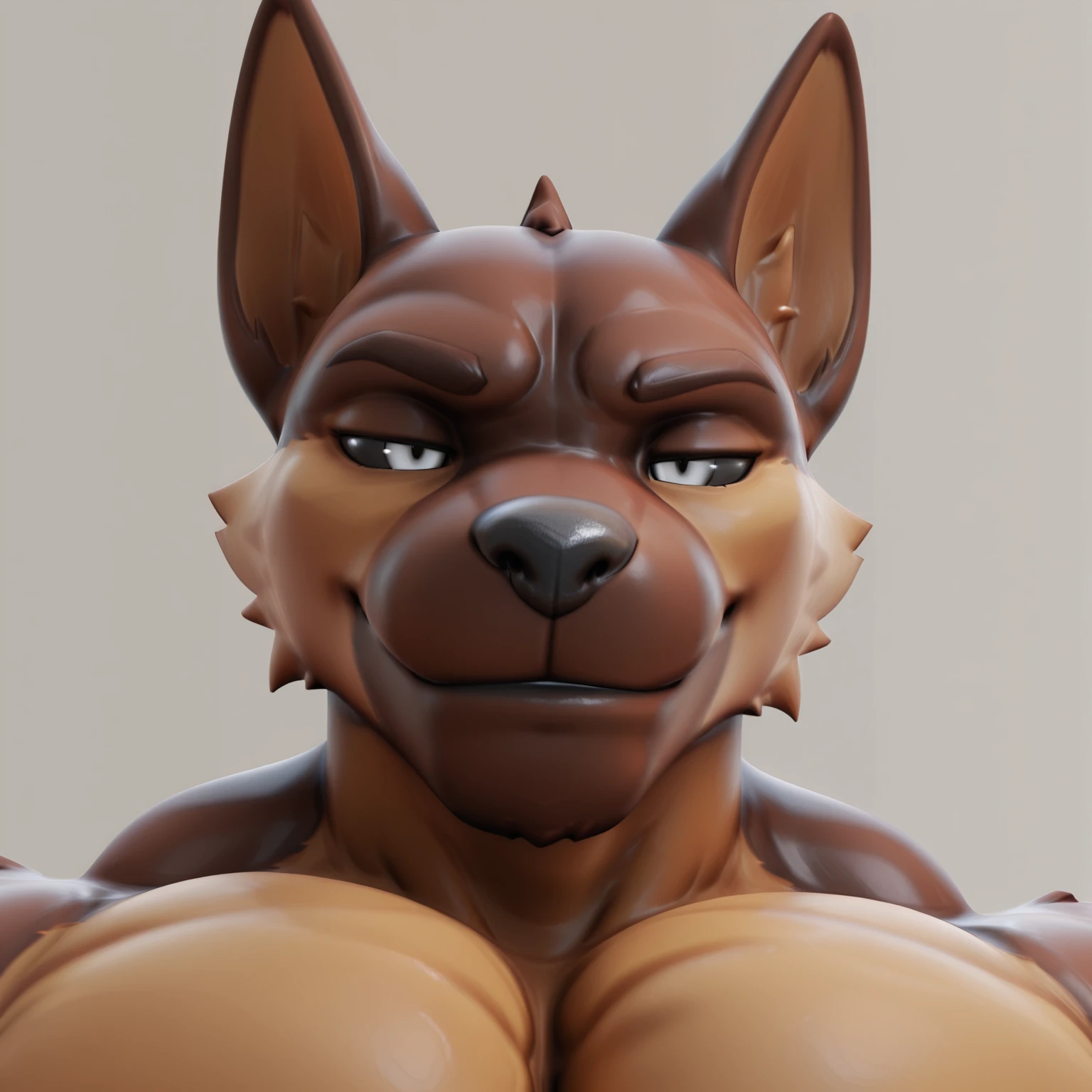 furry, anthro, dog, german shepherd, male, two tone fur, dark brown fur, dark mouth, brown fur, bald, very short hair, black sclera, white eyes, black_eyebrows, black nose, black_lips, cut_ear, black_, muscular male, large pectorals