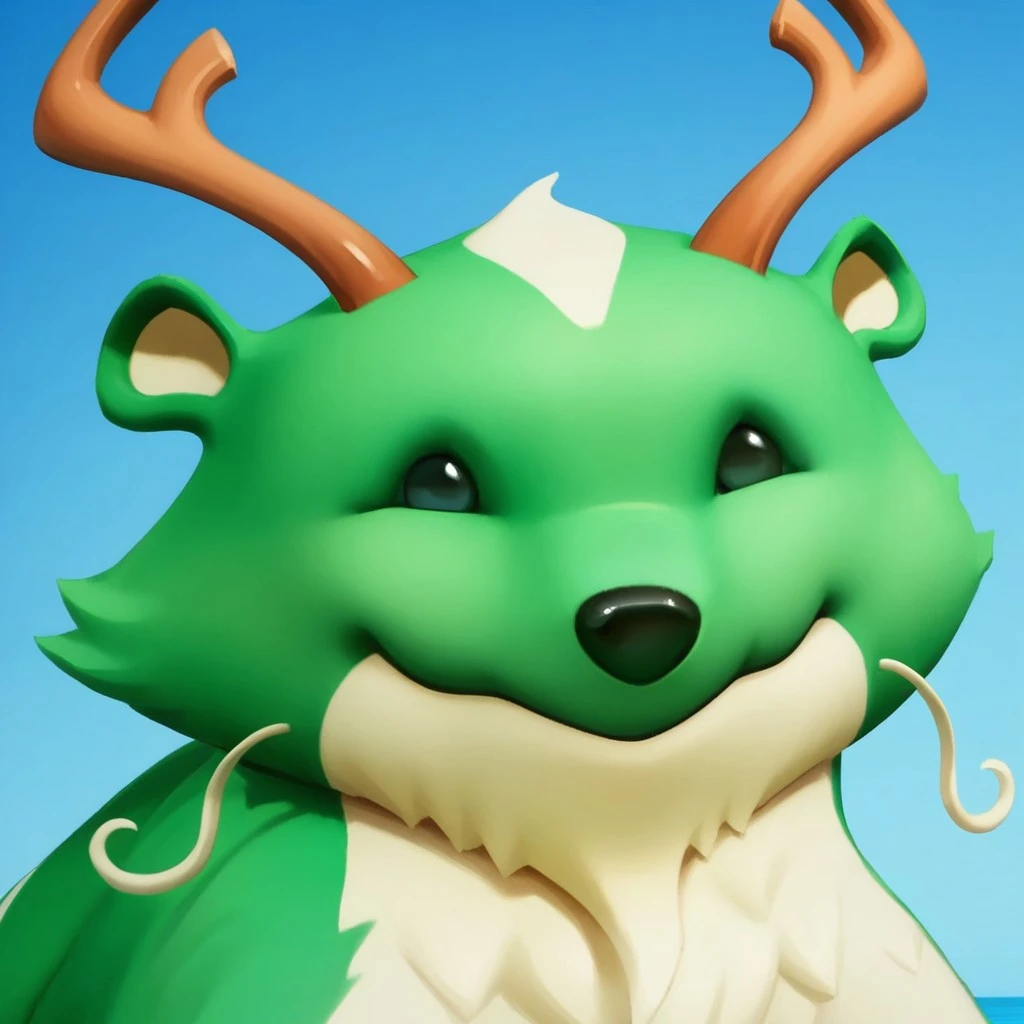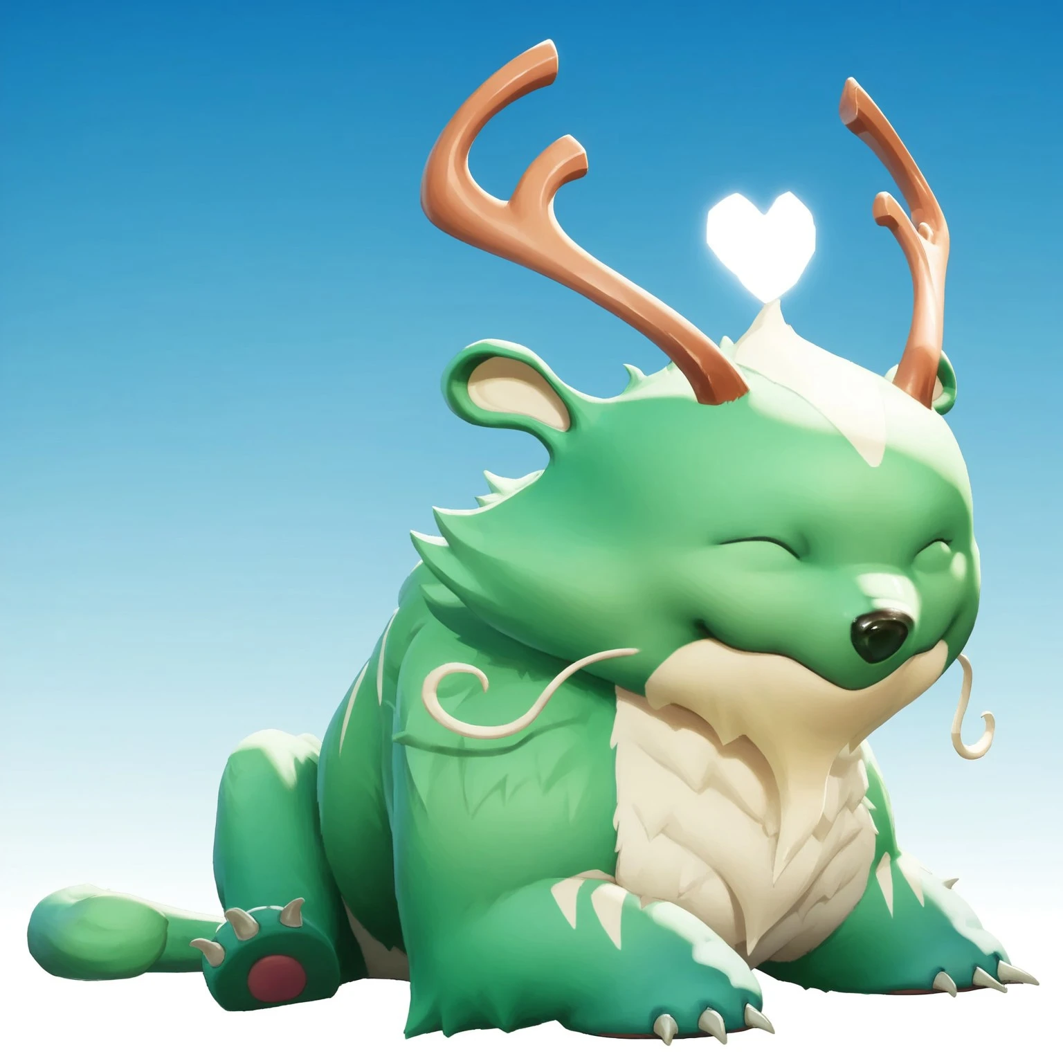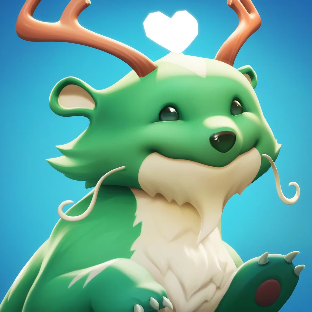 Positive Prompts: ReindogMV, furry, feral, canine, reindeer, hybrid, antlers, floating heart, black eyes, black nose, white inner ear, white whiskers, green body, green fur, white body, white fur, green tail