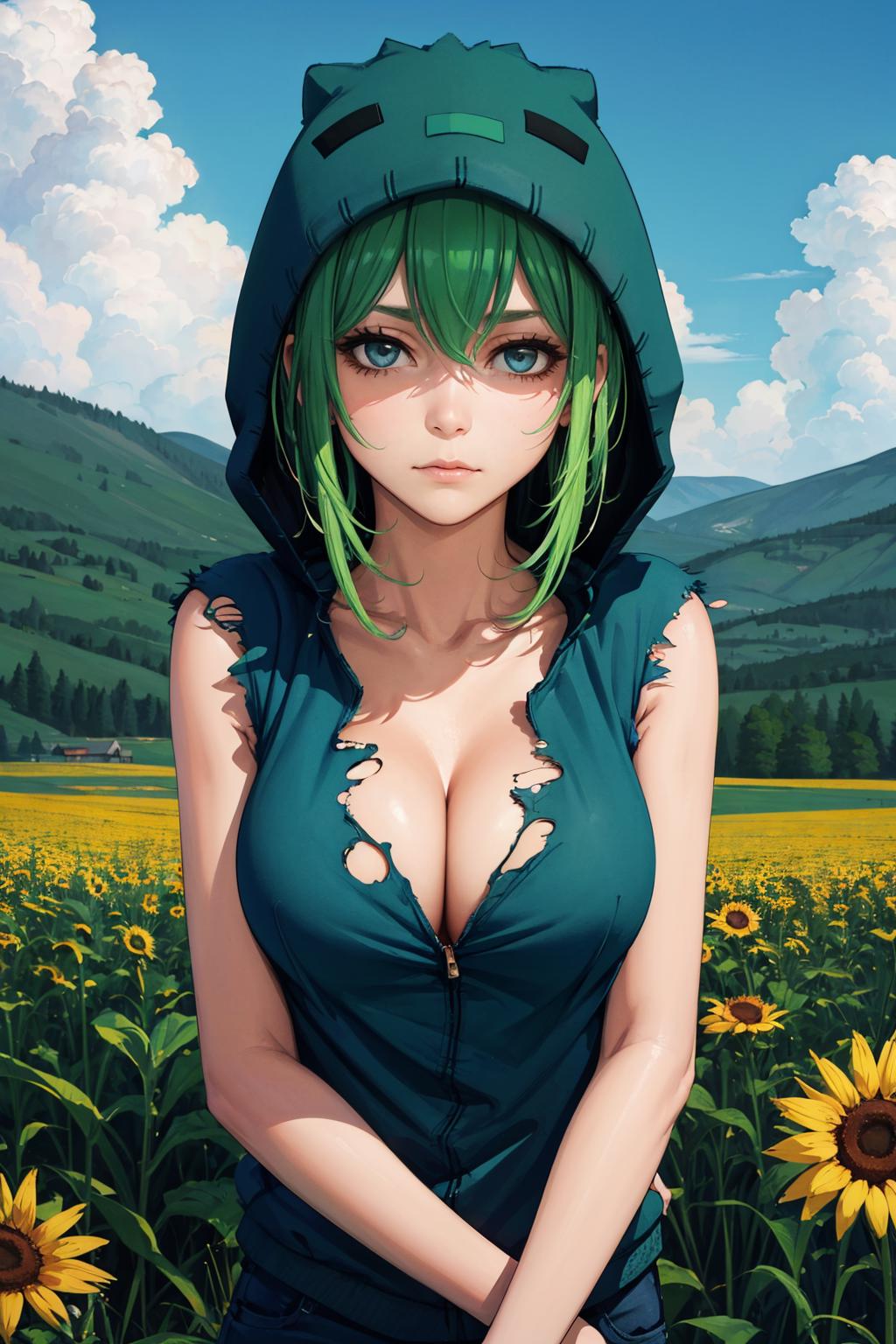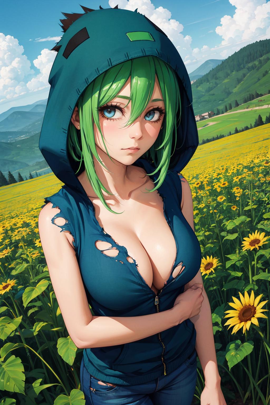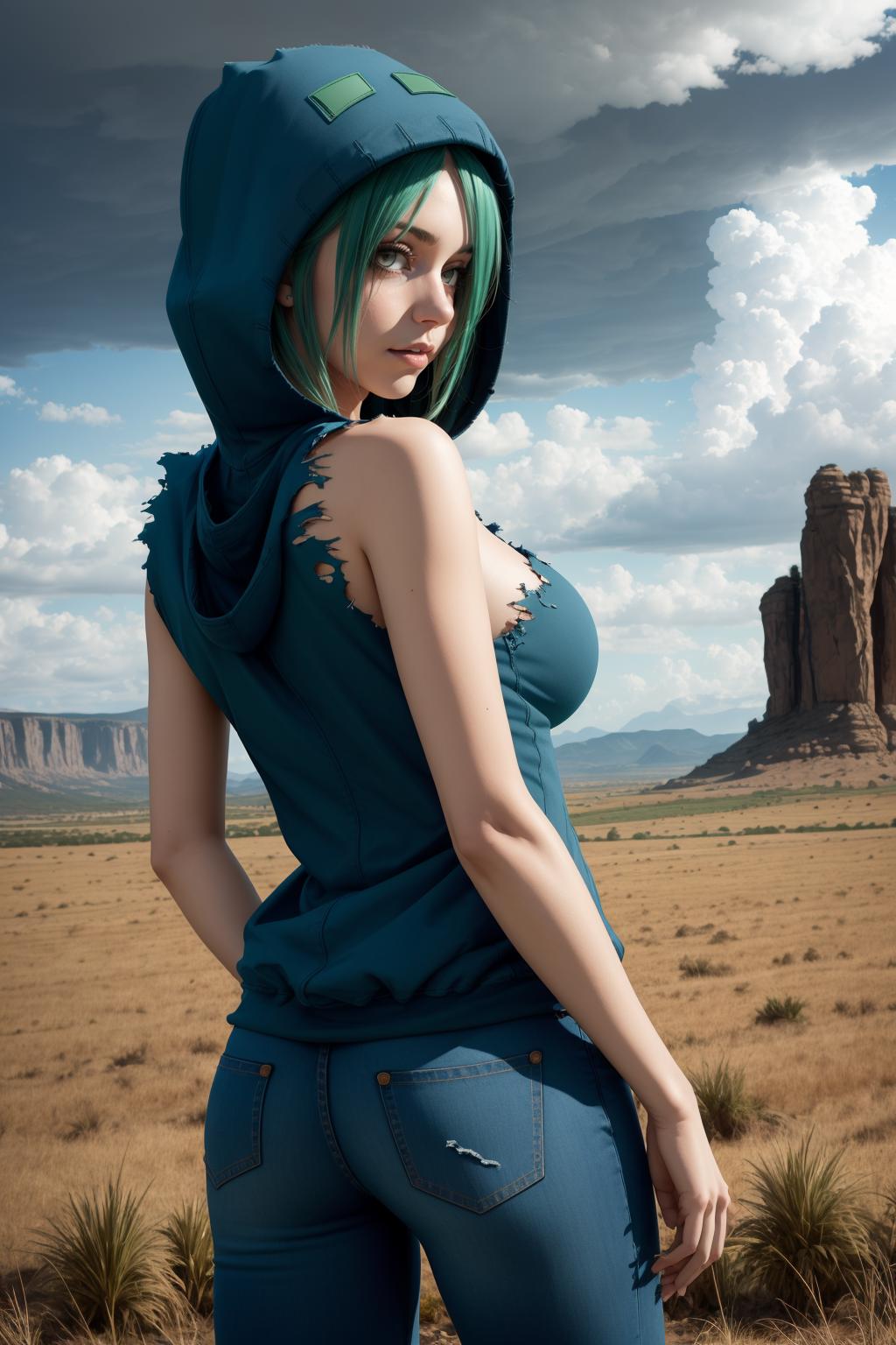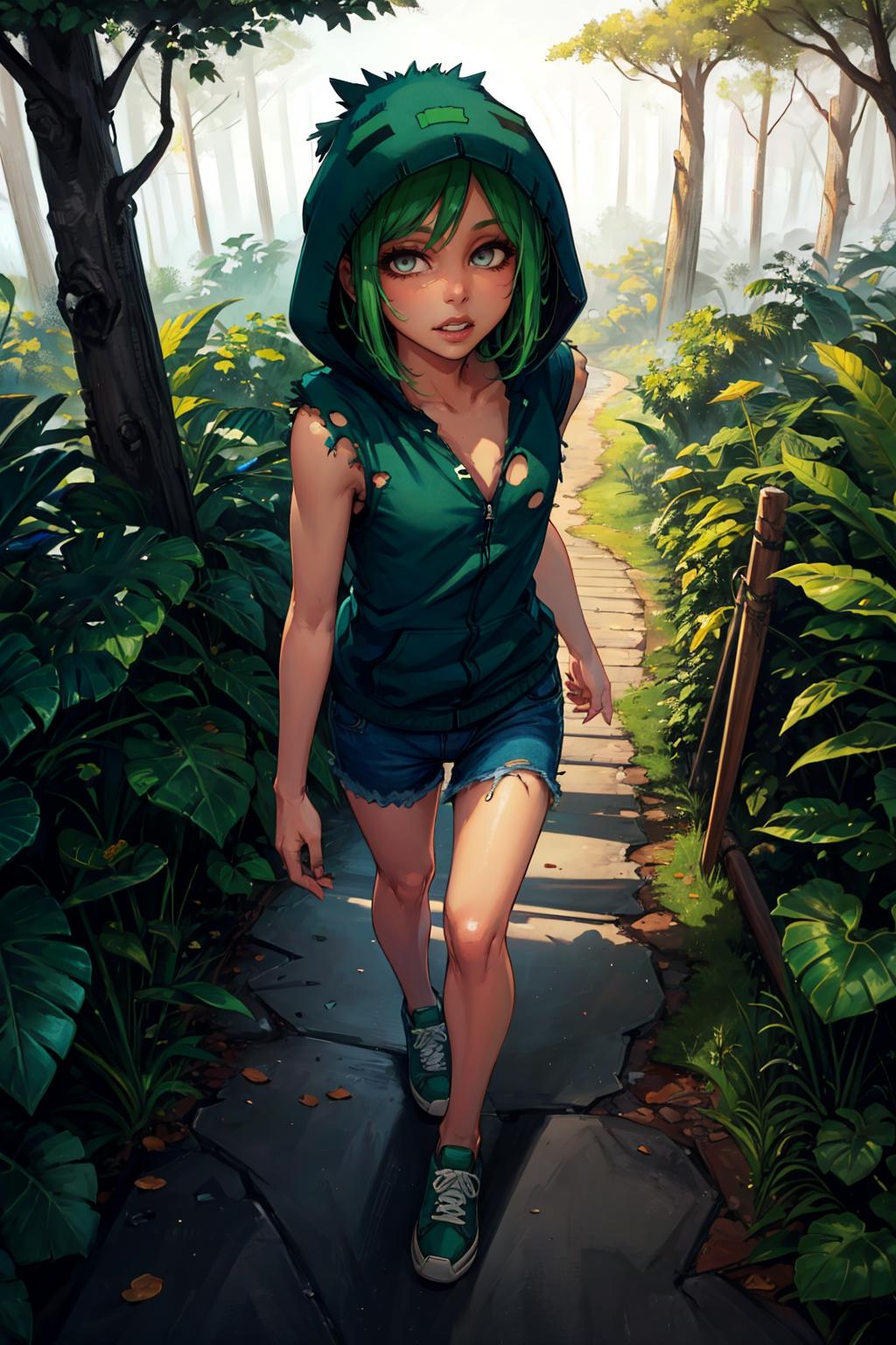 Add "hoodie, jeans, sneakers, torn clothes, sleeveless" for her typical look.