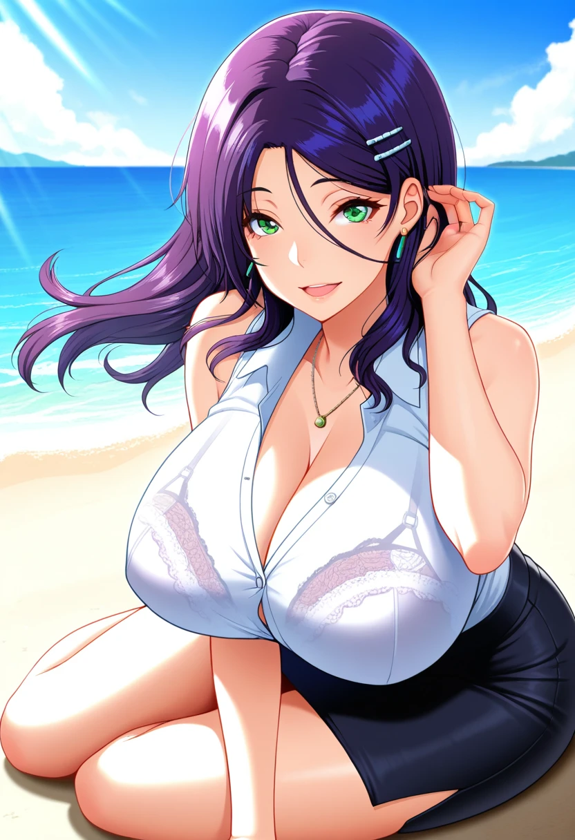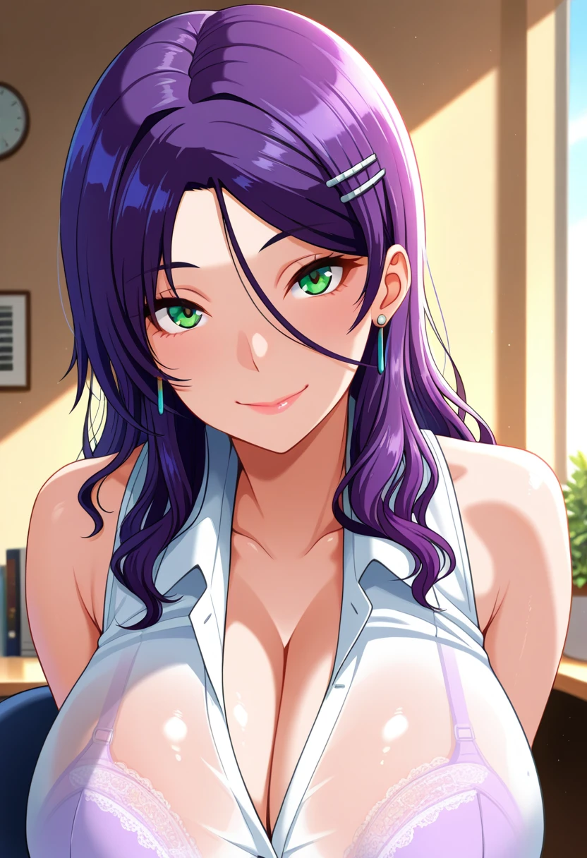 aikoww, mature female, curvy, green eyes, purple hair, long hair, hair between eyes, lips, huge breasts, hairclip, earrings, wedding ring,