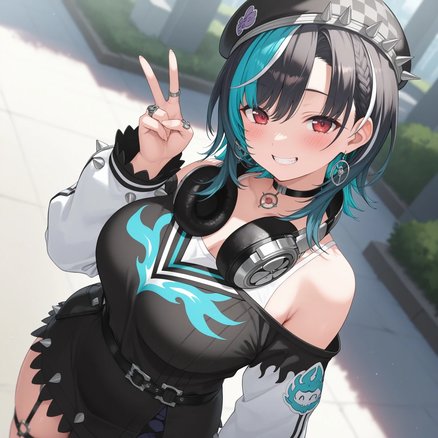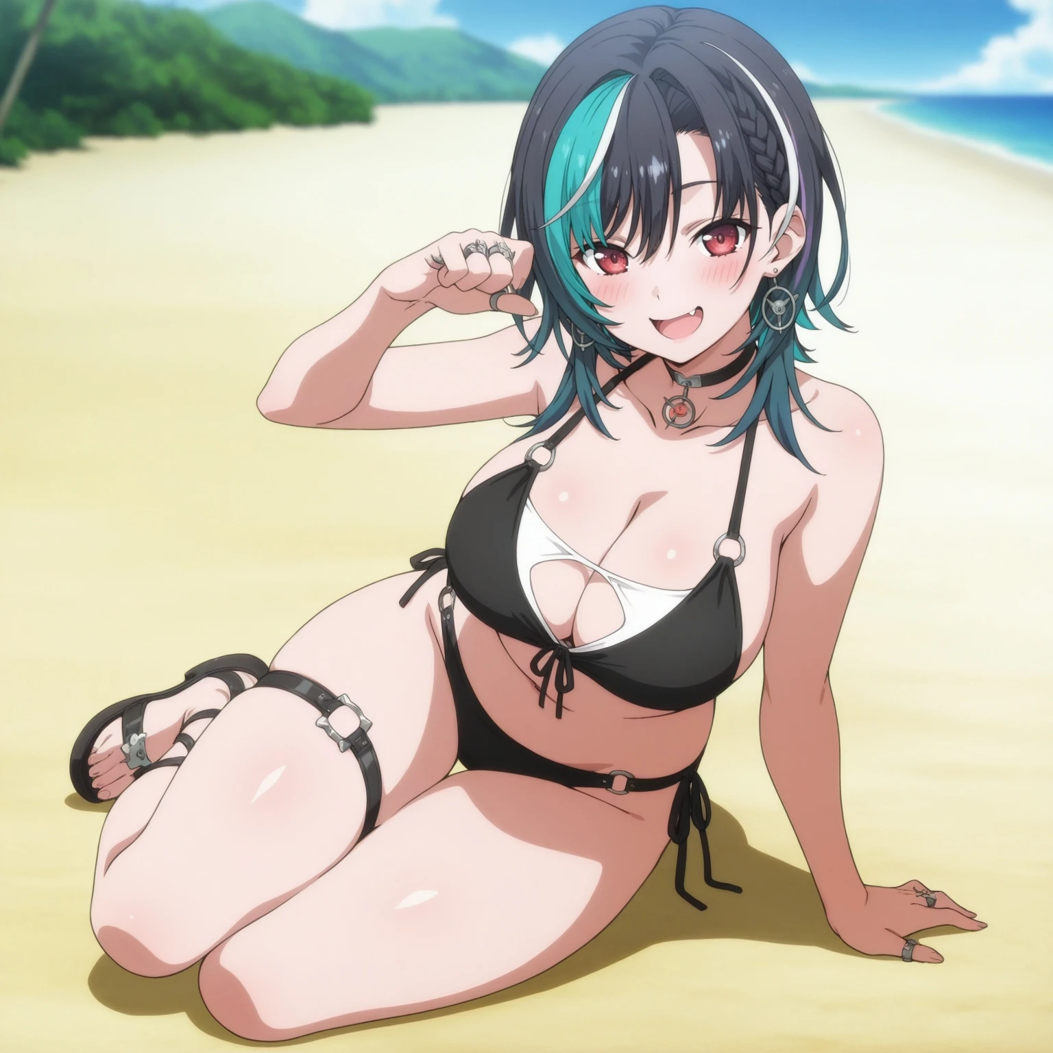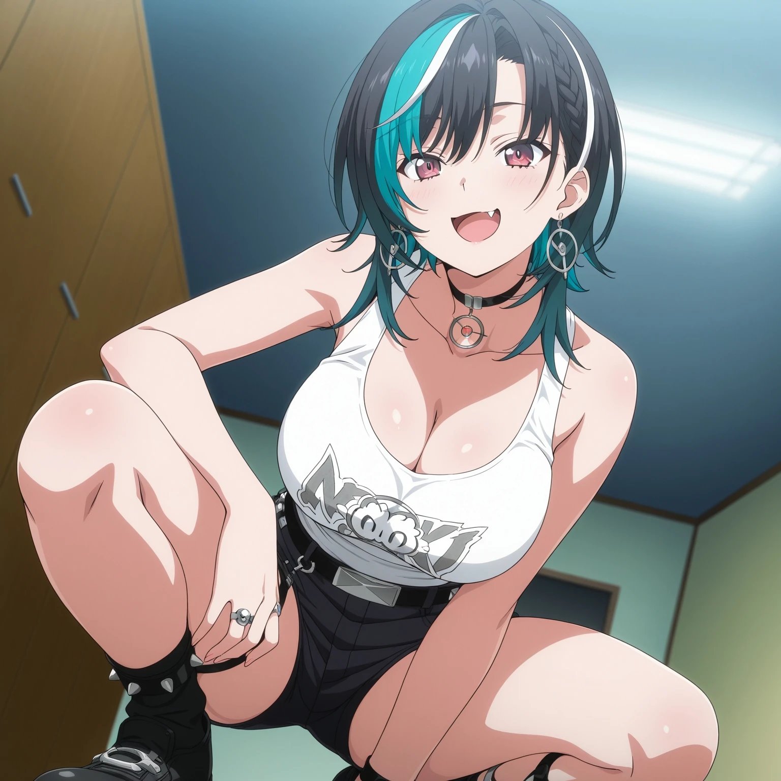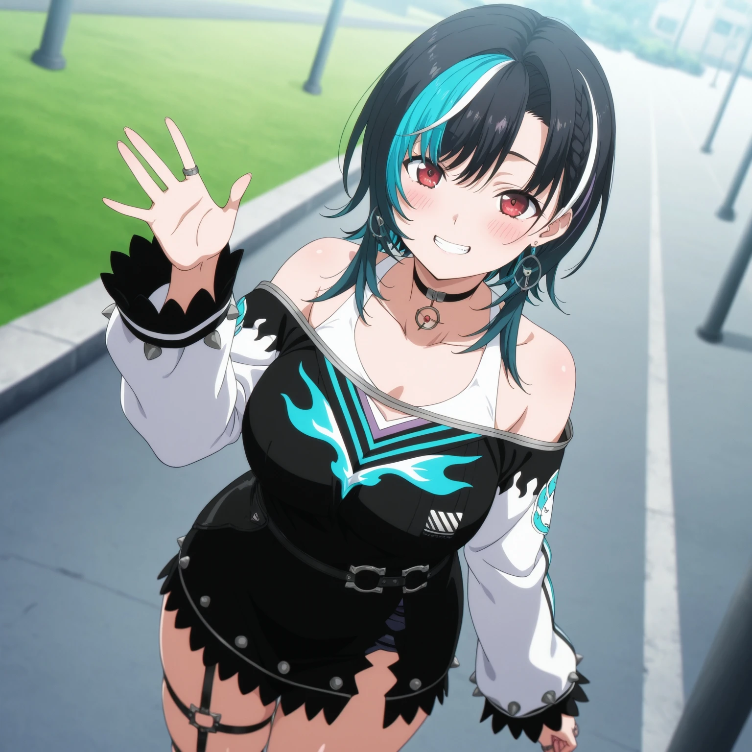 multicolored hair,red eyes,earrings,black choker,ring,single garter strap,thigh strap,black footwear