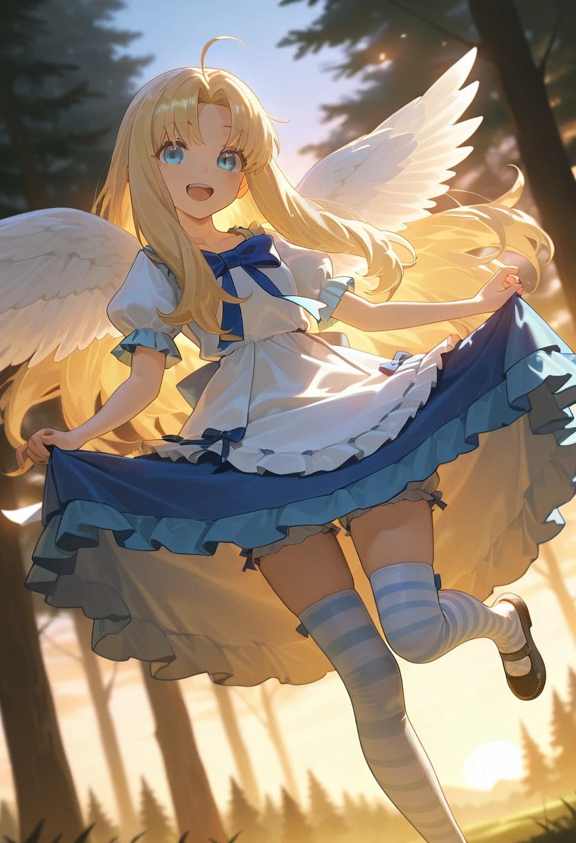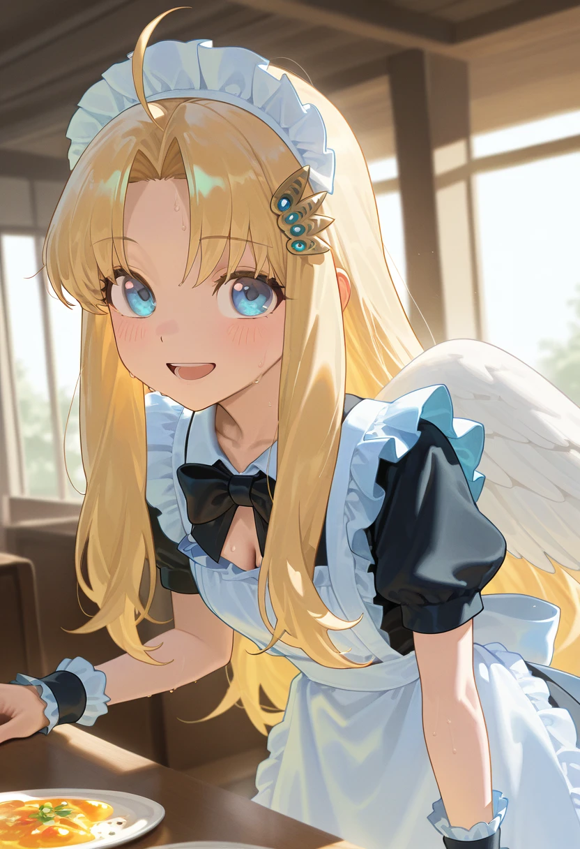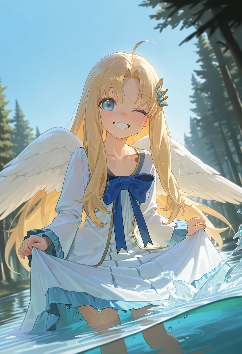 1girl, long hair, blue eyes, blonde hair, hair ornament, very long hair, ahoge, parted bangs, feathered wings, white wings, bird wings, collarbone,
