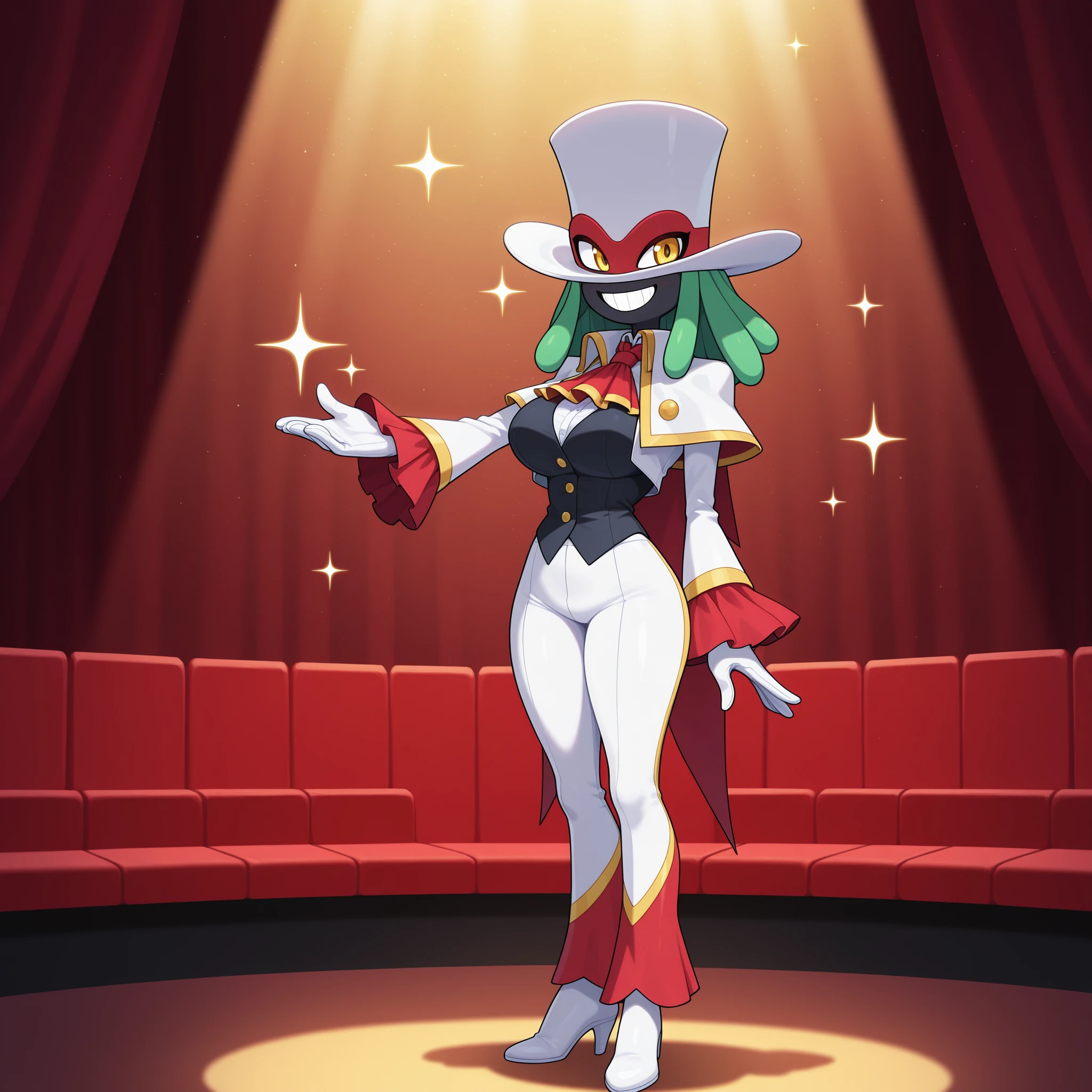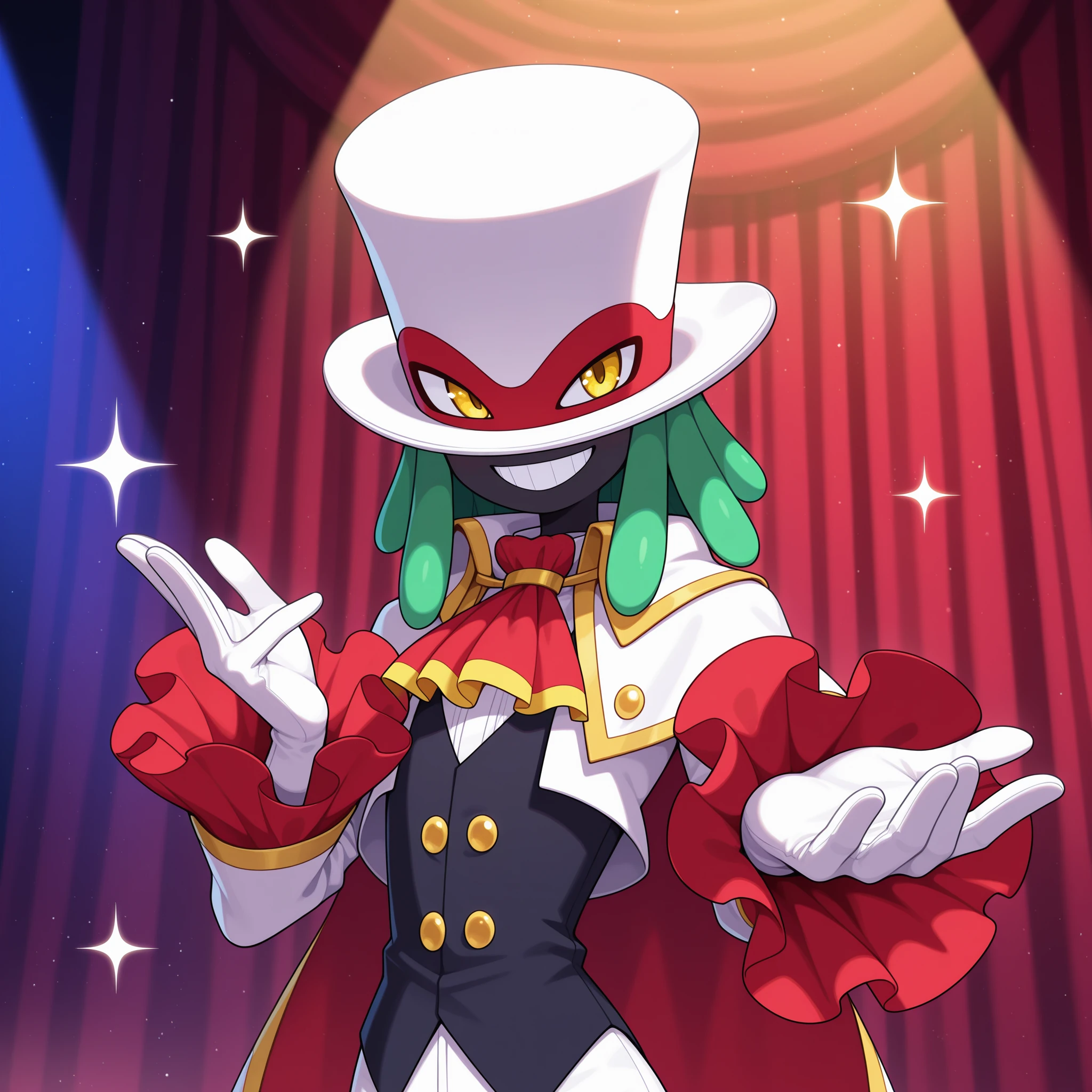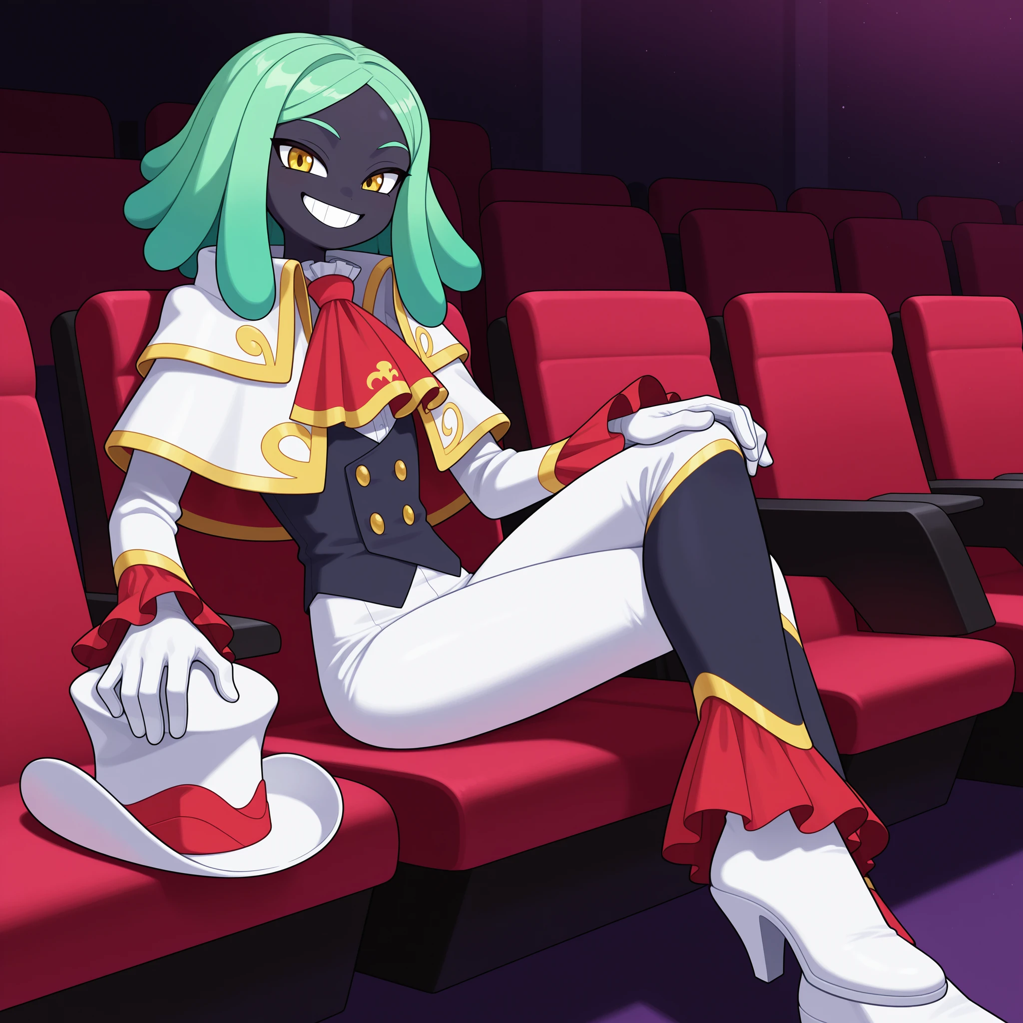 balanbw, black skin, hat over eyes, two-tone hat, top hat, white hat, red hat, dreadlocks, green hair, yellow eyes, two-sided cape, two-tone ascot, red ascot yellow ascot, capelet, black vest, cropped jacket, two-tone jacket, white jacket, yellow jacket, red frilled sleeves, white gloves, multicolored pants, white pants, red pants, black pants, yellow pants, white low block heels