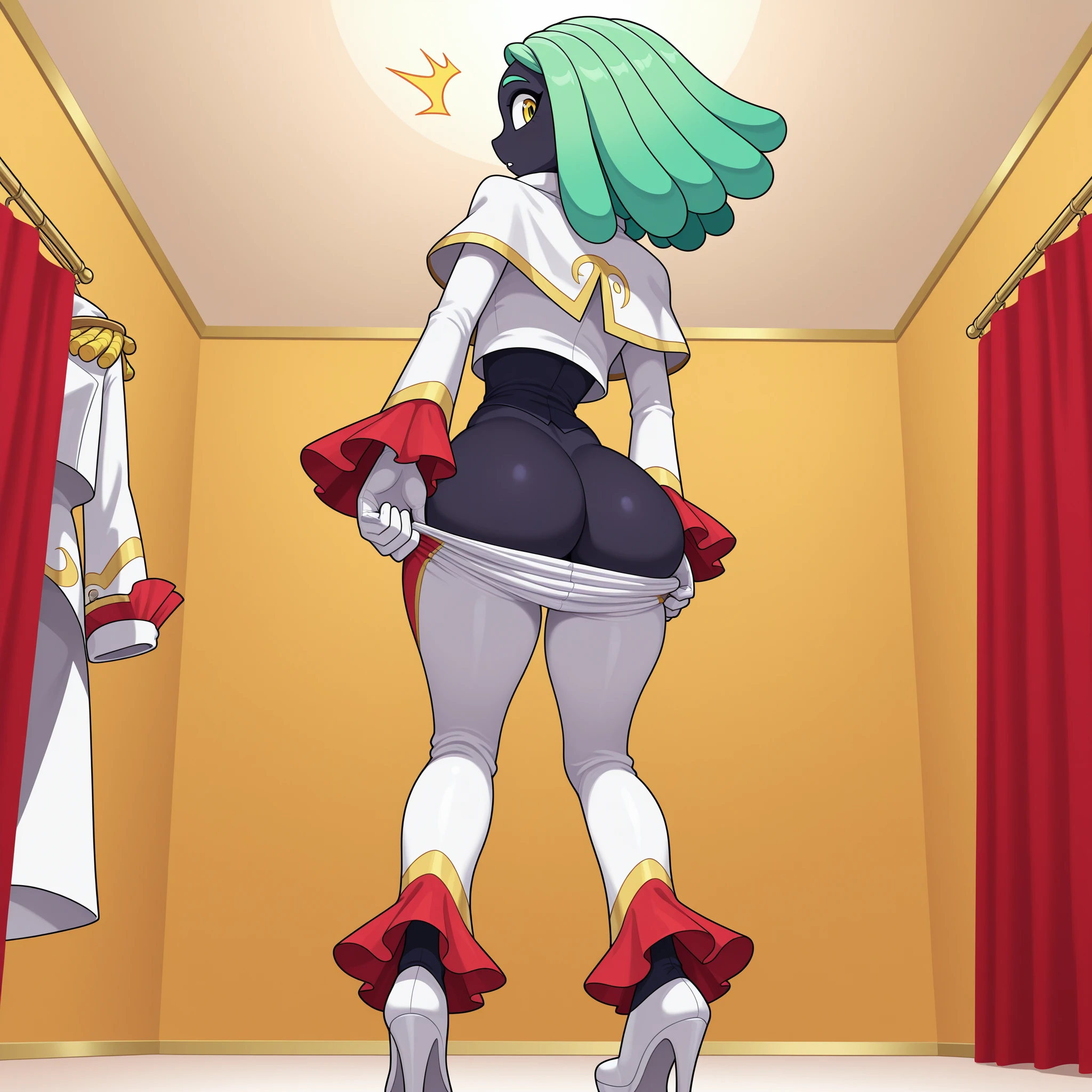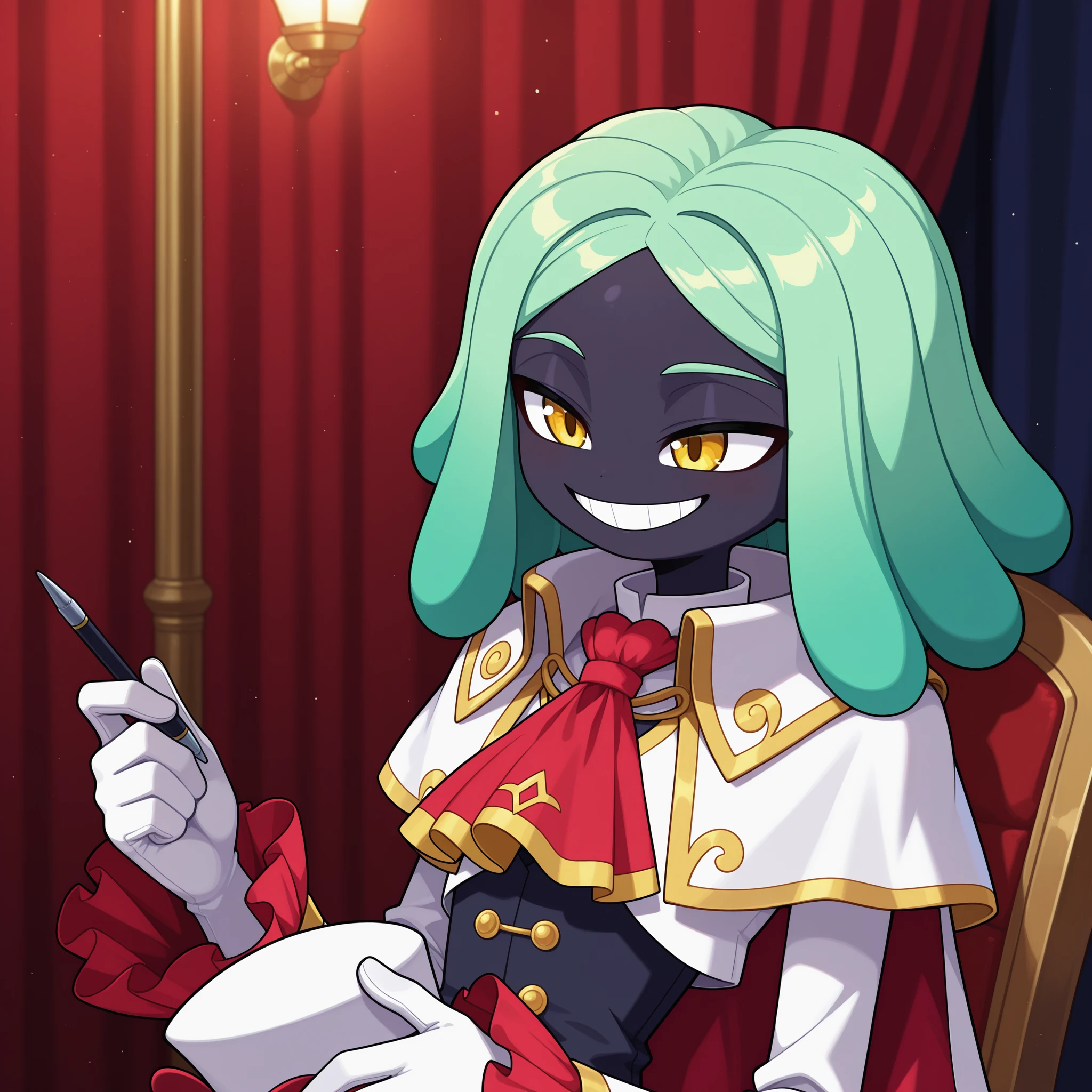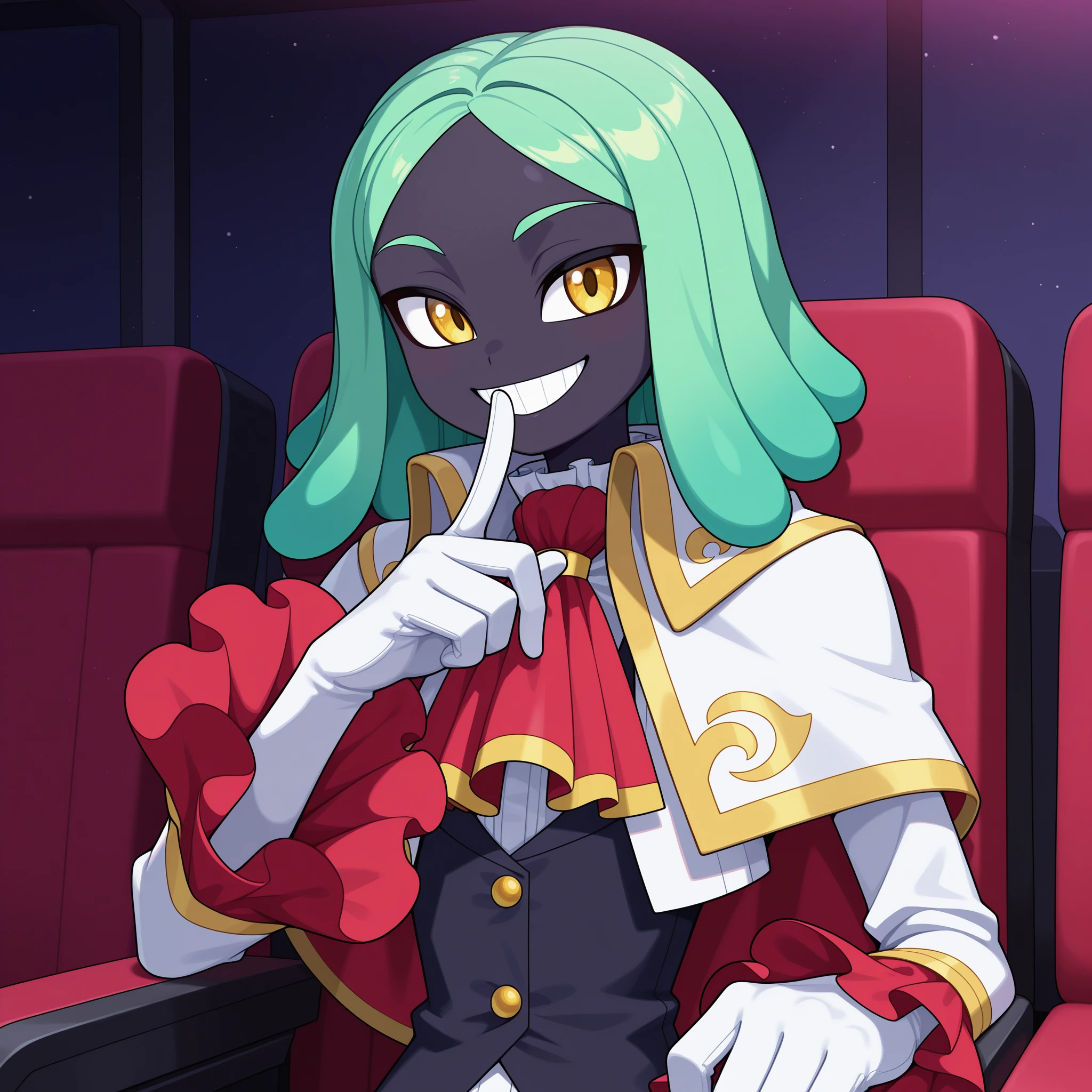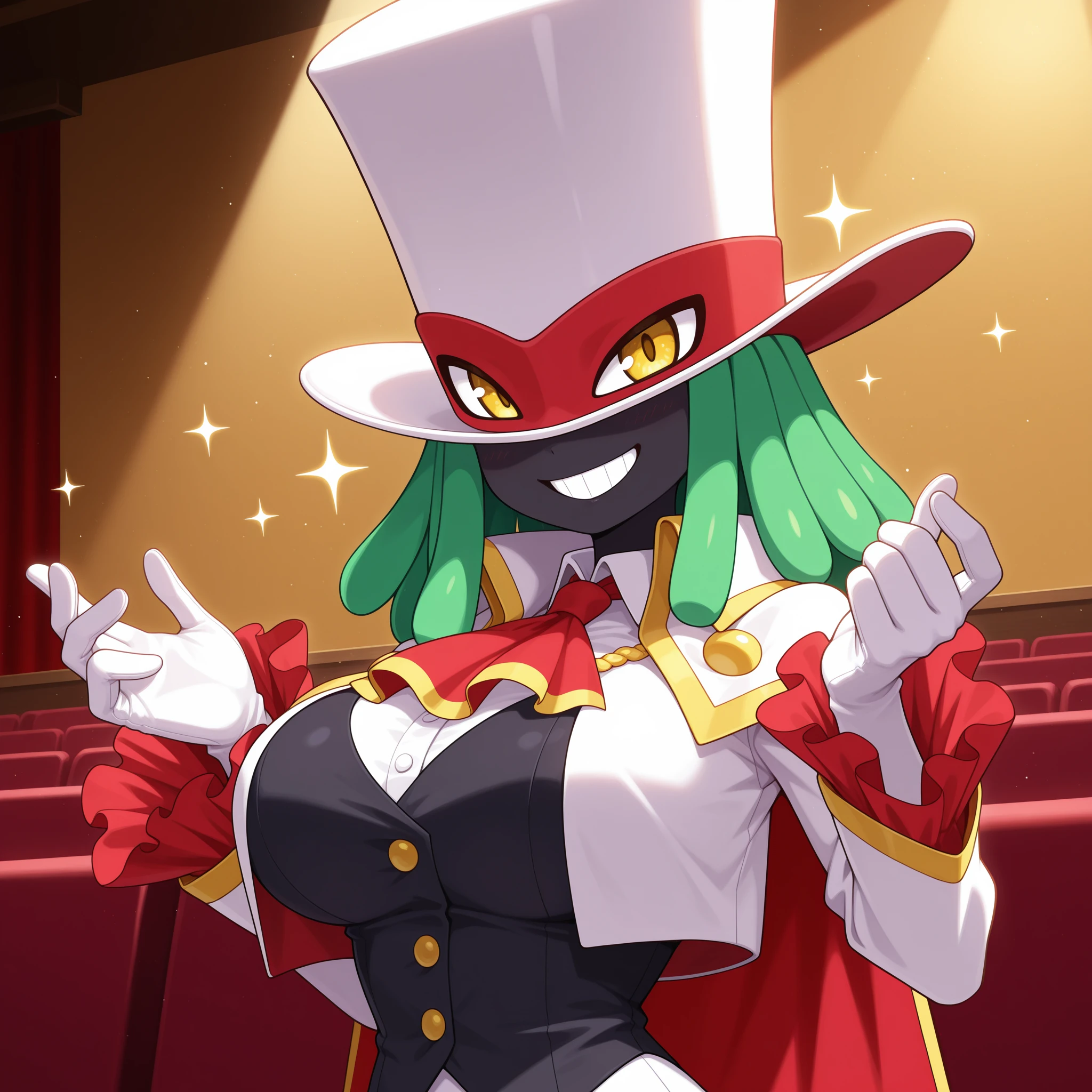 balanbw, black skin, hat over eyes, two-tone hat, top hat, white hat, red hat, dreadlocks, green hair, yellow eyes, two-sided cape, two-tone ascot, red ascot yellow ascot, capelet, black vest, cropped jacket, two-tone jacket, white jacket, yellow jacket, red frilled sleeves, white gloves, multicolored pants, white pants, red pants, black pants, yellow pants, white low block heels