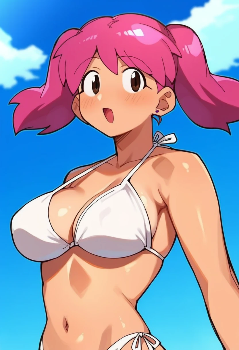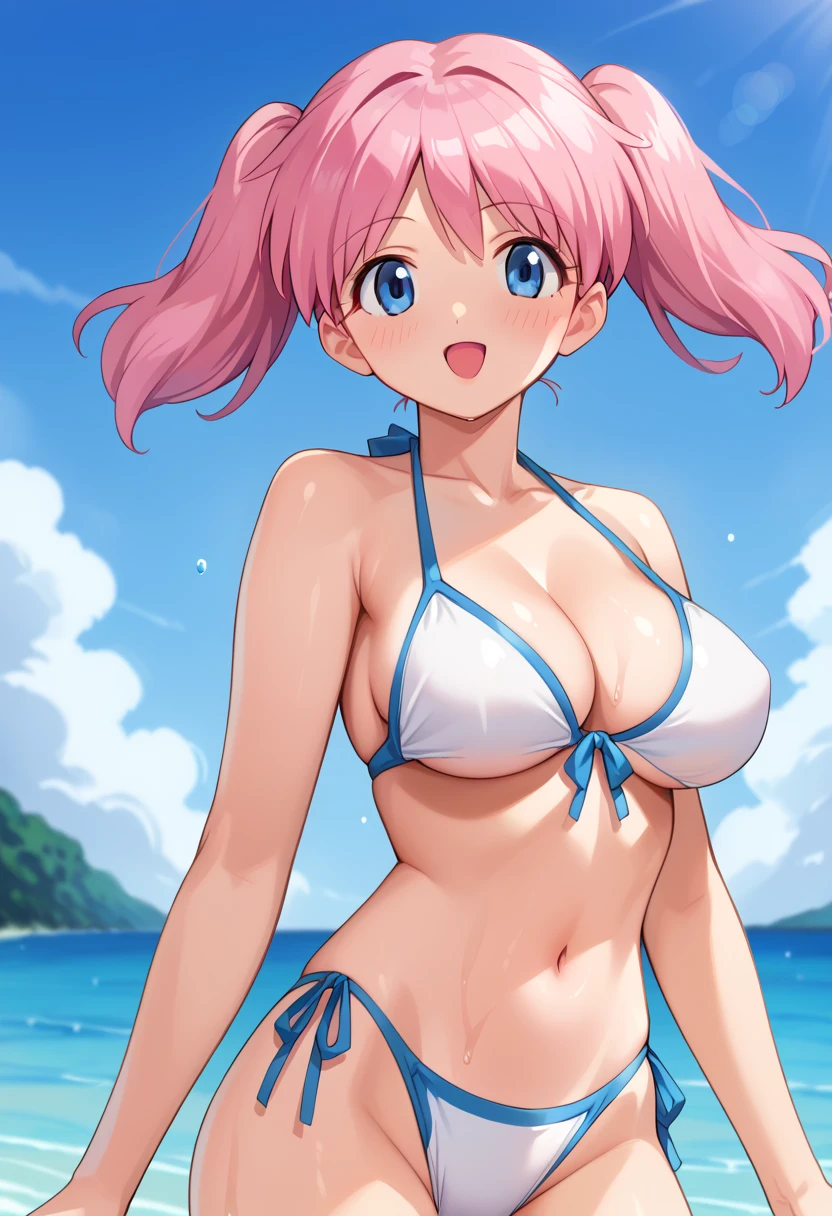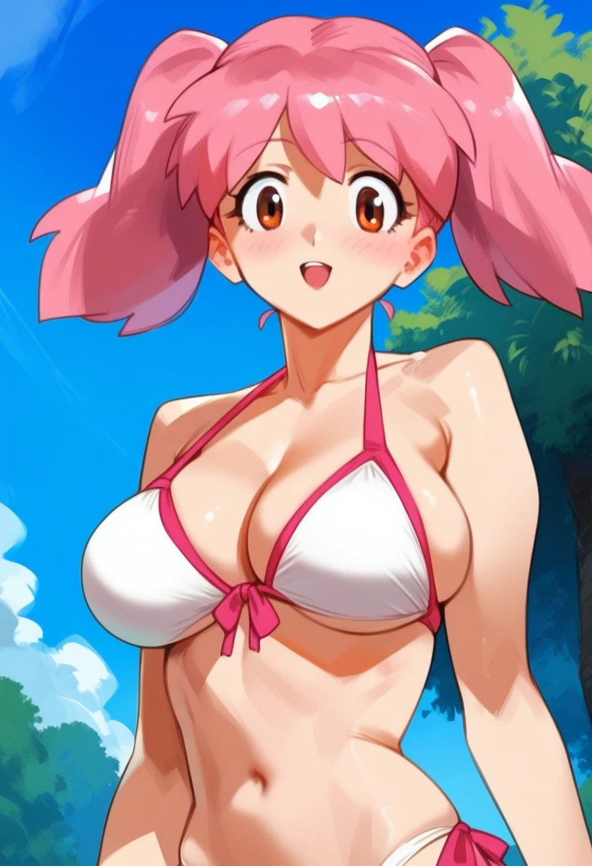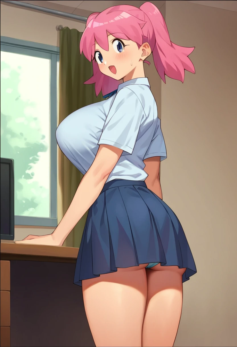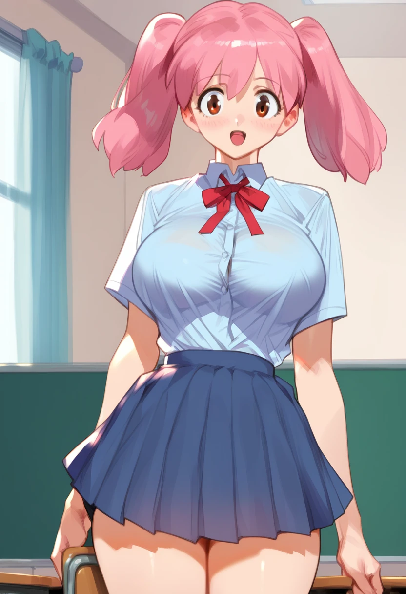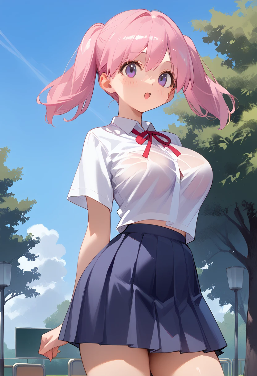 hinatanatsumi, twintails, pink hair female, large breasts, shirt, skirt