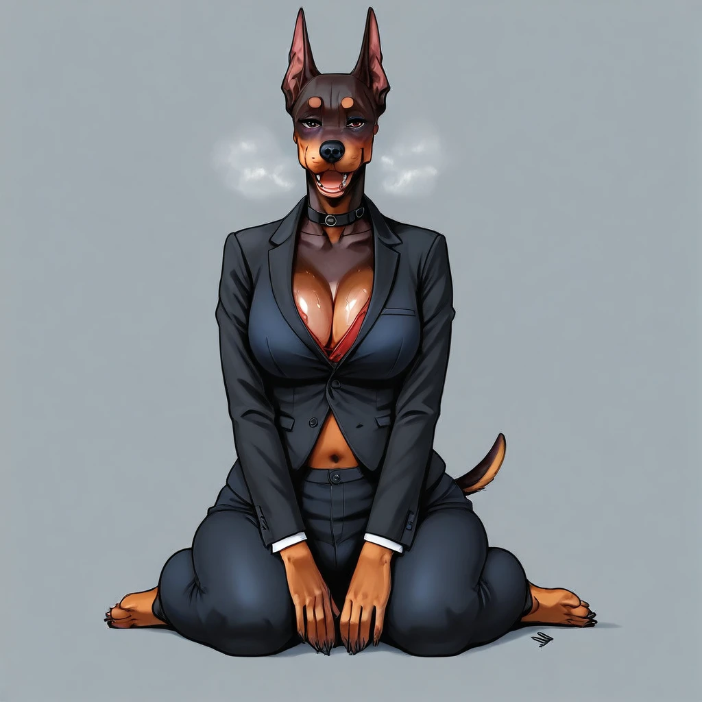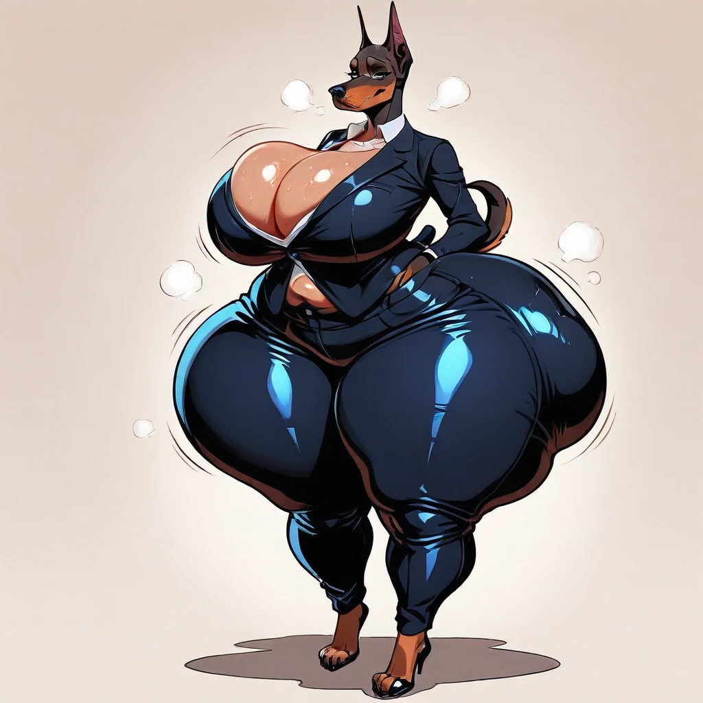 anthro Doberman, Doberman ears, Doberman tail, huge breasts, thick thighs, anthro dog,