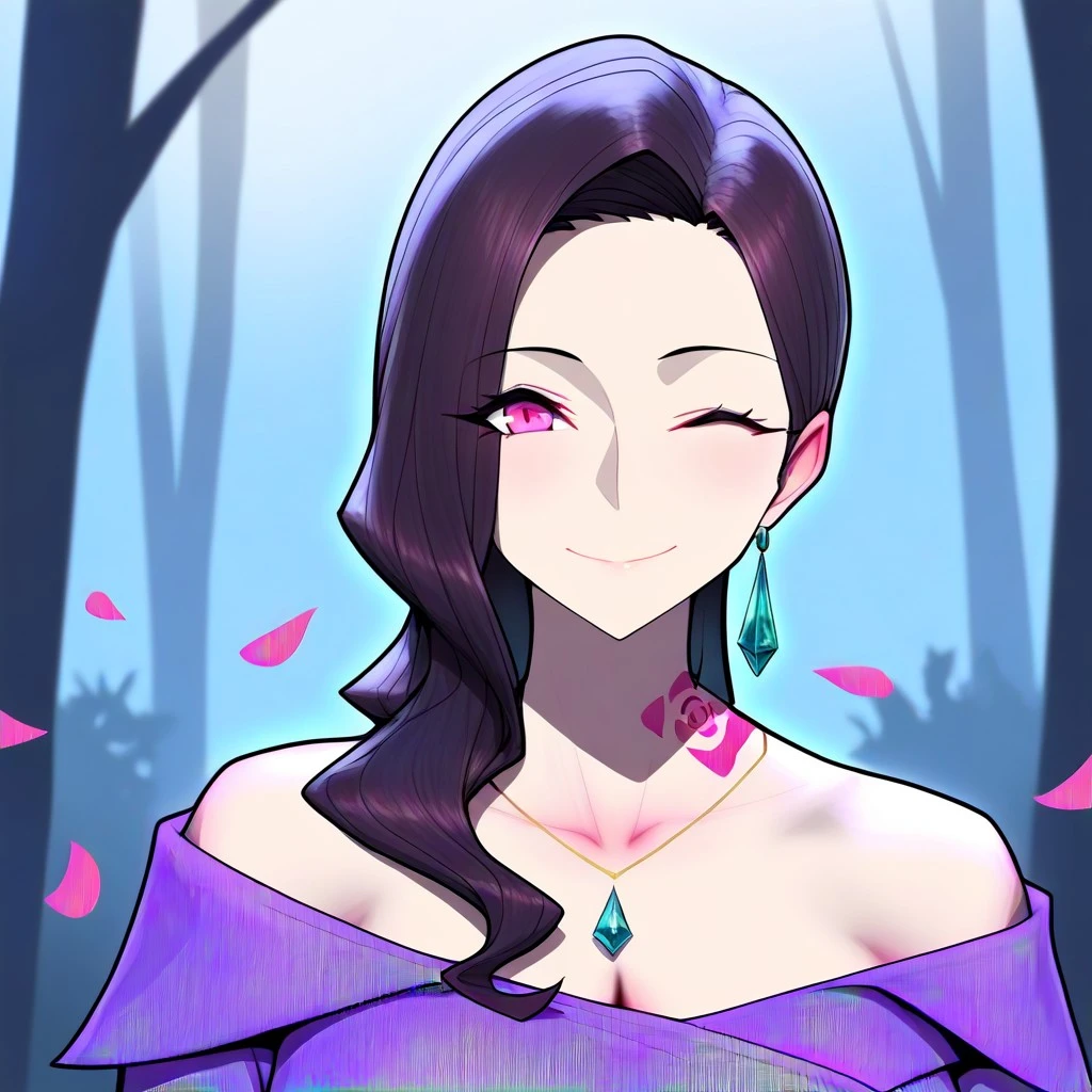 black hair, pinkish purple eyes, reddish pink eyes, rose tattoo