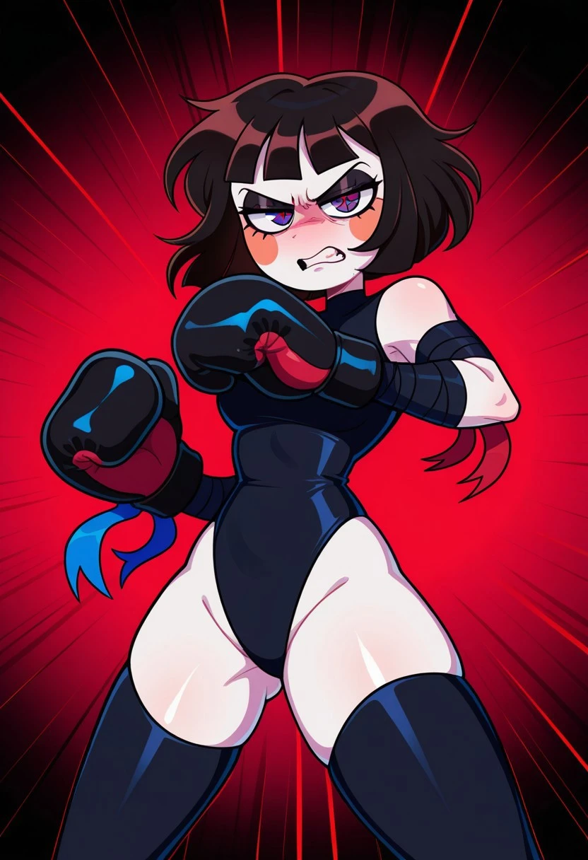 black leotard, bandaged arms, black thighhighs
