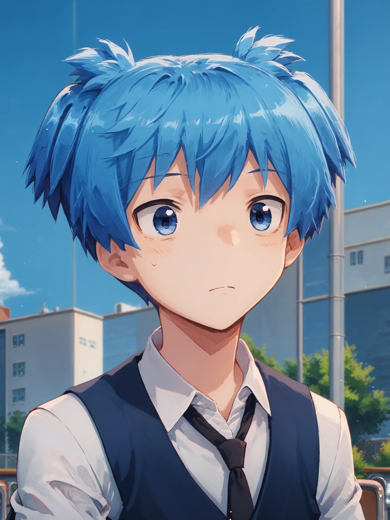 1boy, Nagisa Shiota, blue hair, school uniform, blue vest, dark blue eyes, grey pants, short twintails, black tie