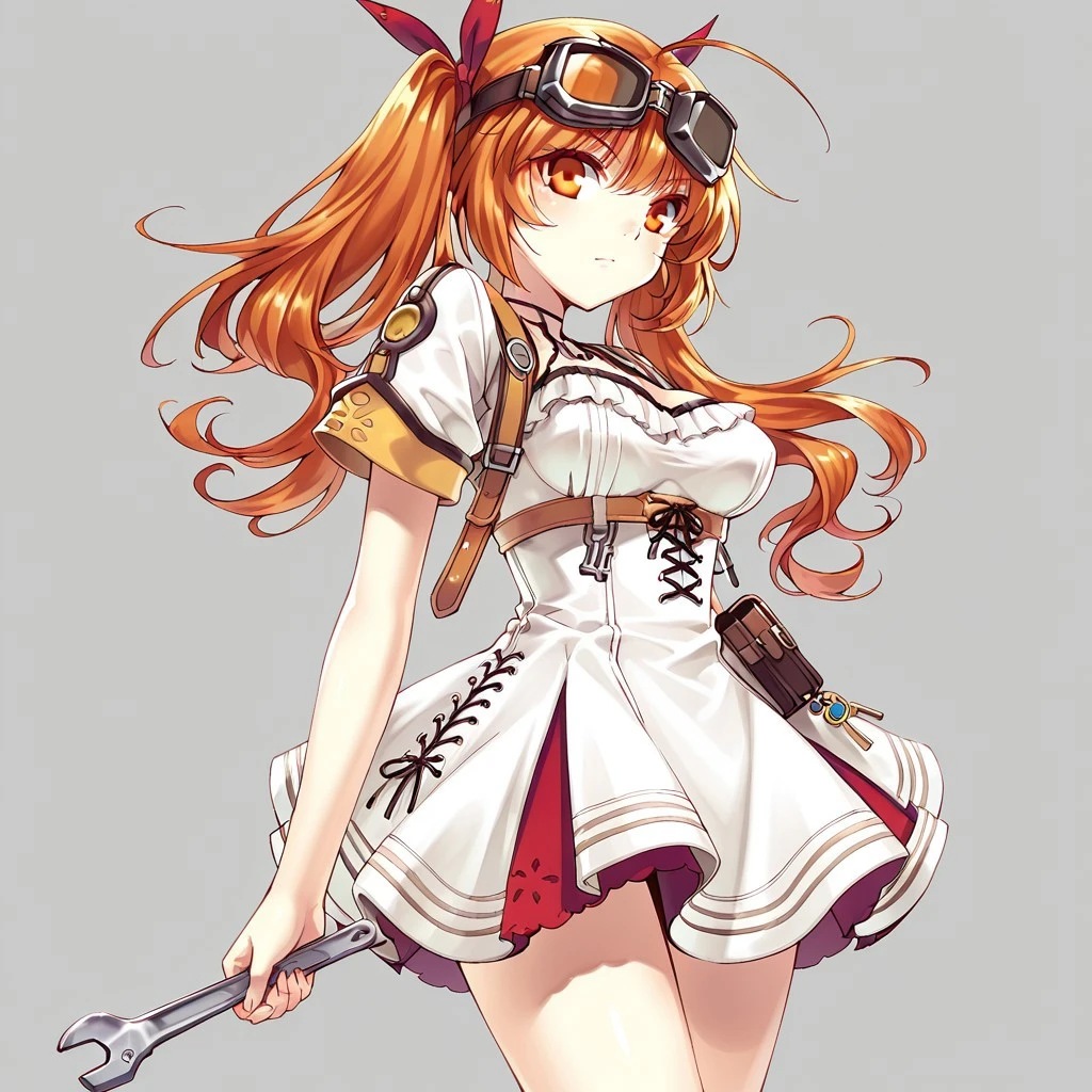 Lyedia: BlaSou, Lyedia, orange hair, long hair, twintails, ahoge, orange eyes, medium breasts, goggles on head