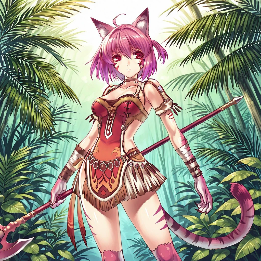 Sciora: BlaSou, Sciora, pink hair, short hair, side ponytail, ahoge, red eyes, beast limbs, animal ears, cat tail, tiger tail, medium breasts, abs, facial tattoos