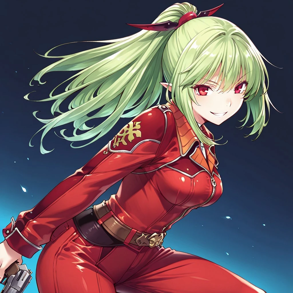 Liza: BlaSou, Liza, green hair, long hair, ponytail, red eyes, medium breasts, pointy ears