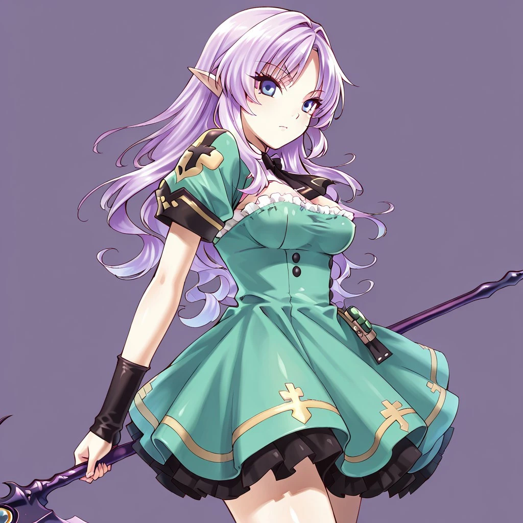 Bridget: BlaSou, Bridget, light purple hair, long hair, wavy hair, blue eyes, medium breasts, pointy ears, elf