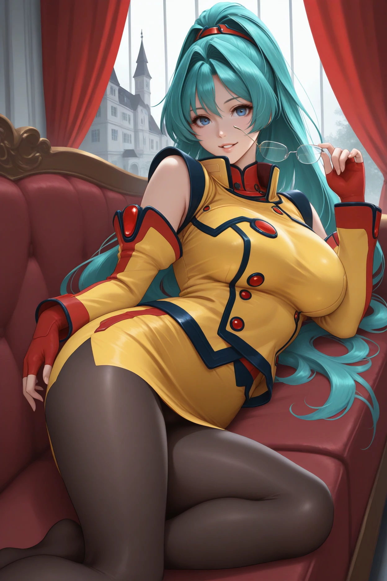 glasses, turtleneck, yellow uniform, sleeveless shirt, yellow skirt, red gloves, fingerless gloves, detached sleeves, black pantyhose